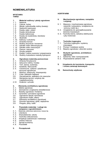 NOMENKLATURA WYSTAWA TARGI 1. 1. 1. 1. 2. 1. 3. 1. 4. 1. 5. 1. 6. 1. 7. 1. 8. 1. 9. 1. 10. 1. 11. 1. 12. 1. 13. 1. 14. 1. 15. 1. 16. 1. 17. 1. 18. 2. 2. 1. 2. 2. 2. 3. 2. 4. 2. 5. Materiał roślinny i płody ogrodowe Nasiona Cebule, bulwy Młode i półrozkwitłe rośliny (kwiaty) Sadzonki (warzywa) Kwiaty cięte i zieleń Kwiaty doniczkowe Kwiaty balkonowe Kwiaty do kwietników, klombów Skalniaki Kaktusy i sukulenty Drzewka bonsai Rośliny lecznicze i korzenne Szkółki roślin dekoracyjnych Szkółki roślin owocowych Owoce i warzywa Grzyby jadalne Kwiaty i rośliny suszone i preparowane Rośliny hodowlane metodą hydroponii 2.10 Ogrodowe materiały pomocnicze Artykuły florystyczne Sztuczne rośliny i kwiaty Torf, ziemia, substraty Kwietniki, flancowniki Ceramiczne, szklane i plastikowe naczynia ogrodnicze Nawozy, pestycydy, biopreparaty Folie i tekstylia nietkane Opryskiwacze, aplikatory do nawozów Narzędzia ręczne i artykuły dla majsterkowiczów Drabinki i schodki 3. 3. 1. 3. 2 3. 3. 3. 4. 3.5 3.6 3.7 3.8 3.9 Elementy architektury ogrodowej Meble ogrodowe Zewnętrzne urządzenia oświetleniowe Rzeźby ogrodowe i fontanny Ceramika i porcelana ogrodowa Ogrodowe daszki namiotowe Ogrodowe chatki, altany Elementy architektury ogrodowej Kominki ogrodowe, grille, wędzarnie Pergole, płoty, kafle 4. Pozostałe materiały i usługi nie związane z ogrodnictwem 4. 1. 4. 2. 4. 3. 4. 4. 4. 5. 4. 6. 4. 7. 4. 8. Materiały wiklinowe (plecione), kosze itp. 5. Poczęstunek 2. 6. 2. 7. 2.8 2.9. Literatura Wykształcenie, szkoły Technika obliczeniowa Projekcje sadownicze i realizacja OdzieŜ robocza Sprzęt kuchenny Pozostałe HORTIFARM 6. Mechanizacja ogrodowa, narzędzia i artykuły 6. 1. Maszyny i mechanizacja ogrodowa (siewniki, kultywatory, urządzenia do ochrony roślin itp.) 6. 2. Urządzenia do uporządkowywania terenów trawiastych 6. 3. Technika leśna, sekatory elektryczne i piły motorowe 7. 7. 1. 7. 2. 7. 3. 8. 8. 1. 8. 2. Technika irygacyjna Technika irygacyjna i systemy zraszające Pompy i instalacje wodne Baseny ogrodowe i zbiorniki wodne Budynki ogrodowe, architektura ogrodowa Szklarnie, folie i kompostowniki WyposaŜenie szklarni i folii 9. Urządzenia do karmienia, transportu i chowu zwierząt domowych 10. Samochody uŜytkowe