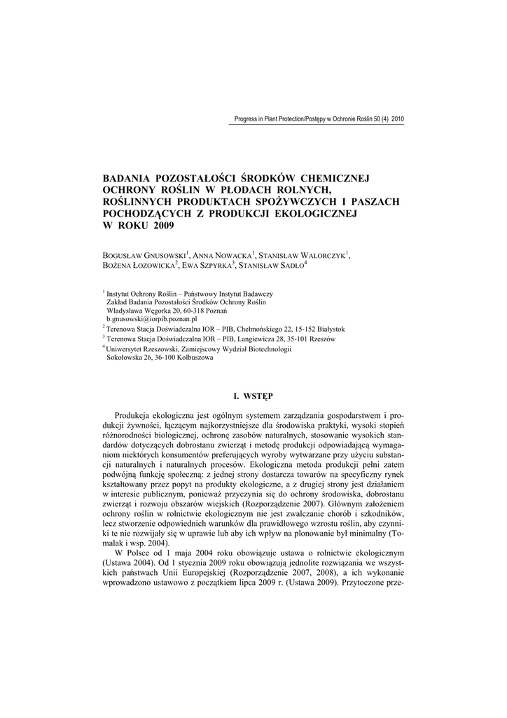 Progress in Plant Protection/Postępy w Ochronie Roślin 50 (4) 2010 BADANIA POZOSTAŁOŚCI ŚRODKÓW CHEMICZNEJ OCHRONY ROŚLIN W PŁODACH ROLNYCH, ROŚLINNYCH PRODUKTACH SPOŻYWCZYCH I PASZACH POCHODZĄCYCH Z PRODUKCJI EKOLOGICZNEJ W ROKU 2009 BOGUSŁAW GNUSOWSKI1, ANNA NOWACKA1, STANISŁAW WALORCZYK1, BOŻENA ŁOZOWICKA2, EWA SZPYRKA3, STANISŁAW SADŁO4 1 Instytut Ochrony Roślin – Państwowy Instytut Badawczy Zakład Badania Pozostałości Środków Ochrony Roślin Władysława Węgorka 20, 60-318 Poznań [email protected] 2 Terenowa Stacja Doświadczalna IOR – PIB, Chełmońskiego 22, 15-152 Białystok 3 Terenowa Stacja Doświadczalna IOR – PIB, Langiewicza 28, 35-101 Rzeszów 4 Uniwersytet Rzeszowski, Zamiejscowy Wydział Biotechnologii Sokołowska 26, 36-100 Kolbuszowa I. WSTĘP Produkcja ekologiczna jest ogólnym systemem zarządzania gospodarstwem i produkcji żywności, łączącym najkorzystniejsze dla środowiska praktyki, wysoki stopień różnorodności biologicznej, ochronę zasobów naturalnych, stosowanie wysokich standardów dotyczących dobrostanu zwierząt i metodę produkcji odpowiadającą wymaganiom niektórych konsumentów preferujących wyroby wytwarzane przy użyciu substancji naturalnych i naturalnych procesów. Ekologiczna metoda produkcji pełni zatem podwójną funkcję społeczną: z jednej strony dostarcza towarów na specyficzny rynek kształtowany przez popyt na produkty ekologiczne, a z drugiej strony jest działaniem w interesie publicznym, ponieważ przyczynia się do ochrony środowiska, dobrostanu zwierząt i rozwoju obszarów wiejskich (Rozporządzenie 2007). Głównym założeniem ochrony roślin w rolnictwie ekologicznym nie jest zwalczanie chorób i szkodników, lecz stworzenie odpowiednich warunków dla prawidłowego wzrostu roślin, aby czynniki te nie rozwijały się w uprawie lub aby ich wpływ na plonowanie był minimalny (Tomalak i wsp. 2004). W Polsce od 1 maja 2004 roku obowiązuje ustawa o rolnictwie ekologicznym (Ustawa 2004). Od 1 stycznia 2009 roku obowiązują jednolite rozwiązania we wszystkich państwach Unii Europejskiej (Rozporządzenie 2007, 2008), a ich wykonanie wprowadzono ustawowo z początkiem lipca 2009 r. (Ustawa 2009). Przytoczone prze- 1904 Progress in Plant Protection/Postępy w Ochronie Roślin 50 (4) 2010 pisy prawne precyzują między innymi listę substancji aktywnych (s.a.) dozwolonych środków ochrony roślin (ś.o.r.). Mimo, że uregulowania prawne nie zobowiązują do analitycznego określania jakości produktu finalnego, coraz powszechniejsze stają się badania żywności ekologicznej na pozostałości chemicznych ś.o.r. Wychodząc temu naprzeciw Minister Rolnictwa i Rozwoju Wsi od roku 2004 finansuje urzędowe badania produktów rolnych otrzymywanych metodami ekologicznymi wykonywane przez Instytut Ochrony Roślin – Państwowy Instytut Badawczy (IOR – PIB), który od 2006 r. prowadzi je w ramach Programu Wieloletniego „Ochrona roślin uprawnych z uwzględnieniem bezpieczeństwa żywności oraz ograniczenia strat w plonach i zagrożeń dla zdrowia ludzi, zwierząt domowych i środowiska”. II. MATERIAŁ I METODY Próbki do tych badań zostały pobrane przez urzędowych próbobiorców jednostek certyfikujących: – AGROBIOTEST Sp. z o.o., ul. Nowoursynowska 16, 02-787 Warszawa (77 próbek), – EKOGWARANCJA PTRE Sp. z o.o., ul. Irysowa 12/2, 20-834 Lublin (47 próbek), – CENTRUM JAKOŚCI Agro Eko Sp. z o.o., ul. Baśki 2, 05-126 Nieporęt (14 próbek), – Jednostka Certyfikacji Produkcji Ekologicznej PNG Sp. z o.o., Zajączków, 26-065 Piekoszów (9 próbek), – BIOEKSPERT Sp. z o.o. ul. Boya-Żeleńskiego 6 m 34, 00-621 Warszawa (7 próbek). Skontrolowano 154 próbki w 32 rodzajach próbek zebranych z miejsc produkcji ekologicznej (w nawiasach podano liczby pobranych próbek): – 7 próbek z upraw warzywniczych w gruncie – cukinia (1), fasola (1), ogórek (1), sałata (1), liście ogórka (3), – 1 próbka z upraw warzywniczych spod osłon – liście pomidora (1), – 69 próbek z upraw sadowniczych – truskawka (18), jabłko (10), porzeczka czarna (1), liście truskawki (9), liście maliny (16), liście porzeczki czarnej (5), liście porzeczki czerwonej (1), liście jabłoni (3), liście borówki (2), liście winorośli (1), liście aronii (2), porost z rzędów aronii (1), – 75 próbek z upraw rolniczych – pszenica (12), żyto (10), owies (11), pszenżyto (8), jęczmień (1), mieszanka zbożowa (14), mieszanka zbożowo-strączkowa (7), gryka (1), kukurydza (1), ziemniaki (6), liście kukurydzy (1), liście ziemniaków (1), łęty ziemniaków (1), siano (1), – 2 próbki z upraw zielarskich – szałwia (1), rumianek (1). Program badań był nieco zróżnicowany dla poszczególnych produktów. Ogółem oznaczono pozostałości 167 związków – 83 insektycydów, 61 fungicydów, 23 herbicydów. Pozostałości oznaczano w trzech laboratoriach IOR – PIB, w Białymstoku, Poznaniu i Rzeszowie, za pomocą zwalidowanych, głównie metod wieloskładnikowych, weryfikowanych poprzez uczestnictwo w międzynarodowych badaniach biegłości, organizowanych przez FAPAS1 oraz Unię Europejską2. Ilościowe oznaczenia pozostałości wy1 FAPAS – The Food Analysis Performance Assessment Scheme, CSL, York, Wielka Brytania European Commission’s Proficiency Tests on Pesticide Residues in Fruit and Vegetables in Spain as well as in Cereals and Feeding Stuff in Denmark 2 Pozostałości ś.o.r. w produkcji ekologicznej 1905 konywano za pomocą chromatografii gazowej (GC/ECD/NPD/MS, GC/MS/MS). W przypadku wykrycia pozostałości, uzyskany wynik potwierdzano na kolumnie chromatograficznej o innej polarności i/lub za pomocą innego detektora, np. masowego (Method 2007). Sumaryczne pozostałości ditiokarbaminianów, wyrażone jako CS2, oznaczano spektrofotometrycznie (Chmiel 1979). III. WYNIKI I ICH OMÓWIENIE W 6 próbkach (3,9%) spośród 154 analizowanych próbek płodów rolnych laboratoria