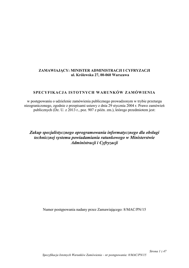 ZAMAWIAJĄCY: MINISTER ADMINISTRACJI I CYFRYZACJI ul. Królewska 27, 00-060 Warszawa S PE CY FI KACJA I S T O T NYCH WARUNKÓ W ZAMÓ WI E NIA w postępowaniu o udzielenie zamówienia publicznego prowadzonym w trybie przetargu nieograniczonego, zgodnie z przepisami ustawy z dnia 29 stycznia 2004 r. Prawo zamówień publicznych (Dz. U. z 2013 r., poz. 907 z późn. zm.), którego przedmiotem jest: Zakup specjalistycznego oprogramowania informatycznego dla obsługi technicznej systemu powiadamiania ratunkowego w Ministerstwie Administracji i Cyfryzacji Numer postępowania nadany przez Zamawiającego: 8/MAC/PN/15 Strona 1 z 47 Specyfikacja Istotnych Warunków Zamówienia – nr postępowania: 8/MAC/PN/15 DE FI NI CJE : Ilekroć w dalszej części Specyfikacji Istotnych Warunków Zamówienia jest mowa o: „postępowaniu” – należy przez to rozumieć postępowanie o udzielenie zamówienia publicznego prowadzone w trybie przetargu nieograniczonego, którego przedmiotem jest zakup specjalistycznego oprogramowania informatycznego dla obsługi technicznej powiadamiania ratunkowego w Ministerstwie Administracji i Cyfryzacji; „specyfikacji” lub „SIWZ” – należy przez to rozumieć niniejszą Specyfikację Istotnych Warunków Zamówienia wraz z załącznikami; „ustawie” – należy przez to rozumieć ustawę z dnia 29 stycznia 2004 r. - Prawo zamówień publicznych (Dz. U. z 2013 r., poz. 907 z późn. zm.); „Wykonawcy” – należy przez to rozumieć osobę fizyczną, osobę prawną albo jednostkę organizacyjną nieposiadającą osobowości prawnej, która ubiega się o udzielenie zamówienia, złożyła ofertę lub zawarła umowę w sprawie zamówienia; „Zamawiającym” – należy przez to rozumieć Ministra Administracji i Cyfryzacji. WPROWADZENIE 1. Postępowanie prowadzone jest na podstawie ustawy z dnia 29 stycznia 2004 r. - Prawo zamówień publicznych (Dz. U. z 2013 r. poz. 907 z późn. zm.), zwanej dalej „ustawą”. W zakresie nieuregulowanym poniżej stosuje się przepisy ustawy. 2. Treść oferty musi odpowiadać treści Specyfikacji Istotnych Warunków Zamówienia (SIWZ). 3. Postępowanie prowadzone jest w języku polskim. 4. Postępowanie oznaczone jest znakiem 8/MAC/PN/15. Wykonawcy winni we wszelkich kontaktach z Zamawiającym powoływać się na wyżej podane oznaczenie. I. INFORMACJE DODATKOWE 1. Zamawiający dopuszcza możliwości składania ofert częściowych: 1) Zadanie I – oprogramowanie specjalistyczne; 2) Zadanie II – oprogramowanie audytowe i zarządcze. 2. Zamawiający nie dopuszcza składania ofert wariantowych. 3. Zamawiający dopuszcza udział podwykonawców. W takim wypadku Wykonawca ma obowiązek (zgodnie z art. 36b ust. 1 ustawy) zawrzeć w ofercie (w Formularzu oferty stanowiącym załącznik nr 1 do SIWZ) informacje dotyczące podwykonawstwa. Brak powyższej informacji w ofercie oznaczać będzie, że Wykonawca nie będzie korzystał z podwykonawstwa przy realizacji zamówienia. 4. Zamawiający nie przewiduje możliwości udzielenia zamówień uzupełniających na podstawie art. 67 ust. 1 pkt 6 ustawy. 5. Postępowanie nie jest prowadzone w celu zawarcia umowy ramowej. 6. Zamawiający dopuszcza porozumiewanie się drogą elektroniczną na adres e-mail wskazany w rozdziale VIII SIWZ. 7. Zamawiający nie przewiduje dokonania wyboru najkorzystniejszej oferty z zastosowaniem aukcji elektronicznej, na zasadach określonych w art. 91a – 91c ustawy. 8. Rozliczenia między Zamawiającym a Wykonawcą będą prowadzone w PLN. Zamawiający nie przewiduje rozliczenia w walutach obcych. 9. Zgodnie z art. 144 ustawy, Zamawiający przewiduje możliwość dokonania zmian Umowy w przypadkach określonych w Istotnych postanowieniach umowy, stanowiących załącznik nr 5 do SIWZ. II. NAZWA ORAZ ADRES ZAMAWIAJĄCEGO Zamawiający: Minister Administracji i Cyfryzacji. Adres: Ministerstwo Administracji i Cyfryzacji, ul. Królewska 27, 00-060 Warszawa. Strona 2 z 47 Specyfikacja Istotnych Warunków Zamówienia – nr postępowania: 8/MAC/PN/15 III. TRYB UDZIELENIA ZAMÓWIENIA Postępowanie prowadzone jest w trybie przetargu nieograniczonego. IV. OPIS PRZEDMIOTU ZAMÓWIENIA 1. Przedmiotem zamówienia jest zakup specjalistycznego oprogramowania informatycznego dla obsługi technicznej powiadamiania ratunkowego w Ministerstwie Administracji i Cyfryzacji: 1) Zadanie I – oprogramowanie specjalistyczne; 2) Zadanie II – oprogramowanie audytowe i zarządcze, zgodnie ze Szczegółowym opisem przedmiotu zamówienia, stanowiącym załącznik nr 6 do SIWZ, oraz na warunkach określonych w Istotnych postanowieniach umowy, stanowiących załącznik nr 5 do SIWZ. 2. Przedmiot zamówienia określony został we Wspólnym Słowniku Zamówień następującym kodem i nazwą: 48517000-5 pakiety oprogramowania informatycznego. V. TERMIN WYKONANIA ZAMÓWIENIA Termin realizacji przedmiotu zamówienia wskazany w ofercie Wykonawcy, jednak nie później niż 45 dni od zawarcia umowy. VI. OPIS WARUNKÓW UDZIAŁU W POSTĘPOWANIU ORAZ OPIS SPOSOBU DOKONYWANIA OCENY SPEŁNIANIA TYCH WARUNKÓW O udzielenie zamówienia mogą ubiegać się Wykonawcy spełniający warunki wynikające z art. 22 ust. 1 ustawy i w stosunku do których brak jest podstaw do wykluczenia z powodu nie spełniania warunków, o których mowa w art. 24 ust. 1 ustawy. 1. Opis sposobu dokonania oceny warunków wynikających z art. 22 ust. 1 ustawy: 1.1. w zakresie warunku posiadania uprawnień do wykonywania określonej działalności lub czynności, jeżeli przepisy prawa nakładają obowiązek ich posiadania” nie zamieszcza opisu sposobu dokonania jego spełniania; 1.2. w zakresie warunku posiadania wiedzy i doświadczenia Zamawiający uzna warunek za spełniony, jeżeli Wykonawca wykaże się należytym wykonaniem, a w przypadku świadczeń okresowych lub ciągłych również wykonywaniem, w okresie ostatnich 3 lat przed upływem terminu składania ofert, a jeżeli okres prowadzenia działalności jest króts