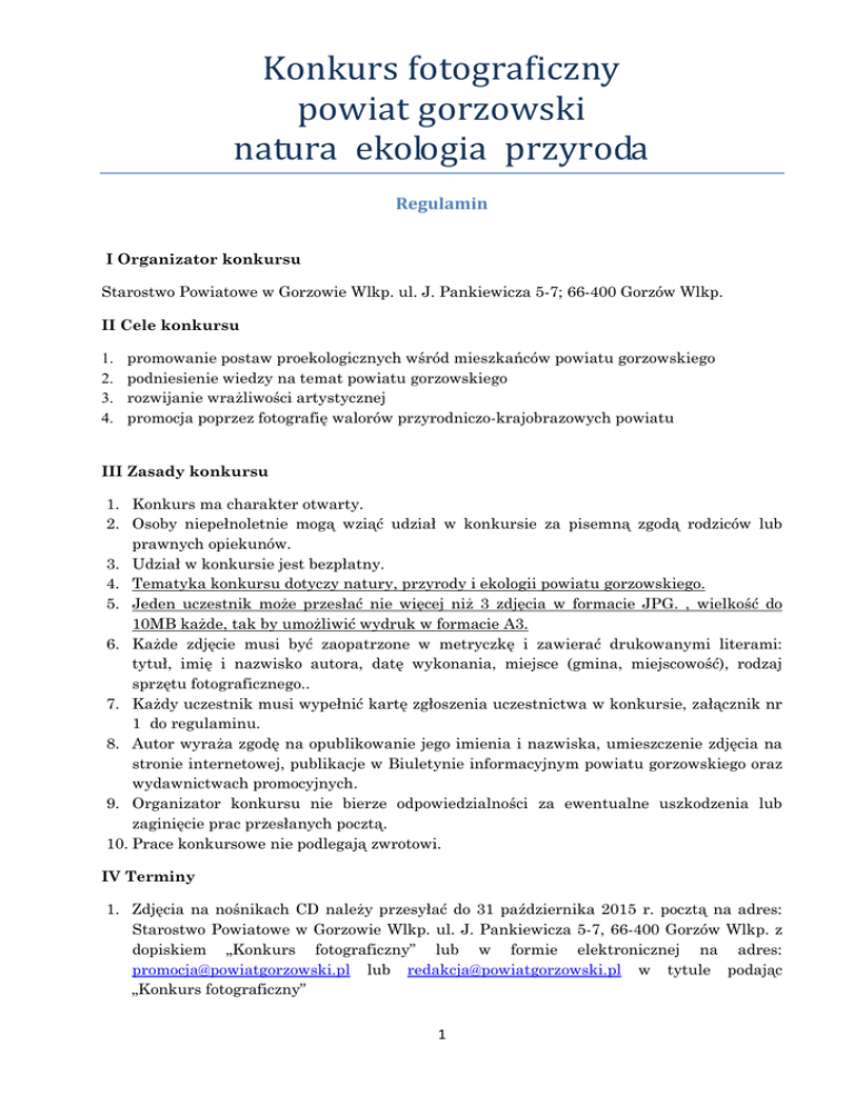 Konkurs fotograficzny powiat gorzowski natura ekologia przyroda Regulamin I Organizator konkursu Starostwo Powiatowe w Gorzowie Wlkp. ul. J. Pankiewicza 5-7; 66-400 Gorzów Wlkp. II Cele konkursu 1. 2. 3. 4. promowanie postaw proekologicznych wśród mieszkańców powiatu gorzowskiego podniesienie wiedzy na temat powiatu gorzowskiego rozwijanie wrażliwości artystycznej promocja poprzez fotografię walorów przyrodniczo-krajobrazowych powiatu III Zasady konkursu 1. Konkurs ma charakter otwarty. 2. Osoby niepełnoletnie mogą wziąć udział w konkursie za pisemną zgodą rodziców lub prawnych opiekunów. 3. Udział w konkursie jest bezpłatny. 4. Tematyka konkursu dotyczy natury, przyrody i ekologii powiatu gorzowskiego. 5. Jeden uczestnik może przesłać nie więcej niż 3 zdjęcia w formacie JPG. , wielkość do 10MB każde, tak by umożliwić wydruk w formacie A3. 6. Każde zdjęcie musi być zaopatrzone w metryczkę i zawierać drukowanymi literami: tytuł, imię i nazwisko autora, datę wykonania, miejsce (gmina, miejscowość), rodzaj sprzętu fotograficznego.. 7. Każdy uczestnik musi wypełnić kartę zgłoszenia uczestnictwa w konkursie, załącznik nr 1 do regulaminu. 8. Autor wyraża zgodę na opublikowanie jego imienia i nazwiska, umieszczenie zdjęcia na stronie internetowej, publikacje w Biuletynie informacyjnym powiatu gorzowskiego oraz wydawnictwach promocyjnych. 9. Organizator konkursu nie bierze odpowiedzialności za ewentualne uszkodzenia lub zaginięcie prac przesłanych pocztą. 10. Prace konkursowe nie podlegają zwrotowi. IV Terminy 1. Zdjęcia na nośnikach CD należy przesyłać do 31 października 2015 r. pocztą na adres: Starostwo Powiatowe w Gorzowie Wlkp. ul. J. Pankiewicza 5-7, 66-400 Gorzów Wlkp. z dopiskiem „Konkurs fotograficzny” lub w formie elektronicznej na adres: [email protected] lub [email protected] w tytule podając „Konkurs fotograficzny” 1 2. Wyniki zostaną zamieszczone na stronie internetowej www.powiatgorzowski.pl listopada 2015 r. do 30 V Ocena prac 1. Ocenie zostaną poddane wyłącznie prace spełniające warunki regulaminu. 2. Do oceny złożonych prac konkursowych zostanie powołane jury, które zbierze się do 20 listopada 2015 r. oceni i wybierze najlepsze prace. 3. Ogłoszenie wyników nastąpi 30 listopada 2015 poprzez zamieszczenie na stronie internetowej www.powiatgorzowski.pl. 4. Laureaci prac zostaną powiadomienie droga e-mailową lub telefonicznie w dniu rozstrzygnięcia konkursu. Wiadomość zostanie przekazana na adres mailowy lub numer telefonu podany w karcie zgłoszenia. W przypadku braku danych kontaktowych jury ma prawo odrzucić pracę z konkursu. 5. Ocena prac odbędzie się na podstawie karty oceny, załącznik nr 2 do regulaminu. Komisja weźmie pod uwagę: zgodność z tematem walory artystyczne oryginalność ujęcia techniczna jakość zdjęcia odpowiedniość tytułu W ramach każdego kryterium jurorzy przyznają od 0 do 10 punktów. 6. Decyzje i ustalenia jury są ostateczne. VI Nagrody 1. Organizator przyznaje nagrody w postaci bonów pieniężnych do zrealizowania w jednym ze sklepów fotograficznych o ogólnej wartości 5100,00 złotych. 2. Przewidziane są następujące nagrody: I Miejsce – bon o wartości 1500,00 złotych do zrealizowania w jednym ze sklepów fotograficznych. II Miejsce - bon o wartości 1000,00 złotych do zrealizowania w jednym ze sklepów fotograficznych. III Miejsce – bon o wartości 500,00 złotych do zrealizowania w jednym ze sklepów fotograficznych. 7 równorzędnych wyróżnień - bon o wartości 300,00 złotych do zrealizowania w jednym ze sklepów fotograficznych. 3. Organizator zastrzega sobie możliwości zmiany podziału nagród. VII Odpowiedzialność organizatora konkursu 1. Organizator nie ponosi odpowiedzialności za nie otrzymanie lub opóźnione otrzymanie od Uczestnika formularza z przyczyn od niego niezależnych, w szczególności z przyczyn leżących po stronie administratora serwera. 2 2. Organizator nie ponosi odpowiedzialności za nieprzestrzeganie przez uczestników postanowień niniejszego Regulaminu, w szczególności jeżeli treść zgłoszenia będzie sprzeczna z prawem, będzie naruszać prawa osób trzecich, będzie sprzeczna z dobrymi obyczajami albo będzie opisywać sytuacje lub zdarzenia, które mogą powodować zagrożenie dla zdrowia lub życia i ludzi zwierząt. Organizator zastrzega sobie prawo do dochodzenia roszczeń z tytułu wszelkich szkód poniesionych przez Organizatora w związku z niespełnieniem przez danego Użytkownika wymogów określonych w zdaniu poprzednim. 3. Organizator nie ponosi odpowiedzialności za niemożność odbioru nagrody z przyczyn leżących po stronie Uczestnika Konkursu. 4. Organizator nie ponosi odpowiedzialności za opóźnienia lub jakiekolwiek przeszkody w komunikacji z Uczestnikami wynikające z przyczyn niezależnych od niego. VIII Postanowienia końcowe 1. Przesyłając zgłoszenie do konkursu, uczestnik potwierdza, że akceptuje niniejszy regulamin i warunki uczestnictwa w konkursie. 2. Uczestnik konkursu poprzez udział w konkursie wyraża zgodę na przetwarzanie jego danych osobowych w celu związanym z realizacją Konkursu i celach marketingowych Organizatora – zgodnie z ustawą z dnia 29 sierpnia 1997 r. o ochronie danych osobowych (Dz. U. z 2002 r. Nr 101, poz. 926 z późn. zm.). 3. Uczestnik, zgłaszając się do konkursu, oświadcza, iż przysługują mu wyłączne i nieograniczone prawa autorskie do nadesłanych fotografii. 4. Ponadto oświadcza, że wyraża zgodę na wielokrotne, nieodpłatne publikowanie nagrodzonych fotografii oraz opublikowanie jego imienia, nazwiska oraz miejscowości zamieszkania w materiałach związanych z konkursem, w wydawnictwach oraz na stronie internetowej organizatora, 5. Uczestnik zgłaszając się do konkursu wyraża zgodę na wykorzystywanie zdjęć w celach promocyjnych i marketingowych, w szczególności na utrwalanie, modyfikowanie i zwielokrotni