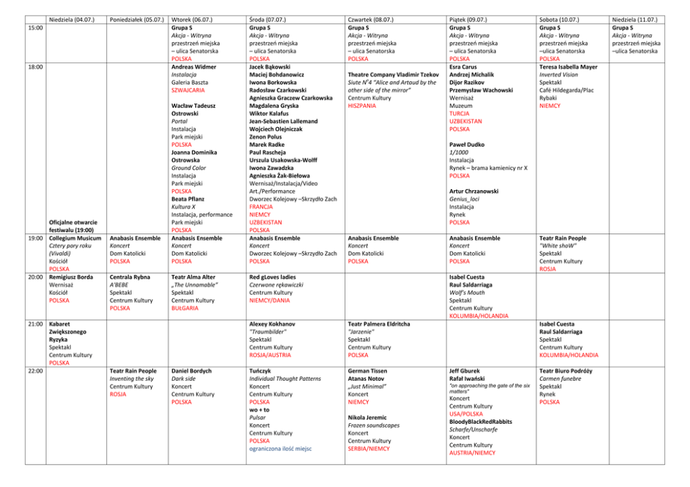Niedziela (04.07.) Poniedziałek (05.07.) 15:00 18:00 Oficjalne otwarcie festiwalu (19:00) 19:00 Collegium Musicum Cztery pory roku (Vivaldi) Kościół POLSKA 20:00 Remigiusz Borda Wernisaż Kościół POLSKA 21:00 Kabaret Zwiększonego Ryzyka Spektakl Centrum Kultury POLSKA 22:00 Wtorek (06.07.) Grupa S Akcja - Witryna przestrzeo miejska – ulica Senatorska POLSKA Andreas Widmer Instalacja Galeria Baszta SZWAJCARIA Anabasis Ensemble Koncert Dom Katolicki POLSKA Wacław Tadeusz Ostrowski Portal Instalacja Park miejski POLSKA Joanna Dominika Ostrowska Ground Color Instalacja Park miejski POLSKA Beata Pflanz Kultura X Instalacja, performance Park miejski POLSKA Anabasis Ensemble Koncert Dom Katolicki POLSKA Centrala Rybna A'BEBE Spektakl Centrum Kultury POLSKA Teatr Alma Alter „The Unnamable” Spektakl Centrum Kultury BUŁGARIA Teatr Rain People Inventing the sky Centrum Kultury ROSJA Daniel Bordych Dark side Koncert Centrum Kultury POLSKA Środa (07.07.) Grupa S Akcja - Witryna przestrzeo miejska – ulica Senatorska POLSKA Jacek Bąkowski Maciej Bohdanowicz Iwona Borkowska Radosław Czarkowski Agnieszka Graczew Czarkowska Magdalena Gryska Wiktor Kalafus Jean-Sebastien Lallemand Wojciech Olejniczak Zenon Polus Marek Radke Paul Rascheja Urszula Usakowska-Wolff Iwona Zawadzka Agnieszka Żak-Biełowa Wernisaż/Instalacja/Video Art./Performance Dworzec Kolejowy –Skrzydło Zach FRANCJA NIEMCY UZBEKISTAN POLSKA Anabasis Ensemble Koncert Dworzec Kolejowy –Skrzydło Zach POLSKA Czwartek (08.07.) Grupa S Akcja - Witryna przestrzeo miejska – ulica Senatorska POLSKA Theatre Company Vladimir Tzekov Siute No4 “Alice and Artaud by the other side of the mirror” Centrum Kultury HISZPANIA Piątek (09.07.) Grupa S Akcja - Witryna przestrzeo miejska – ulica Senatorska POLSKA Esra Carus Andrzej Michalik Dijor Razikov Przemysław Wachowski Wernisaż Muzeum TURCJA UZBEKISTAN POLSKA Sobota (10.07.) Grupa S Akcja - Witryna przestrzeo miejska –ulica Senatorska POLSKA Teresa Isabella Mayer Inverted Vision Spektakl Café Hildegarda/Plac Rybaki NIEMCY Paweł Dudko 1/1000 Instalacja Rynek – brama kamienicy nr X POLSKA Artur Chrzanowski Genius_loci Instalacja Rynek POLSKA Anabasis Ensemble Koncert Dom Katolicki POLSKA Red gLoves ladies Czerwone rękawiczki Centrum Kultury NIEMCY/DANIA Anabasis Ensemble Koncert Dom Katolicki POLSKA Teatr Rain People "White shoW" Spektakl Centrum Kultury ROSJA Isabel Cuesta Raul Saldarriaga Wolf’s Mouth Spektakl Centrum Kultury KOLUMBIA/HOLANDIA Alexey Kokhanov "Traumbilder" Spektakl Centrum Kultury ROSJA/AUSTRIA Teatr Palmera Eldritcha "Jarzenie" Spektakl Centrum Kultury POLSKA Tuoczyk Individual Thought Patterns Koncert Centrum Kultury POLSKA wo + to Pulsar Koncert Centrum Kultury POLSKA ograniczona ilość miejsc German Tissen Atanas Notov „Just Minimal” Koncert NIEMCY Nikola Jeremic Frozen soundscapes Koncert Centrum Kultury SERBIA/NIEMCY Isabel Cuesta Raul Saldarriaga Spektakl Centrum Kultury KOLUMBIA/HOLANDIA Jeff Gburek Rafał Iwaoski "on approaching the gate of the six matters" Koncert Centrum Kultury USA/POLSKA BloodyBlackRedRabbits Scharfe/Unscharfe Koncert Centrum Kultury AUSTRIA/NIEMCY Teatr Biuro Podróży Carmen funebre Spektakl Rynek POLSKA Niedziela (11.07.) Grupa S Akcja - Witryna przestrzeo miejska –ulica Senatorska