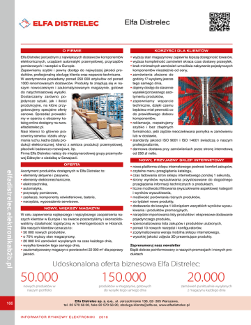 Elfa Distrelec O FIRMIE KORZYŚCI DLA KLIENTÓW Elfa Distrelec jest jednym z największych dostawców komponentów elektronicznych, urządzeń automatyki przemysłowej, przyrządów pomiarowych i narzędzi w Europie. Zapewniamy szybki i pewny dostęp do najwyższej jakości produktów, profesjonalną obsługę klienta oraz wsparcie techniczne. W asortymencie posiadamy ponad 250 000 artykułów od ponad 1000 renomowanych dostawców. Produkty te znajdują się w naszym nowoczesnym i zautomatyzowanym magazynie, gotowe do natychmiastowej wysyłki. Dostarczamy zarówno pojedyncze sztuki, jak i ilości produkcyjne, na które przygotowujemy specjalne oferty cenowe. Sprzedaż prowadzimy w oparciu o obszerny katalog online dostępny na www. elfadistrelec.pl. Nasi klienci to głównie pracownicy serwisu i działu utrzymania ruchu, kadra działu produkcji elektronicznej, klienci z sektora produkcji przemysłowej, placówki badawczo-rozwojowe, itp. Firma Elfa Distrelec należy do międzynarodowej grupy przemysłowej Dätwyler z siedzibą w Szwajcarii. wyższy stan magazynowy zapewnia lepszą dostępność towarów, wyższa kompletność zamówień skraca czas dostawy przesyłek, brak minimalnych zamówień umożliwia nabywanie pojedynczych komponentów niezależnie od ceny, zamówienia złożone do godziny 17 wysyłamy jeszcze tego samego dnia, dajemy dostęp do starannie wyselekcjonowanego asortymentu produktów, zapewniamy wsparcie techniczne, dzięki czemu będziesz miał pewność co do prawidłowego doboru komponentów, reklamacje, rozpatrujemy szybko i bez zbędnych formalności, jeśli zajdzie nieoczekiwana pomyłka w zamówieniu lub w dostawie, standardy jakości ISO 9001 i ISO 14001 świadczą o naszym profesjonalizmie, darmowa dostawa przy zamówieniach przez stronę internetową od 250 zł netto. OFERTA elfadistrelec.elektronikab2b.pl Asortyment produktów dostępnych w Elfa Distrelec to: elementy aktywne i pasywne, elementy elektromechaniczne, elektrotechnika, automatyka, przyrządy pomiarowe, zasilacze, komponenty oświetleniowe, baterie, narzędzia, wyposażenie serwisowe. NOWY, WIĘKSZY MAGAZYN W celu zapewnienia najlepszego i najszybszego zaopatrzenia naszych klientów w Europie i na świecie poszerzyliśmy i skonsolidowaliśmy działalność logistyczną w ‘s-Hertogenbosch w Holandii. Dla naszych klientów oznacza to: 50 000 nowych produktów, o 70% wyższy stan magazynowy, 20 000 linii zamówień wysyłanych na czas każdego dnia, wysyłka towarów tego samego dnia, zautomatyzowany magazyn o powierzchni 22 000 m2 dla poprawy jakości. nowa platforma sklepu internetowego podnosi komfort zakupów, czytelne menu przeglądania katalogu, czas ładowania stron sklepu internetowego poniżej 1 sekundy, strony wyników wyszukiwania przystosowane do dogodnego przeglądania informacji technicznych o produktach, liczne możliwości filtrowania (wyszukiwanie aspektowe) kategorii i wyników wyszukiwania, możliwość porównania różnych produktów, co tydzień nowe produkty, dodawanie do koszyka 1 kliknięciem wszystkich wyników wyszukiwania i produktów promocyjnych, narzędzie importowania listy produktów i ekspresowe dodawanie pojedynczego produktu, spersonalizowana lista zakupów i produktów ulubionych, ponad 10 nowych narzędzi i konfiguratorów, zoptymalizowana wersja mobilna sklepu internetowego, wysokiej jakości zdjęcia 3D prezentujące produkty. Zaprenumeruj nasz newsletter Bądź dobrze poinformowany o naszych promocjach i nowych produktach Udoskonalona oferta biznesowa Elfa Distrelec: 50.000 150.000 nowych produktów w naszym portfolio 166 NOWY, PRZYJAZNY SKLEP INTERNETOWY produktów w magazynie, gotowych do wysyłki tego samego dnia 20.000 zamówień punktualnie wysyłanych z magazynu każdego dnia Elfa Distrelec sp. z. o.o., al. Jerozolimskie 136, 02- 305 Warszawa, tel. 22 570 56 00, faks 22 570 56 20, [email protected], www.elfadistrelec.pl I N F O R M AT O R R Y N KO W Y E L E K T R O N I K I 2016