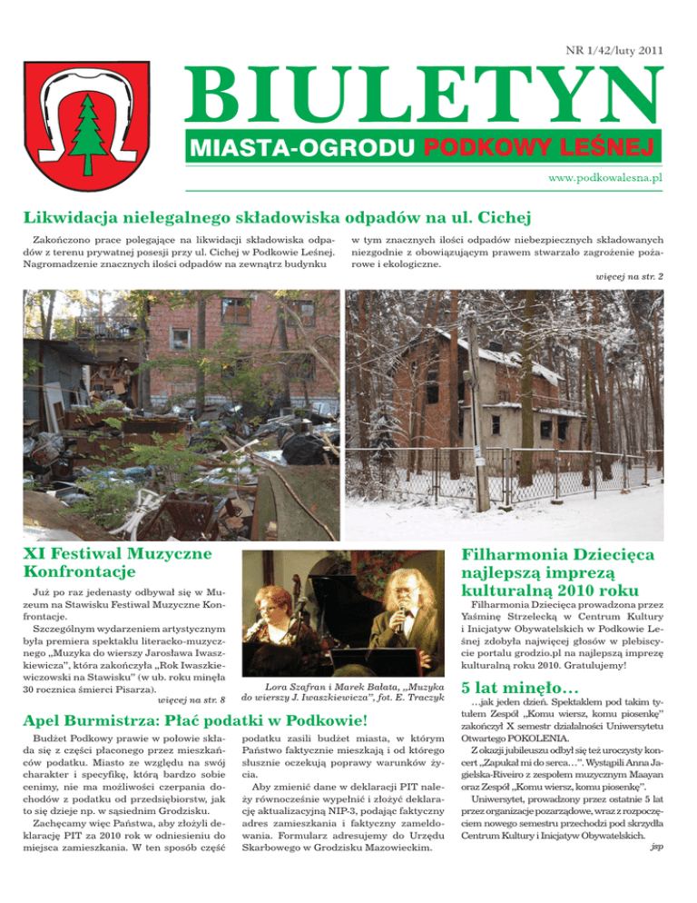 NR 1/42/luty 2011 Likwidacja nielegalnego składowiska odpadów na ul. Cichej Zakończono prace polegające na likwidacji składowiska odpadów z terenu prywatnej posesji przy ul. Cichej w Podkowie Leśnej. Nagromadzenie znacznych ilości odpadów na zewnątrz budynku w tym znacznych ilości odpadów niebezpiecznych składowanych niezgodnie z obowiązującym prawem stwarzało zagrożenie pożarowe i ekologiczne. więcej na str. 2 XI Festiwal Muzyczne Konfrontacje Już po raz jedenasty odbywał się w Muzeum na Stawisku Festiwal Muzyczne Konfrontacje. Szczególnym wydarzeniem artystycznym była premiera spektaklu literacko-muzycznego „Muzyka do wierszy Jarosława Iwaszkiewicza”, która zakończyła „Rok Iwaszkiewiczowski na Stawisku” (w ub. roku minęła 30 rocznica śmierci Pisarza). więcej na str. 8 Filharmonia Dziecięca najlepszą imprezą kulturalną 2010 roku Filharmonia Dziecięca prowadzona przez Yaśminę Strzelecką w Centrum Kultury i Inicjatyw Obywatelskich w Podkowie Leśnej zdobyła najwięcej głosów w plebiscycie portalu grodzio.pl na najlepszą imprezę kulturalną roku 2010. Gratulujemy! Lora Szafran i Marek Bałata, „Muzyka do wierszy J. Iwaszkiewicza”, fot. E. Traczyk Apel Burmistrza: Płać podatki w Podkowie! Budżet Podkowy prawie w połowie składa się z części płaconego przez mieszkańców podatku. Miasto ze względu na swój charakter i specyfikę, którą bardzo sobie cenimy, nie ma możliwości czerpania dochodów z podatku od przedsiębiorstw, jak to się dzieje np. w sąsiednim Grodzisku. Zachęcamy więc Państwa, aby złożyli deklarację PIT za 2010 rok w odniesieniu do miejsca zamieszkania. W ten sposób część podatku zasili budżet miasta, w którym Państwo faktycznie mieszkają i od którego słusznie oczekują poprawy warunków życia. Aby zmienić dane w deklaracji PIT należy równocześnie wypełnić i złożyć deklarację aktualizacyjną NIP-3, podając faktyczny adres zamieszkania i faktyczny zameldowania. Formularz adresujemy do Urzędu Skarbowego w Grodzisku Mazowieckim. www.podkowalesna.pl 5 lat minęło… …jak jeden dzień. Spektaklem pod takim tytułem Zespół „Komu wiersz, komu piosenkę” zakończył X semestr działalności Uniwersytetu Otwartego POKOLENIA. Z okazji jubileuszu odbył się też uroczysty koncert „Zapukał mi do serca…”. Wystąpili Anna Jagielska-Riveiro z zespołem muzycznym Maayan oraz Zespół „Komu wiersz, komu piosenkę”. Uniwersytet, prowadzony przez ostatnie 5 lat przez organizacje pozarządowe, wraz z rozpoczęciem nowego semestru przechodzi pod skrzydła Centrum Kultury i Inicjatyw Obywatelskich. jsp 1 Wieści z Urzędu Podkowa będzie miejscem, w którym chce się mieszkać – rozmowa z Małgorzatą Stępień-Przygodą, Burmistrzem Miasta Dwa miesiące temu mieszkańcy Podkowy Leśnej wybrali Panią na burmistrza miasta. Cieszę się, że to mnie mieszkańcy obdarzyli zaufaniem. Bardzo dziękuję wszystkim, którzy oddali na mnie głos. Liczę także na dobrą współpracę z mieszkańcami, którzy popierali moich konkurentów. Co Panią skłoniło do ubiegania się o ten urząd? Podjęłam wyzwanie, ponieważ lubię Podkowę zawodowo i prywatnie, jestem z nią związana od kilku lat. Zaczynałam pracę w urzędzie na stanowisku inspektora, później byłam kierownikiem Referatu Planowania i Rozwoju Miasta, przez ostatnie dwa lata pełniłam funkcję zastępcy burmistrza. Poznałam miasto, jego charakter, mieszkańców, problemy i potrzeby. Dodatkowo zmobilizowała mnie obietnica mieszkańców, organizacji pozarządowych, że mogę liczyć na ich pomoc. Również ustępujący burmistrz Andrzej Kościelny zgodził się, żeby przez pół roku służyć swoją wiedzą i doświadczeniem. Zo- stał zatrudniony w urzędzie na pół etatu jako doradca. Jak Pani zdaniem będzie się układała współpraca na linii burmistrz – rada miasta? Dopiero zaczynamy, łatwo nie jest. Obecnie pracujemy nad uchwałą budżetową, a więc często bywam na posiedzeniach komisji rady. Wierzę, że wielogodzinne dyskusje nad finansami miasta pokażą, że dobra współpraca rady i burmistrza jest konieczna. Jakie są plany inwestycyjne miasta na najbliższy rok? Przede wszystkim zakończenie bieżących inwestycji. Jesienią zakończy się największa z nich: rozbudowa szkoły samorządowej i budowa sali sportowej. Powstaje dom komunalny przy ul. Jaskółczej. W planach mamy budowę Systemu Informacji Miejskiej. Został złożony wniosek o dofinansowanie tego projektu. Problemem, który także wymaga rozwiązania jest odprowadzanie nadmiaru wód z terenu miasta. W zależności od wielkości środków finansowych dostępnych w budżecie będziemy remontować drogi. Najważniejszym działaniem jest jednak zwiększanie wpływów do budżetu miasta. Zachęcamy do płacenia podatków w miejscu zamieszkania, prowadzimy postępowania w sprawie zasiedzenia kilku działek, będziemy ogłaszać przetargi na dzierżawę nieruchomości i egzekwować zaległości wobec miasta. Jaka będzie Podkowa Leśna zarządzana przez Panią? Decyzje dotyczące rozwoju miasta chciałabym podejmować w konsultacji z mieszkańcami. Miasto powinno rozwijać się w sposób zrównoważony. Ważna jest nowoczesna infrastruktura, dbałość o środowisko naturalne i dziedzictwo kulturowe. W moim przekonaniu również bogata oferta edukacyjna, kulturalna i sportowa spowoduje, że Podkowa będzie miejscem, w którym chce się mieszkać. rozmawiała Joanna Snarska-Pasternak Księgarnia wróci do Podkowy Podkowa Leśna na antenie Radia Bogoria Można polubić Urząd … Referat Planowania i Rozwoju Miasta przygotowuje przetarg na wynajem lokalu z przeznaczeniem na działalność księgarską. 16 grudnia 2010 roku została podpisana umowa kupna-sprzedaży między miastem Podkowa Leśna a firmą Bookhousecafe, na mocy której lokal, w którym obecnie znajduje się kwiaciarnia, przeszedł na własność miasta. jsp Każdy czwarty wto