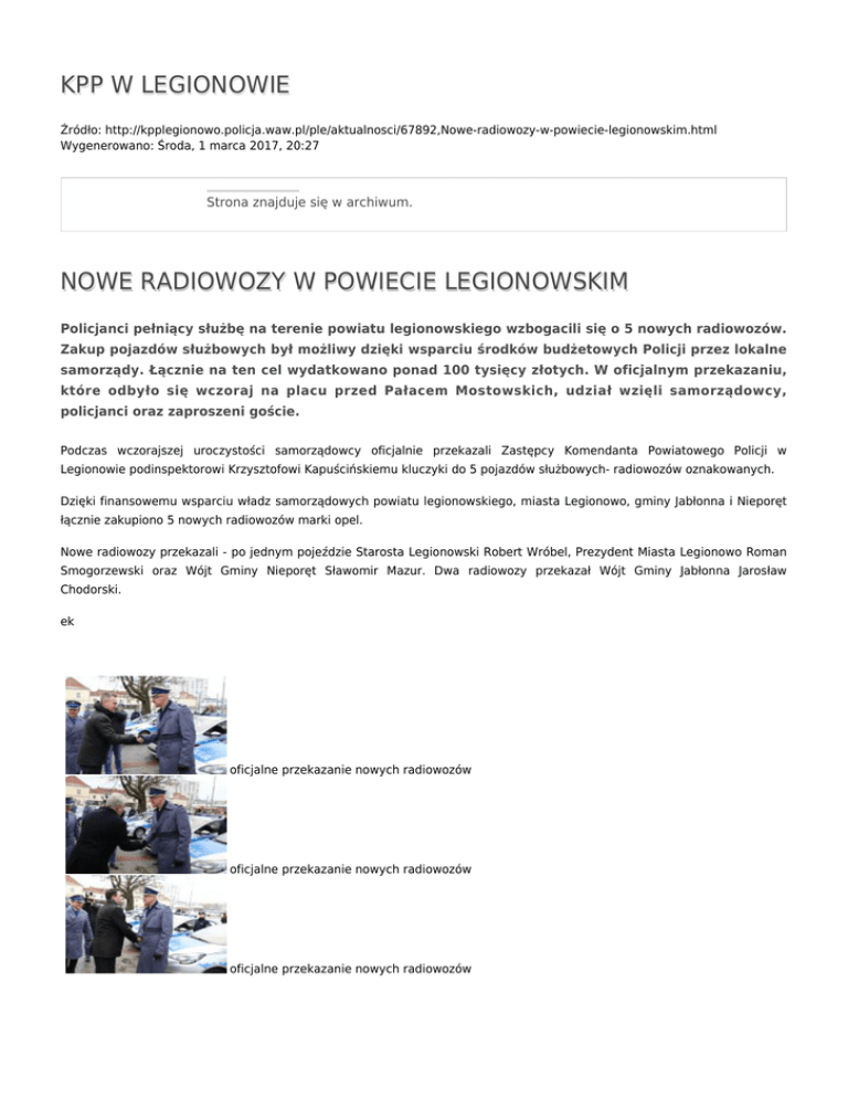 KPP W LEGIONOWIE Źródło: http://kpplegionowo.policja.waw.pl/ple/aktualnosci/67892,Nowe-radiowozy-w-powiecie-legionowskim.html Wygenerowano: Środa, 1 marca 2017, 20:27 Strona znajduje się w archiwum. NOWE RADIOWOZY W POWIECIE LEGIONOWSKIM Policjanci pełniący służbę na terenie powiatu legionowskiego wzbogacili się o 5 nowych radiowozów. Zakup pojazdów służbowych był możliwy dzięki wsparciu środków budżetowych Policji przez lokalne samorządy. Łącznie na ten cel wydatkowano ponad 100 tysięcy złotych. W oficjalnym przekazaniu, które odbyło się wczoraj na placu przed Pałacem Mostowskich, udział wzięli samorządowcy, policjanci oraz zaproszeni goście. Podczas wczorajszej uroczystości samorządowcy oficjalnie przekazali Zastępcy Komendanta Powiatowego Policji w Legionowie podinspektorowi Krzysztofowi Kapuścińskiemu kluczyki do 5 pojazdów służbowych- radiowozów oznakowanych. Dzięki finansowemu wsparciu władz samorządowych powiatu legionowskiego, miasta Legionowo, gminy Jabłonna i Nieporęt łącznie zakupiono 5 nowych radiowozów marki opel. Nowe radiowozy przekazali - po jednym pojeździe Starosta Legionowski Robert Wróbel, Prezydent Miasta Legionowo Roman Smogorzewski oraz Wójt Gminy Nieporęt Sławomir Mazur. Dwa radiowozy przekazał Wójt Gminy Jabłonna Jarosław Chodorski. ek oficjalne przekazanie nowych radiowozów oficjalne przekazanie nowych radiowozów oficjalne przekazanie nowych radiowozów oficjalne przekazanie nowych radiowozów Ocena: 0/5 (0) Tweetnij