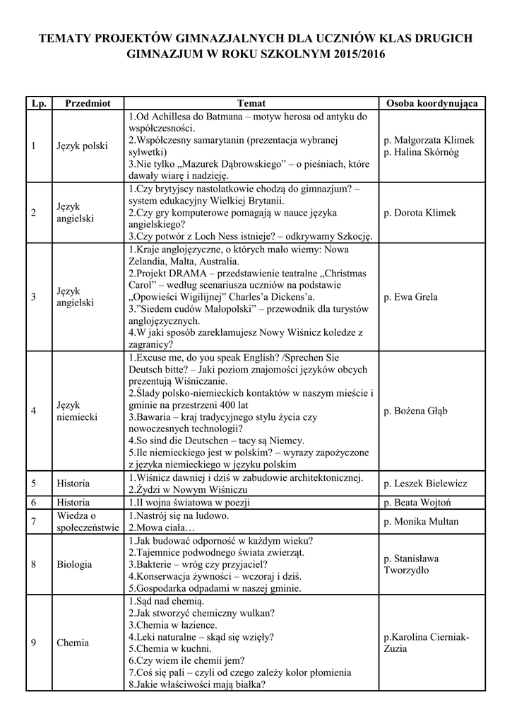TEMATY PROJEKTÓW GIMNAZJALNYCH DLA UCZNIÓW KLAS