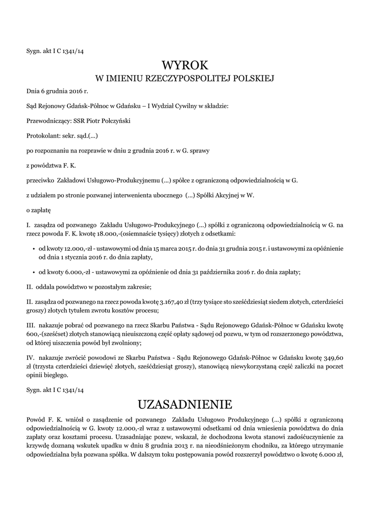 Sygn. akt I C 1341/14 WYROK W IMIENIU RZECZYPOSPOLITEJ POLSKIEJ Dnia 6 grudnia 2016 r. Sąd Rejonowy Gdańsk-Północ w Gdańsku – I Wydział Cywilny w składzie: Przewodniczący: SSR Piotr Połczyński Protokolant: sekr. sąd.(...) po rozpoznaniu na rozprawie w dniu 2 grudnia 2016 r. w G. sprawy z powództwa F. K. przeciwko Zakładowi Usługowo-Produkcyjnemu (...) spółce z ograniczoną odpowiedzialnością w G. z udziałem po stronie pozwanej interwenienta ubocznego (...) Spółki Akcyjnej w W. o zapłatę I. zasądza od pozwanego Zakładu Usługowo-Produkcyjnego (...) spółki z ograniczoną odpowiedzialnością w G. na rzecz powoda F. K. kwotę 18.000,-(osiemnaście tysięcy) złotych z odsetkami: • od kwoty 12.000,-zł - ustawowymi od dnia 15 marca 2015 r. do dnia 31 grudnia 2015 r. i ustawowymi za opóźnienie od dnia 1 stycznia 2016 r. do dnia zapłaty, • od kwoty 6.000,-zł - ustawowymi za opóźnienie od dnia 31 października 2016 r. do dnia zapłaty; II. oddala powództwo w pozostałym zakresie; II. zasądza od pozwanego na rzecz powoda kwotę 3.167,40 zł (trzy tysiące sto sześćdziesiąt siedem złotych, czterdzieści groszy) złotych tytułem zwrotu kosztów procesu; III. nakazuje pobrać od pozwanego na rzecz Skarbu Państwa - Sądu Rejonowego Gdańsk-Północ w Gdańsku kwotę 600,-(sześćset) złotych stanowiącą nieuiszczoną część opłaty sądowej od pozwu, w tym od rozszerzonego powództwa, od której uiszczenia powód był zwolniony; IV. nakazuje zwrócić powodowi ze Skarbu Państwa - Sądu Rejonowego Gdańsk-Północ w Gdańsku kwotę 349,60 zł (trzysta czterdzieści dziewięć złotych, sześćdziesiąt groszy), stanowiącą niewykorzystaną część zaliczki na poczet opinii biegłego. Sygn. akt I C 1341/14 UZASADNIENIE Powód F. K. wniósł o zasądzenie od pozwanego Zakładu Usługowo Produkcyjnego (...) spółki z ograniczoną odpowiedzialnością w G. kwoty 12.000,-zł wraz z ustawowymi odsetkami od dnia wniesienia powództwa do dnia zapłaty oraz kosztami procesu. Uzasadniając pozew, wskazał, że dochodzona kwota stanowi zadośćuczynienie za krzywdę doznaną wskutek upadku w dniu 8 grudnia 2013 r. na nieodśnieżonym chodniku, za którego utrzymanie odpowiedzialna była pozwana spółka. W dalszym toku postępowania powód rozszerzył powództwo o kwotę 6.000 zł, wskazując, iż domaga się zasądzenia kwoty 18.000,-zł wraz z ustawowymi odsetkami od dnia wniesienia pozwu do dnia zapłaty. Pozwana - Zakład Usługowo Produkcyjny (...) spółka z ograniczoną odpowiedzialnością w G. wniosła o oddalenie powództwa w całości, podnosząc, iż swoje obowiązki wykonywał należycie, a nadto nie jest znane miejsce, w którym doszło do upadku powoda. Interwencję uboczną po stronie pozwanej złożył (...) Spółka Akcyjna w W., wnosząc o oddalenie powództwa i zasądzenie kosztów procesu według norm przepisanych oraz wskazując, iż po przeprowadzonym postępowaniu likwidacyjnym nie stwierdzono, by pozwany wyrządził swoim zachowaniem lub zaniechaniem szkodę powodowi. Sąd ustalił, następujący stan faktyczny: W dniu 8 grudnia 2013 r. około godz. 08:00 F. K., idąc chodnikiem wzdłuż ul. (...) w G., na wysokości budynku nr (...), poślizgnął się na nieodśnieżonej i oblodzonej nawierzchni, upadając na lewą rękę. Chodnik, którym poruszał się powód był wówczas oblodzony i śliski. Powód kolejny raz upadł kawałek dalej, na chodniku będącym przedłużeniem ul. (...), tracąc przytomność. /dowody: zeznania świadka W. O. (1) – protokół elektroniczny k. 144; uzupełniające zeznania świadka W. O. (1) – protokół elektroniczny k. 311, wydruk zdjęcia satelitarnego z zaznaczonymi przez świadka W. O. (1) miejscami upadku powoda – k. 139; przesłuchanie powoda - protokół elektroniczny k. 173; zeznania świadka G. H. – k. 113 (protokół elektroniczny)/ Obowiązek zimowego utrzymania chodnika wzdłuż budynku przy ul. (...) w G. spoczywał na pozwanej spółce na podstawie umowy nr (...), zgodnie z którą pozwana zobowiązała się w okresie opadów śniegu oraz gołoledzi do usuwania błota, lodu, śniegu z pryzmowaniem włącznie i posypywaniem piaskiem chodników i przejść. Pozwana wykonanie przedmiotowych prac zleciła formalnie W. M. (1), jednak w rzeczywistości wykonywała je głównie jego żona, D. M. (1). W. M. (1) jedynie pomagał jej w razie potrzeby. /bezsporne, nadto dowody: umowa – k. 148-150; umowa zlecenie z załącznikiem – k. 151-152; zeznania świadków D. M. (1) i W. M. (1) – protokół elektroniczny k. 285/ W dacie zdarzenia ochronę ubezpieczeniową w zakresie odpowiedzialności cywilnej zapewniał pozwanej (...) Spółka Akcyjna w W.. /bezsporne, nadto dowody: polisa z dnia 25 listopada 2011 r., nr (...), wraz z wnioskiem i potwierdzeniem opłacenia składki – k. 32-37/ Po upadku powód został odwieziony do szpitala karetką wezwaną przez świadka zdarzenia – W. O. (2). W szpitalu zdiagnozowano wieloodłamowe złamanie głowy kości promieniowej lewej. W dniu 13 grudnia 2013 r. poddano powoda operacji – usunięto złamaną wieloodłamowo głowę kości promieniowej i założono zastępującą ją endoprotezę (...). Około 2 miesiące po wypadku powód rozpoczął rehabilitację – przez 1,5 miesiąca chodził na zabiegi fizjoterapeutyczne (masaże, masaże wodą, elektromagnesy). Powód po wypadku odczuwał silne bóle, przez około 3 miesiące przyjmował środki przeciwbólowe. Przy zmianach pogody bóle odczuwa także w chwili obecnej. Miał problemy z codziennymi czynnościami higienicznymi, ubieraniem się – wymagał w tym zakresie pomocy osób trzecich. Powód nie może do końca wyprostować ręki, nie może wykonywać nią niektórych czynności – na przykład ściskać, podpierać się. Nie wolno mu dźwigać ciężarów większych niż 5 kg, również otwieranie ciężkich drzwi sprawia mu problem. Po wypadku stał się bardziej nerwowy i mniej ro