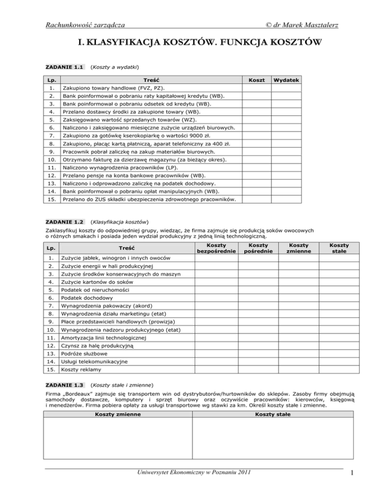Rachunkowość zarządcza © dr Marek Masztalerz I. KLASYFIKACJA KOSZTÓW. FUNKCJA KOSZTÓW ZADANIE 1.1 (Koszty a wydatki) Lp. Treść Koszt 1. Zakupiono towary handlowe (FVZ, PZ). 2. Bank poinformował o pobraniu raty kapitałowej kredytu (WB). 3. Bank poinformował o pobraniu odsetek od kredytu (WB). 4. Przelano dostawcy środki za zakupione towary (WB). 5. Zaksięgowano wartość sprzedanych towarów (WZ). 6. Naliczono i zaksięgowano miesięczne zuŜycie urządzeń biurowych. 7. Zakupiono za gotówkę kserokopiarkę o wartości 9000 zł. 8. Zakupiono, płacąc kartą płatniczą, aparat telefoniczny za 400 zł. 9. Pracownik pobrał zaliczkę na zakup materiałów biurowych. 10. Otrzymano fakturę za dzierŜawę magazynu (za bieŜący okres). 11. Naliczono wynagrodzenia pracowników (LP). 12. Przelano pensje na konta bankowe pracowników (WB). 13. Naliczono i odprowadzono zaliczkę na podatek dochodowy. 14. Bank poinformował o pobraniu opłat manipulacyjnych (WB). 15. Przelano do ZUS składki ubezpieczenia zdrowotnego pracowników. ZADANIE 1.2 Wydatek (Klasyfikacja kosztów) Zaklasyfikuj koszty do odpowiedniej grupy, wiedząc, Ŝe firma zajmuje się produkcją soków owocowych o róŜnych smakach i posiada jeden wydział produkcyjny z jedną linią technologiczną. Lp. Koszty bezpośrednie Treść 1. ZuŜycie jabłek, winogron i innych owoców 2. ZuŜycie energii w hali produkcyjnej 3. ZuŜycie środków konserwacyjnych do maszyn 4. ZuŜycie kartonów do soków 5. Podatek od nieruchomości 6. Podatek dochodowy 7. Wynagrodzenia pakowaczy (akord) 8. Wynagrodzenia działu marketingu (etat) 9. Płace przedstawicieli handlowych (prowizja) 10. Wynagrodzenia nadzoru produkcyjnego (etat) 11. Amortyzacja linii technologicznej 12. Czynsz za halę produkcyjną 13. PodróŜe słuŜbowe 14. Usługi telekomunikacyjne 15. Koszty reklamy ZADANIE 1.3 Koszty pośrednie Koszty zmienne Koszty stałe (Koszty stałe i zmienne) Firma „Bordeaux” zajmuje się transportem win od dystrybutorów/hurtowników do sklepów. Zasoby firmy obejmują samochody dostawcze, komputery i sprzęt biurowy oraz oczywiście pracowników: kierowców, księgową i menedŜerów. Firma pobiera opłaty za usługi transportowe wg stawki za km. Określ koszty stałe i zmienne. Koszty zmienne Uniwersytet Ekonomiczny w Poznaniu 2011 Koszty stałe 1 Rachunkowość zarządcza ZADANIE 1.4 © dr Marek Masztalerz (Podział kosztów na stałe i zmienne) Dokonaj podziału kosztów na stałe i zmienne metodą najmniejszych kwadratów i uzupełnij odpowiedź. Przedstaw graficznie funkcję kosztów. Kwartał Produkcja Koszty I 115 666 II 142 736 III 137 715 IV 126 683 Razem Średnia Koszt zmienny wynosi ................. zł/szt. Koszty stałe wynoszą .................. zł kwartalnie. W kolejnym kwartale firma planuje produkcję 150 sztuk, a zatem prognozowane koszty wyniosą ................... zł. II. EWIDENCJA I ROZLICZANIE KOSZTÓW ZADANIE 2.1 (Ewidencja kosztów w firmie produkcyjnej) 401 402 403 404 405 406 407 Lp. 1. Amortyzacja ZuŜycie materiałów i energii Usługi obce Podatki i opłaty Wynagrodzenia Ubezp. społ. i inne świadczenia Pozostałe koszty rodzajowe 501 502 510 520 530 550 Koszty Koszty Koszty Koszty Koszty Koszty Treść ZuŜyta energia elektryczna w hali produkcyjnej 2. Tłumaczenie umów na język angielski 3. Podatek od nieruchomości (magazyny produktów) 4. Wynagrodzenia pracowników działu kadr 5. Karnety na basen dla pracowników administracyjnych 6. ZuŜycie komputerów w biurach 7. Opłata za prowadzenie rachunku bankowego 8. ZuŜycie środków czystości (konserwacja maszyn) 9. Szkolenie pracowników działu handlowego 10. Koszty transportu surowców do produkcji 11. Koszty transportu sprzedanych produktów 12. Opłaty skarbowe 13. Usługi poligraficzne wykonane przez inną firmę 14. Ekspertyza wykonana przez firmę doradczą 15. ZuŜycie samochodów słuŜbowych handlowców 16. Ubezpieczenia majątkowe (hala produkcyjna) 17. Koszty reklamy 18. Usługi pocztowe 19. Zakup fachowych czasopism 20. Czynsz za najem powierzchni biurowej działalności podstawowej wydziałowe zakupu sprzedaŜy działalności pomocniczej ogólnego zarządu „4” Uniwersytet Ekonomiczny w Poznaniu 2011 „5” 2 Rachunkowość zarządcza ZADANIE 2.2 (Koszty wg 501 Koszty 530 Koszty 550 Koszty Lp. © dr Marek Masztalerz „4” i „5”) Określ koszt wg rodzaju oraz wg MPK w hotelu. Wyodrębniono trzy MPK: działalności podstawowej (usługi hotelowe) działalności pomocniczej (oczyszczalnia ścieków) zarządu (administracja) Treść 1. Energia elektryczna (oświetlenie hotelu) 2. Wynagrodzenia pracowników recepcji 3. Wynagrodzenia księgowych 4. 5. „4” „5” Składki ZUS finansowane ze środków pracodawcy (pokojówki) Konserwacja windy dla gości hotelowych wykonana przez inne przedsiębiorstwo 6. ZuŜycie maszyn i urządzeń w oczyszczalni ścieków 7. Pobrane przez bank prowizje za dokonane przelewy Ryczałt za uŜywanie prywatnych samochodów do celów słuŜbowych Wartość rozmów telefonicznych wykonanych 9. przez gości Wartość ubezpieczenia budynku hotelu 10. od skutków zdarzeń losowych 8. 11. Wynagrodzenia pracowników oczyszczalni ścieków 12. StrzyŜenie trawników wokół hotelu wykonane przez inną firmę ZADANIE 2.3 (Arkusz rozliczeniowy kosztów) Uzupełnij arkusz rozliczeniowy kosztów w firmie Pantofelek (producent obuwia), wiedząc Ŝe: • zapłaciła 400 zł za rachunek telefoniczny (administracja), • otrzymała fakturę za remont maszyn do szycia w wysokości 240 zł, • wypłaciła pensje szwaczkom w wysokości 5000 zł brutto, • naliczyła amortyzację programu księgowego w wysokości 200 zł, • zapłaciła podatek od nieruchomości (grunt pod szwalnią) 50 zł, • otrzymała fakturę za kampanię reklamową na kwotę 700 zł, • naliczyła płace pracowników administracyjnych 8000 zł, • zaksięgowała faktury za podróŜe słuŜbowe prezesa 300 zł, • zapłaciła odsetki