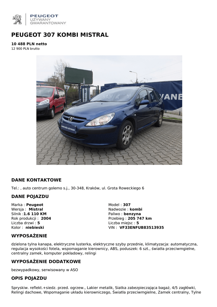 PEUGEOT 307 KOMBI MISTRAL 10 488 PLN netto 12 900 PLN brutto DANE KONTAKTOWE Tel.: , auto centrum golemo s.j., 30-348, Kraków, ul. Grota Roweckiego 6 DANE POJAZDU Marka : Peugeot Wersja : Mistral Silnik :1.6 110 KM Rok produkcji : 2004 Liczba drzwi : 5 Kolor : niebieski Model : 307 Nadwozie : kombi Paliwo : benzyna Przebieg : 205 747 km Liczba miejsc : 5 VIN : VF33ENFUB83513935 WYPOSAŻENIE dzielona tylna kanapa, elektryczne lusterka, elektryczne szyby przednie, klimatyzacja: automatyczna, regulacja wysokości fotela, wspomaganie kierownicy, ABS, poduszek: 6 szt., światła przeciwmgielne, centralny zamek, komputer pokładowy, relingi WYPOSAŻENIE DODATKOWE bezwypadkowy, serwisowany w ASO OPIS POJAZDU Spryskiw. reflekt.+siedz. przed. ogrzew., Lakier metalik, Siatka zabezpieczająca bagaż, 4/5 zagłówki, Relingi dachowe, Wspomaganie układu kierowniczego, Światła przeciwmgielne, Zamek centralny, Tylne oparcie składane, dzielone, Szyba przednia odblaskowa, Siedz. kier. z mech. regulacją wysokości, RadioMagnetofon, Osłona przestrzeni bagażowej, Klimatyzacja automatyczna, Komputer pokładowy, Lusterka boczne regulowane elektrycznie, Airbag 6 sztuk, El. podnoszenie szyb, przód, ABS Bezwypadkowy, Kupiony w ASO w Polsce, Pojazd regularnie serwisowany, Info w sprawie auta: 601540137 !!! W przypadku zainteresowania naszą ofertą prosimy o wcześniejszy kontakt w celu potwierdzenia dostępności oraz lokalizacji samochodu !!! Więcej informacji na temat tego samochodu oraz całej naszej oferty: Autoryzowany salon Peugeot Kraków ul. Grota Roweckiego 6 Jakub Warzecha - doradca handlowy Tel. +48 501 29 33 75 Agnieszka Szymańska-Uchwat - specjalista ds. Kredytów, Lesingów i Ubezpieczeń Tel. +48 693 93 25 21 Autoryzowany salon Citroen Kraków ul. Opolska 9 Tomasz Meus – Kierownik Samochodów Używanych Tel. +48 693 93 27 67 Michał Mikołajczak - doradca handlowy Tel. +48 609 44 10 28 Agnieszka Szczuka-Łach - specjalista ds. Kredytów, Lesingów i Ubezpieczeń Tel. +48 693 93 27 69 Autoryzowany salon Peugeot Nowy Targ ul. Podtatrzańska 3 Marcin Gerlach – kierownik salonu Tel. +48 607 30 52 55 Stasik Paweł - specjalista d/s ubezpieczeń Tel. +48 725 29 16 16 QR CODE DLA OGŁOSZENIA W SERWISIE UZYWANYGWARANTOWANY.PL Powered by TCPDF (www.tcpdf.org)