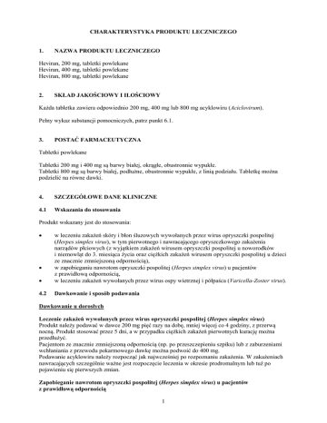 CHARAKTERYSTYKA PRODUKTU LECZNICZEGO 1. NAZWA PRODUKTU LECZNICZEGO Heviran, 200 mg, tabletki powlekane Heviran, 400 mg, tabletki powlekane Heviran, 800 mg, tabletki powlekane 2. SKŁAD JAKOŚCIOWY I ILOŚCIOWY Każda tabletka zawiera odpowiednio 200 mg, 400 mg lub 800 mg acyklowiru (Aciclovirum). Pełny wykaz substancji pomocniczych, patrz punkt 6.1. 3. POSTAĆ FARMACEUTYCZNA Tabletki powlekane Tabletki 200 mg i 400 mg są barwy białej, okrągłe, obustronnie wypukłe. Tabletki 800 mg są barwy białej, podłużne, obustronnie wypukłe, z linią podziału. Tabletkę można podzielić na równe dawki. 4. SZCZEGÓŁOWE DANE KLINICZNE 4.1 Wskazania do stosowania Produkt wskazany jest do stosowania: • w leczeniu zakażeń skóry i błon śluzowych wywołanych przez wirus opryszczki pospolitej (Herpes simplex virus), w tym pierwotnego i nawracającego opryszczkowego zakażenia narządów płciowych (z wyjątkiem zakażeń wirusem opryszczki pospolitej u noworodków i niemowląt do 3. miesiąca życia oraz ciężkich zakażeń wirusem opryszczki pospolitej u dzieci ze znacznie zmniejszoną odpornością), w zapobieganiu nawrotom opryszczki pospolitej (Herpes simplex virus) u pacjentów z prawidłową odpornością, w leczeniu zakażeń wywołanych przez wirus ospy wietrznej i półpaśca (Varicella-Zoster virus). 4.2 Dawkowanie i sposób podawania • • Dawkowanie u dorosłych Leczenie zakażeń wywołanych przez wirus opryszczki pospolitej (Herpes simplex virus) Produkt należy podawać w dawce 200 mg pięć razy na dobę, mniej więcej co 4 godziny, z przerwą nocną. Produkt stosować przez 5 dni, a w przypadku ciężkich zakażeń pierwotnych kurację można przedłużyć. Pacjentom ze znacznie zmniejszoną odpornością (np. po przeszczepieniu szpiku) lub z zaburzeniami wchłaniania z przewodu pokarmowego dawkę można podwoić do 400 mg. Podawanie acyklowiru należy rozpocząć jak najwcześniej po rozpoznaniu zakażenia. W zakażeniach nawracających szczególnie ważne jest rozpoczęcie leczenia w okresie prodromalnym lub tuż po pojawieniu się pierwszych zmian. Zapobieganie nawrotom opryszczki pospolitej (Herpes simplex virus) u pacjentów z prawidłową odpornością 1 U pacjentów z prawidłową odpornością produkt należy podawać w dawce 200 mg trzy - cztery razy na dobę, mniej więcej co 6-8 godzin. U wielu pacjentów skuteczne oraz wygodniejsze może być podawanie produktu dwa razy na dobę, co12 godzin, w dawce 400 mg. Zapobiegawczo może również działać dawka zmniejszana stopniowo do 200 mg trzy razy na dobę, mniej więcej co 8 godzin, lub nawet dwa razy na dobę, mniej więcej co 12 godzin. U niektórych pacjentów reakcja na zapobiegawcze podawanie leku występuje po zastosowaniu całkowitej dawki dobowej produktu wynoszącej 800 mg. Stosowanie leku należy przerywać co 6 do 12 miesięcy w celu obserwacji ewentualnych zmian w przebiegu choroby. Leczenie zakażeń wywołanych przez wirus ospy wietrznej i półpaśca (VZV) Produkt należy podawać w dawce 800 mg cztery - pięć razy na dobę (mniej więcej co 4 godziny), z przerwą nocną. Leczenie należy kontynuować przez 5 do 7 dni. Należy rozważyć dożylne podawanie leku pacjentom ze znacznie zmniejszoną odpornością (np. po przeszczepieniu szpiku) lub z zaburzeniami wchłaniania z przewodu pokarmowego. Leczenie trzeba rozpocząć bezzwłocznie po rozpoznaniu zakażenia. Najlepsze wyniki lecznicze zarówno w przypadku ospy wietrznej, jak i półpaśca uzyskuje się podając lek w ciągu 24 godzin po wystąpieniu pierwszych zmian skórnych - wysypki. Dawkowanie u dzieci i młodzieży Leczenie zakażeń wywołanych przez wirus opryszczki pospolitej (Herpes simplex virus) Dzieci w wieku 2 lat i powyżej dawka jak dla dorosłych. Leczenie zakażeń wirusem ospy wietrznej: Dzieci w wieku od 6 lat - 800 mg cztery razy na dobę, Dzieci w wieku 2 do 5 lat - 400 mg cztery razy na dobę. Dawkę można też określić dokładniej podając 20 mg/kg masy ciała (do maksymalnej dawki 800 mg) cztery razy na dobę. Leczenie należy kontynuować przez 5 dni. Brak szczegółowych danych na temat zapobiegania nawrotom zakażeń wirusem opryszczki pospolitej oraz leczenia półpaśca u dzieci z prawidłową odpornością. Dawkowanie u pacjentów w podeszłym wieku U pacjentów w podeszłym wieku należy brać pod uwagę możliwość zaburzenia czynności nerek i odpowiednio dostosować dawkę leku (patrz: Dawkowanie u pacjentów z zaburzeniami czynności nerek). Należy utrzymywać stan właściwego nawodnienia organizmu. Dawkowanie u pacjentów z zaburzeniami czynności nerek Zaleca się ostrożność podczas stosowania acyklowiru u pacjentów z zaburzeniami czynności nerek. Należy utrzymywać odpowiedni poziom nawodnienia organizmu u tych pacjentów. Podczas leczenia zakażeń wirusem opryszczki pospolitej lub zapobiegania im u pacjentów z umiarkowanym i ciężkim zaburzeniem czynności nerek stosowanie zalecanych dawek doustnych nie doprowadzi do kumulacji acyklowiru w organizmie w stężeniach wyższych niż uznane za bezpieczne podczas podawania leku dożylnie. Jednak pacjentom z ciężką niewydolnością nerek (klirens kreatyniny mniejszy niż 10 ml/min) zaleca się zmniejszenie dawki do 200 mg dwa razy na dobę mniej więcej co 12 godzin. Podczas leczenia zakażeń wirusem ospy wietrznej i półpaśca u pacjentów z umiarkowaną niewydolnością nerek (klirens kreatyniny 10–25 ml/min) zaleca się zmniejszenie dawki do 800 mg trzy razy na dobę, mniej więcej co 8 godzin, a u pacjentów z ciężką niewydolnością nerek (klirens kreatyniny mniejszy niż 10 ml/min) zaleca się zmniejszenie dawki do 800 mg dwa razy na dobę, mniej więcej co 12 godzin. 2 4.3 Przeciwwskazania Nadwrażliwość na substancję czynną, walacyklowir lub na którąkolwiek substancję pomocniczą wymienioną w punkcie 6.1. 4.4 Specjalne ostrzeżenia i środki ostrożności dotyczące stosowania Ryzyko wystąpienia zaburzeń czynnośc