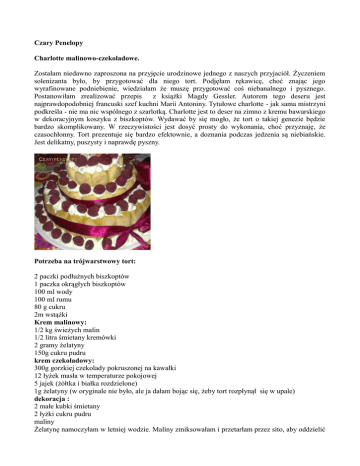 Czary Penelopy Charlotte malinowo-czekoladowe. Zostałam niedawno zaproszona na przyjęcie urodzinowe jednego z naszych przyjaciół. Życzeniem solenizanta było, by przygotować dla niego tort. Podjęłam rękawicę, choć znając jego wyrafinowane podniebienie, wiedziałam że muszę przygotować coś niebanalnego i pysznego. Postanowiłam zrealizować przepis z książki Magdy Gessler. Autorem tego deseru jest najprawdopodobniej francuski szef kuchni Marii Antoniny. Tytułowe charlotte - jak sama mistrzyni podkreśla - nie ma nic wspólnego z szarlotką. Charlotte jest to deser na zimno z kremu bawarskiego w dekoracyjnym koszyku z biszkoptów. Wydawać by się mogło, że tort o takiej genezie będzie bardzo skomplikowany. W rzeczywistości jest dosyć prosty do wykonania, choć przyznaję, że czasochłonny. Tort prezentuje się bardzo efektownie, a doznania podczas jedzenia są niebiańskie. Jest delikatny, puszysty i naprawdę pyszny. Potrzeba na trójwarstwowy tort: 2 paczki podłużnych biszkoptów 1 paczka okrągłych biszkoptów 100 ml wody 100 ml rumu 80 g cukru 2m wstążki Krem malinowy: 1/2 kg świeżych malin 1/2 litra śmietany kremówki 2 gramy żelatyny 150g cukru pudru krem czekoladowy: 300g gorzkiej czekolady pokruszonej na kawałki 12 łyżek masła w temperaturze pokojowej 5 jajek (żółtka i białka rozdzielone) 1g żelatyny (w oryginale nie było, ale ja dałam bojąc się, żeby tort rozpłynął się w upale) dekoracja : 2 małe kubki śmietany 2 łyżki cukru pudru maliny Żelatynę namoczyłam w letniej wodzie. Maliny zmiksowałam i przetarłam przez sito, aby oddzielić nasiona od miąższu. Malinowy sos schłodziłam w lodówce. Zimną śmietanę ubiłam na sztywno, stopniowo dodając cukier puder. Delikatnie połączyłam z malinowym miąższem, tak by krem się nie zważył. Na koniec dodałam rozpuszczoną żelatynę i delikatnie wymieszałam. W płytkim naczyniu rozpuściłam 100 ml wody z 80g cukru i rumem. Biszkopty nasączałam w przygotowanym ponczu, poprzez jednosekundowe zanurzenie. Trzeba uważać by biszkopty nasączyły się rumem a jednocześnie nie zrobiły się zbyt miękkie. Następnie wyłożyłam nimi pionowo brzegi formy. Gdy płotek był już ułożony na dno tortownicy wysypałam lekko rozkruszone, okrągłe biszkopty. Dokładnie je ubiłam i obficie skropiłam ponczem rumowym. Tak samo postąpiłam z mniejszymi formami (życzeniem było by tort był piętrowy). Przełożyłam masę malinową do przygotowanych form i starannie ją rozsmarowałam. Biszkoptowy płotek obcięłam nożem równo z rantem tortownicy. To co odcięłam ułożyłam na malinowym musie. Tortownice z pierwszą warstwą zawinęłam w folię spożywczą i włożyłam do lodówki. W tym momencie rozpoczęłam zabawę z musem czekoladowym. Rozpuściłam czekoladę w kąpieli wodnej. Dodałam do niej masło i rozmieszałam dokładnie. Zdjęłam z ognia i zmiksowałam z żółtkami. Ubiłam pianę z białek, stopniowo dodając cukier. Stopniowo dodawałam ubitą pianę do masy czekoladowej i delikatnie mieszając łączyłam obie masy. Na końcu dodałam rozpuszczoną żelatynę. Masę wylałam na pierwszą warstwę musu malinowego, wygładziłam i ponownie włożyłam do lodówki. Tuż przed wyjściem na przyjęcie, wyłożyłam ciasto z największej tortownicy na duży talerz, odwracając je do góry dnem. Zdjęłam obręcz tortownicy. Biszkoptową palisadę obwiązałam malinową wstążką (oczywiście chodzi o jej kolor) . Z kolejnymi warstwami postąpiłam podobnie. Gdy piramida była ułożona, ubiłam bitą śmietanę z 2 łyżkami cukru pudru (do niej również dodałam rozpuszczoną żelatynę). Przy pomocy cukierniczej szprycy udekorowałam swoje dzieło. W kępki bitej śmietany powkładałam jędrne maliny. Muszę przyznać, że tort zrobił duże wrażenie i bardzo wszystkim smakował. Penelopa Rybarkiewicz-Szmajduch