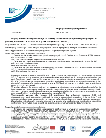 Wszyscy uczestnicy postępowania Znak: P-M/Z/ /17 Data: 30.01.2017 r. Dotyczy: Przetargu nieograniczonego na dostawę rękawic chirurgicznych i diagnostycznych na potrzeby „Pro-Medica” w Ełku Sp. z o.o. (Znak Postępowania: 266/2017) Na podstawie art. 38 ust. 1-2 ustawy Prawo zamówień publicznych (t.j. Dz. U. z 2015 r. poz. 2164 ze zm.),) Zamawiający przekazuje treść zapytań dotyczących zapisów specyfikacji istotnych warunków zamówienia wraz z wyjaśnieniami. W przedmiotowym postępowaniu wpłynęły następujące pytania Grupa 2 pozycja 1 opisu przedmiotu zamówienia 1) Czy nie zaszła omyłka pisarska w opisaniu wymaganych norm? Zamiast norm E 980 oraz E 374 powinny być EN 980 oraz EN 374. Ad.1. Tak, zaszła pomyłka powinna być norma EN 980 i EN 374. 2) Zwracamy się z prośbą do Zamawiającego o dopuszczenie rękawicy bez zgodności z normą EN 980 gdyż ta norma została wycofana. Ad.2. Zamawiający dopuszcza. 3) Zwracamy się z prośbą o dopuszczenie rękawicy zgodnych z Normą EN 374-1 z wyłączeniem paragrafu 5.3.2 o pozostałych parametrach zgodnych z SIWZ? Ad.3. Zamawiający dopuszcza. Procedura oceny zgodności z normą EN 374-1 może odbywać się z włączeniem lub wyłączeniem paragrafu 5.3.2. O rodzaju zastosowanej procedury decyduje zgłaszający rękawiczki do oceny zgodności czyli producent. Pozytywne zakończenie każdej z ww. procedur, pozwala na określenie rękawiczek, jako „zgodnych z EN 374-1”. Konsekwencją zastosowanej procedury jest jedynie odpowiednie oznakowanie opakowania (jeden z dwóch piktogramów zamieszczonych w normie EN 374-1) jak również odpowiedni zapis w certyfikacie oceny zgodności rękawiczek. W szpitalu rękawice dla potrzeb ogólnych tzn. używane w standardowych procedurach medycznych (nie do laboratorium lub innego działu, gdzie użytkownicy korzystający z rękawic mają kontakt ze stężonymi substancjami, z którymi kontakt stanowi poważne ryzyko dla zdrowia i życia), wystarczające są rękawice zgodne z normą EN 374-1 przebadane z wyłączeniem paragrafu 5.3.2. Wprowadzenie wymogu, aby rękawice były przebadane bez wyłączenia paragrafu 5.3.2 jest nieuzasadnione, gdyż potencjalna możliwość kontaktu z substancjami znajdującymi się na liście A jest znikoma, a jednocześnie naraża szpital na znacznie wyższe koszty i narusza zasady uczciwej konkurencji. Zasadne jest natomiast, aby rękawice stosowane w szpitalu były przebadane na substancje, z którymi ich użytkownicy rzeczywiście mają kontakt, np. składnikami stosowanych środków dezynfekcyjnych. Grupa 3 pozycja 1 opisu przedmiotu zamówienia 4) Zwracamy się z uprzejmą prośbą o dopuszczenie zaoferowania w w/w pozycji wysokiej jakości rękawic diagnostycznych, z nitrylu, bezpudrowanych, będących wyrobem medycznym klasy I i środkiem ochrony osobistej Kategorii III, posiadających badania niezależne na przenikanie substancji chemicznych zgodnie z normą EN 374-3 na ponad 25 substancji chemicznych (z czego min. 18 na poziomie min. 2) oraz na przenikanie wirusów zgodnie z normą ASTM F-1671, według normy EN 374-1 określonych jako rękawice wodoodporne o niskiej odporności chemicznej (polega to na tym, że w badaniach na przenikanie substancji chemicznych wymienionych w załączniku A do normy, będących bardzo silnymi substancjami nie stosowanymi w placówkach służby zdrowia, nie uzyskano min. 2 poziomu ochrony dla minimum 3 substancji z ww. załącznika). Ad. 4. Zamawiający dopuszcza. Grupa 3 pozycja 2 opisu przedmiotu zamówienia 5) Zwracamy się z uprzejmą prośbą o dopuszczenie zaoferowania w w/w pozycji wysokiej jakości rękawic diagnostycznych, z nitrylu, bezpudrowanych, o długości min. 280mm, będących wyrobem medycznym klasy I i środkiem ochrony osobistej Kategorii III, posiadających badania niezależne na przenikanie substancji chemicznych zgodnie z normą EN 374-3 na ponad 12 substancji chemicznych (z czego min. 8 na poziomie min. 2) oraz na przenikanie wirusów zgodnie z normą ASTM F-1671, według normy EN 374-1 określonych jako rękawice wodoodporne o niskiej odporności chemicznej (polega to na tym, że w badaniach na przenikanie substancji chemicznych wymienionych w załączniku A do normy, będących bardzo silnymi substancjami nie stosowanymi w placówkach służby zdrowia, nie uzyskano min. 2 poziomu ochrony dla minimum 3 substancji z ww. załącznika). Ad. 5. Zamawiający dopuszcza. Grupa 5 pozycja 2 opisu przedmiotu zamówienia 6) Zwracamy się uprzejmą prośbą o dopuszczenie rękawic o długości minimalnej 285mm o pozostałych parametrach zgodnie z SIWZ? Pragniemy nadmienić iż dopuszczenie minimalnie krótszych rękawic zwiększy konkurencyjność ofert, które i tak będą zweryfikowane podczas oceny jakości. Ad. 6. Zamawiający dopuszcza. Grupa 5 pozycja 3 opisu przedmiotu zamówienia 7) Zwracamy się uprzejmą prośbą o dopuszczenie rękawic o długości minimalnej 290mm, w zależności od rozmiaru? Pragniemy nadmienić, iż w toku produkcji nie da się wyprodukować rękawic o takich samych długościach dla każdego rozmiaru. Ad. 7. Zamawiający dopuszcza. Grupa 7 pozycja 1-5 opisu przedmiotu zamówienia 8) Czy Zamawiający dopuści dozowniki pojedyncze kompatybilne z opakowaniami zaoferowanych rękawic w Grupach 1,2,3, przyklejane bądź przykręcane do ściany z przeliczeniem ilości dozowników w sumie 131szt? Ad. 8. . Zamawiający dopuszcza. Pytanie 1 – Grupa III poz.1 i 2 9) Zwracamy się z prośbą o dopuszczenie rękawicy diagnostycznej nitrylowej niejałowej bezpudrowej oznakowanej jako wyrób medyczny klasy I i środek ochrony indywidualnej kat.III, spełniające normy EN 455 1-4, EN 374 -1 (z wył. Pkt.5.3.2, ograniczona ochrona chemiczna), EN 374-2, EN 374-3, spełniające pozostałe wymogi? Ad. 9. Zamawiający dopuszcza. Pytanie 2 – Grupa V poz.2 10) Zwracamy się z prośbą o dopuszczenie rękawicy chirurgicznej lateksowej jałowej o długości rękawicy min.285mm, spełn