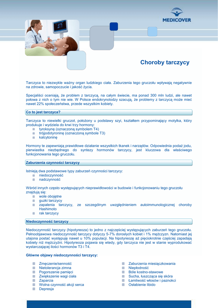 Choroby tarczycy Tarczyca to niezwykle ważny organ ludzkiego ciała. Zaburzenia tego gruczołu wpływają negatywnie na zdrowie, samopoczucie i jakość życia. Specjaliści oceniają, że problem z tarczycą, na całym świecie, ma ponad 300 mln ludzi, ale nawet połowa z nich o tym nie wie. W Polsce endokrynolodzy szacują, że problemy z tarczycą może mieć nawet 22% społeczeństwa, przede wszystkim kobiety. Co to jest tarczyca? Tarczyca to niewielki gruczoł, położony u podstawy szyi, kształtem przypominający motylka, który produkuje i wydziela do krwi trzy hormony: tyroksynę (oznaczoną symbolem T4) trójjodotyroninę (oznaczoną symbole T3) kalcytoninę Hormony te zapewniają prawidłowe działanie wszystkich tkanek i narządów. Odpowiednia podaż jodu, pierwiastka niezbędnego do syntezy hormonów tarczycy, jest kluczowa dla właściwego funkcjonowania tego gruczołu. Zaburzenia czynności tarczycy Istnieją dwa podstawowe typy zaburzeń czynności tarczycy: niedoczynność nadczynność Wśród innych często występujących nieprawidłowości w budowie i funkcjonowaniu tego gruczołu znajdują się: wole obojętne guzki tarczycy zapalenia tarczycy, ze szczególnym uwzględnieniem autoimmunologicznej choroby Hashimoto rak tarczycy Niedoczynność tarczycy Niedoczynność tarczycy (hipotyreoza) to jedno z najczęściej występujących zaburzeń tego gruczołu. Pełnoobjawowa niedoczynność tarczycy dotyczy 5-7% dorosłych kobiet i 1% mężczyzn. Natomiast jej utajona postać występuję nawet u 10% populacji. Na hipotyreozę aż pięciokrotnie częściej zapadają kobiety niż mężczyźni. Hipotyreoza pojawia się wtedy, gdy tarczyca nie jest w stanie wyprodukować wystarczającej ilości hormonów T3 i T4. Główne objawy niedoczynności tarczycy: Zmęczenie/senność Nietolerancja zimna Pogorszenie pamięci Zwiększenie wagi ciała Zaparcia Wolna czynność akcji serca Depresja Zaburzenia miesiączkowania Niepłodność Bóle kostno-stawowe Sucha, łuszcząca się skóra Łamliwość włosów i paznokci Osłabienie libido Nadczynność tarczycy Nadczynność tarczycy (hipertyreoza) polega na nieprawidłowej, zwiększonej syntezie i uwalnianiu hormonów: tyroksyny i trójjodotyroniny, co prowadzi do ich podwyższonego stężenie we krwi i w efekcie przyspiesza metabolizm organizmu. Na nadczynność tarczycy choruje ok. 2% dorosłych w Polsce i jest to druga po cukrzycy najczęściej występująca choroba endokrynologiczna. Zapada na nią cztery razy więcej kobiet niż mężczyzn. U 70% chorych z hipertyreozą przyczyną nadmiernej produkcji hormonów tarczycy jest choroba genetyczna Gravesa-Basedowa. Główne objawy nadczynności tarczycy: Chudnięcie Przyspieszenie pracy serca Rozdrażnienie, nerwowość, niepokój Uczucie osłabienia Drżenie rąk Częste oddawanie stolca Kłopoty ze snem Potliwość Skąpe rzadsze miesiączki Tak jak w przypadku niedoczynności tarczycy, nieleczona nadczynność nie tylko pogarsza jakość życia chorych, ale przede wszystkim może mieć poważne konsekwencje takie jak: zaburzenia rytmu, a nawet zawał serca czy zwiększone ryzyko u kobiet po menopauzie zachorowania na osteoporozę. Zapalenia tarczycy Zapalenia tarczycy stanowią zróżnicowaną grupę chorób, które objawiają się często bólem szyi promieniującym do uszu i żuchwy, powiększeniem gruczołu tarczowego oraz zaburzeniem jego czynności. Przyczyny zapalenia tarczycy mogą być rozmaite: infekcje bakteryjne, wirusowe, grzybicze choroba autoimmunologiczna (najczęściej w postaci choroby Hashimoto – choroba ta dotyka 1% populacji Polski, jest to najczęstsza choroba tarczycy u kobiet w wieku rozrodczym) urazy fizyczne Rak tarczycy Rak tarczycy jest chorobą rzadką i najczęściej występującą w postaci twardego guza. Stanowi zaledwie 1% wszystkich złośliwych nowotworów. W Polsce zapadalność na raka tarczycy wynosi: 4,3/100 000/rok wśród kobiet i 1,1/100 000/rok wśród mężczyzn. Rak tarczycy nie powoduje zaburzeń samej czynności tarczycy - nie prowadzi ani do niedoczynności, ani do nadczynności gruczołu tarczycowego. Wśród objawów nasuwających podejrzenie nowotworu tego gruczołu znajdują się: obecności guzków w obrębie gruczołu, z tendencją do rozrastania chrypka wynikająca z podrażnienia strun głosowych powiększone węzły chłonne szyi duszność zaburzenia połykania. Nie ma jednej metody leczenia, która byłaby najlepsza dla wszystkich chorych. Decyzję o wyborze leczenia konkretnego chorego podejmuje lekarz na podstawie rodzaju i intensywności objawów, wyników badań, wieku pacjenta i ewentualnie chorób współistniejących. Opracowała: mgr Joanna Janicka, specjalista zdrowia publicznego Materiały źródłowe: Khan A, Muzaffar M, Khan A, et al. Thyroid Disorders, Etiology and Prevalence. J Med Sci. 2002;2:89-94. Canaris GJ, Manowitz NR, Mayor G, et al. The Colorado thyroid disease prevalence study. Arch Intern Med. 2000;160:526-34. M. Kurowska, J.S. Tarach, J. Malicka, A. Dąbrowska Choroby tarczycy w autoimmunologicznych zespołach wielogruczołowych. 4. American Thyroid Association www.thyroid.org www.tarczyca.pl