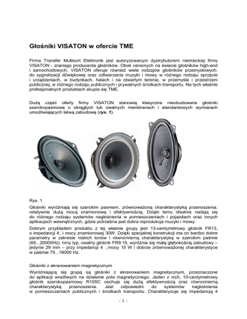 Głośniki VISATON w ofercie TME Firma Transfer Multisort Elektronik jest autoryzowanym dystrybutorem niemieckiej firmy VISATON - znanego producenta głośników. Obok cenionych na świecie głośników high-end i samochodowych, VISATON oferuje równieŜ wiele rodzajów głośników przemysłowych: do sygnalizacji dźwiękowej oraz odtwarzania muzyki i mowy w róŜnego rodzaju sprzęcie i urządzeniach, w budynkach, halach i na otwartym terenie, w przemyśle i przestrzeni publicznej, w róŜnego rodzaju publicznych i prywatnych środkach transportu. Na tych właśnie profesjonalnych produktach skupia się TME. DuŜą część oferty firmy VISATON stanowią klasyczne nieobudowane głośniki szerokopasmowe o okrągłych lub owalnych membranach i standardowych wymiarach umoŜliwiających łatwą zabudowę (rys. 1). Rys. 1 Głośniki wyróŜniają się szerokim pasmem, zrównowaŜoną charakterystyką przenoszenia, relatywnie duŜą mocą znamionową i efektywnością. Dzięki temu idealnie nadają się do róŜnego rodzaju systemów nagłośnienia w pomieszczeniach i pojazdach oraz innych aplikacjach wewnętrznych, gdzie potrzebna jest dobra reprodukcja muzyki i mowy. Dobrym przykładem produktu z tej właśnie grupy jest 13-centymetrowy głośnik FR13, o impedancji 4i mocy znamionowej 30W. Dzięki specjalnej konstrukcji ma on bardzo dobre parametry w zakresie niskich tonów i równomierną charakterystykę w szerokim paśmie (65...20000Hz). Inny typ, owalny głośnik FR9.15, wyróŜnia się małą głębokością zabudowy – jedynie 29 mm – przy impedancji 4 mocy 15 W i dobrze zrównowaŜonej charakterystyce w paśmie 75...16000 Hz. Głośniki z ekranowaniem magnetycznym WyróŜniającą się grupą są głośniki z ekranowaniem magnetycznym, przeznaczone do aplikacji wraŜliwych na działanie pola magnetycznego. Jeden z nich, 10-centymetrowy głośnik szerokopasmowy R10SC cechuje się duŜą efektywnością oraz równomierną charakterystyką przenoszenia. Jest odpowiedni do systemów nagłośnienia w pomieszczeniach publicznych i środkach transportu. Charakteryzuje się impedancją 4 -1– mocą 20 W i pasmem 100...13000 Hz. Podobne zalety ma znacznie mniejszy ekranowany głośnik SC5.9ND, z owalną membraną i neodymowym magnesem, zajmujący powierzchnię 90 x 50 mm, przy czym jego głębokość to jedynie 30 mm. Jego impedancja to 8 moc 3 W, a pasmo 150...17000 Hz. Głośniki sufitowe Do zabudowy w sufitach i ścianach wygodne są głośniki ze zintegrowanymi osłonami czołowymi, tzw. głośniki sufitowe. Przykładowo, ekonomiczne głośniki DL8 są przeznaczone do pomieszczeń zamkniętych. Mają białe metalowe atrapy i wymagają otworów montaŜowych o średnicy 81 mm i głębokości jedynie 38 mm. Mocowanie zapewniają spręŜyste zaczepy. Charakteryzują się impedancją 8 , mocą 10 W i pasmem 90…18000 Hz. W pomieszczeniach o bardzo duŜej wilgotności i na zewnątrz budynków odpowiednie są wodoszczelne głośniki sufitowe FR-WP (rys. 2). Rys. 2 Seria ta obejmuje kilka typów o średnicach otworów montaŜowych od 73 do 141 mm. Membrany, kosze i grille głośników są wykonane z tworzywa sztucznego, a całkowitą wodoszczelność (IP 65) i odporność na korozję zapewnia zabudowany magnes i wyprowadzenia pokryte silikonem. Dodatkowo szeroki zakres temperatur pracy – od -40 do +80oC – umoŜliwia nawet zastosowania morskie. Głośniki charakteryzują się impedancją 4 lub 8 i mocą od 15 do 60 W. Pasmo najmniejszego z serii FR8WP to 100...20000 Hz, a największego FR16WP - 16...15000 Hz. Głośniki mylarowe Kolejną istotną grupą w ofercie firmy VISATON są głośniki z membranami mylarowymi. -2– Szeroki zakres temperatur pracy (od -40 do +70oC) i szczelne wykonanie (IP 65) umoŜliwiają stosowanie ich na zewnątrz, w niesprzyjających warunkach atmosferycznych (rys. 3). Dzięki niewielkim wymiarom są idealne w zastosowaniach o bardzo ograniczonej przestrzeni montaŜowej. Mała moc, rzędu 1-2W, i nieco gorsze charakterystyki powodują jednak, Ŝe są one bardziej odpowiednie do sygnalizacji i aplikacji głosowych. Przykładowo, najmniejszy z rodziny K28WP mierzy 28 mm średnicy i 5,5 mm głębokości. Ma moc znamionową 1 Wi pasmo 300...20000 Hz. Największy K64WP ma wymiary odpowiednio 64 i 19 mm oraz parametry 2 W i 200...15000 Hz. Głośniki miniaturowe VISATON ma w ofercie jeszcze mniejsze głośniki. K16 ma tylko 16 mm średnicy, 3,5 mm grubości i wyprowadzenia w postaci luźnych przewodów (rys. 4). Rys. 4 Jest montowany przy pomocy paska klejącego. Jego parametry nie są imponujące – impedancja 50 , moc znamionowa 0,5 W, pasmo 700...20000 Hz – dlatego jest przeznaczony raczej do odtwarzania sygnałów dźwiękowych, ale za to nawet w najmniejszych, najbardziej upakowanych przyrządach i urządzeniach. Podobne -3– zastosowanie ma przeznaczony do lutowania na płytce K23, o 23 mm średnicy i grubości 8,6 mm. Jego parametry pracy to: 8 , 0,2 W, 900...16000 Hz. Natomiast miniaturowy głośnik z owalną membraną K20.40 odpowiedni jest takŜe do odtwarzania głosu, mimo Ŝe jego powierzchnia to tylko 40 x 20 mm, a grubość jedynie 8 mm. Ma przy tym impedancję 8 , moc 1 W i pasmo 300...20000 Hz. Głośniki bezmembranowe Bardzo ciekawą konstrukcją są tzw. głośniki bezmembranowe (excitery) – przetworniki elektrodynamiczne. Membranę dla nich stanowi spręŜysta powierzchnia, do której są przymocowane (rys.5). Rys. 5 Znakomicie sprawdzają się one w sytuacjach, gdy z powodów estetycznych, konstrukcyjnych lub środowiskowych nie moŜna zastosować klasycznego głośnika, Zalety takiego rozwiązania to niewidoczność głośnika na zewnątrz, ochrona przed niekorzystnymi wpływami środowiskowymi i łatwość instalacji. Są jednak i wady: mała efektywność, łatwość zakłócenia lub stłumienia dźwięku, duŜa zaleŜność parametrów emitowanego dźwięku od materiału, rozmiarów i kształtu pobudzanej powierzchni. Tak czy inaczej, w