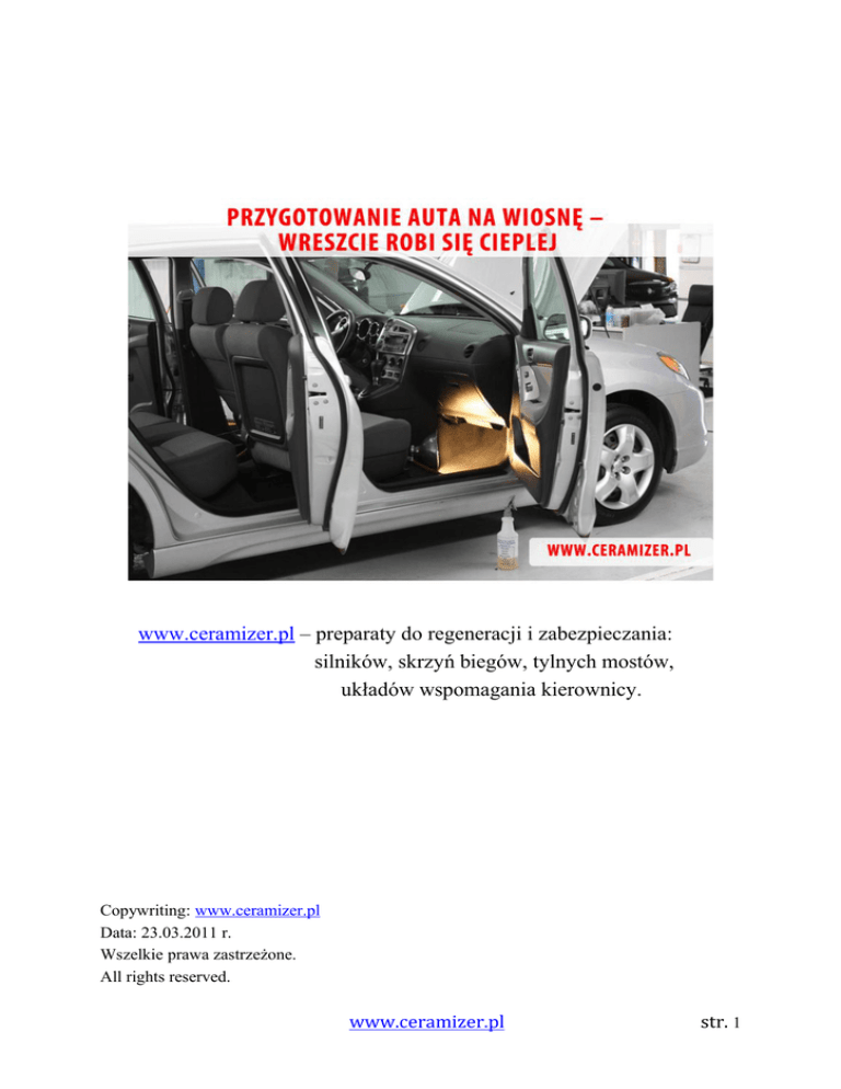 www.ceramizer.pl – preparaty do regeneracji i zabezpieczania: silników, skrzyń biegów, tylnych mostów, układów wspomagania kierownicy. Copywriting: www.ceramizer.pl Data: 23.03.2011 r. Wszelkie prawa zastrzeżone. All rights reserved. www.ceramizer.pl str. 1 Wstęp Gdy dni są coraz dłuższe, temperatura zaczyna sprzyjać spacerom, a na drzewach pojawiają się zielone pąki, najwyższy czas pomyśleć o przygotowaniu naszego samochodu do sezonu letniego. Wbrew pozorom i pewnie wielu innym podobnym poradnikom, wcale nie trzeba oddawać auta w ręce fachowców, a wiele rzeczy można zrobić samemu. Najpierw dokładnie umyj pojazd W naszym klimacie, przez kilka zimowych miesięcy auto pracuje w bardzo trudnych warunkach. Zmienne temperatury dobowe, srogi mróz, opady atmosferyczne jak śnieg, deszcz lub grad, a także działalność naszych drogowców, którzy wysypują na drogi sól, mają wpływ na stan wizualny naszego pojazdu jak i w pewnym stopniu jego stan techniczny. Dlatego jednym z pierwszych kroków podczas naszego wiosennego przeglądu będzie umycie pojazdu oraz zajęcie się jego wnętrzem. Starajmy się to zrobić, gdy temperatura dobowa nie spada poniżej zera. Unikniemy dzięki temu niepotrzebnych konsekwencji związanych z zamarzniętymi zamkami czy przymarzniętymi drzwiami, a sama praca będzie po prostu dużo przyjemniejsza. Mycie wiosenne jest o tyle istotne, że pozwala usunąć nagromadzone na naszym pojeździe nieczystości. Będą to pozostałości środków do utrzymania dróg w ruchu, w tym soli drogowej czy chemicznych preparatów do rozpuszczania błota poślizgowego jak również po prostu z zwykłego brudu. Warto umyć zarówno nadwozie jak i podwozie auta poprzez oczyszczenie powłoki z zalegającej soli, która sprzyja procesom korozji. Zacznijmy od dokładnego opłukania naszego samochodu. Nie omijajmy przy tym żadnych zakamarków. Rozpoczynając od dachu, dokładnie wypłukujmy brud z: • szpar międzydrzwiowych; • kratek wlotu powietrza; • listew ozdobnych (sugerujemy strumień wody skierować zarówno od dołu jak i od góry listwy); • nadkoli oraz podwozia (jeśli mamy dostęp); • progów; • felgi wraz z oponami; • wszelkich szczelin i zakamarków (np. łączenia zderzaków z karoserią) gdzie mógł zebrać się brud. Jak działa myjnia samoobsługowa? Nie każdy posiada w domu specjalistyczny sprzęt (np. myjkę podciśnieniową) dlatego sugerujemy skorzystanie z coraz łatwiej dostępnych myjni samoobsługowych (tzw. bezdotykowych). Koszt www.ceramizer.pl str. 2 będzie niski a przy tym zyskamy satysfakcję, iż sami zadbaliśmy o nasze auto oraz pewność, że wszystko zostało wykonane z odpowiednią dokładnością i uwagą. Zazwyczaj korzystanie z takich myjni kosztuje 1 zł za 1 minutę. Na dosyć dokładne umycie auta przeciętnych gabarytów powinno wystarczyć 10-12 minut. Obsługa tych myjni jest bardzo prosta, wystarczy wrzucić ilość monet która odpowiada ilości minut w przeciągu których będziemy myć auto (dla przykładu dwie monety 5 złotowe to 10-ciu minutowe mycie auta). Następnie włączamy jeden z kilku przycisków (które są podpisane). Każdy z nich do czego innego służy, np. gdy przyciśniemy przycisk (program) 1, z myjki leci zazwyczaj ciepła woda z chemią rozpuszczającą wszelki brud, przycisk 2 uaktywnia ciepłą wodę do spłukiwania itd. Co myjnia to obyczaj, dlatego w różnych myjniach dany przycisk (program) może oznaczać co innego. Po umyciu pojazdu Po dokładnym umyciu okaże się, jak zima wpłynęła na stan powłoki blacharsko-lakierniczej. Wraz z umyciem nadwozia powinniśmy dokładnie przyjrzeć się karoserii. Piasek, żwir, błoto mogły zostawić różne ślady w postaci rys i odprysków na lakierze. Należy odtłuścić te miejsca i zabezpieczyć je produktami do odprysków czy rys lakieru. Jeśli zauważymy „rude” naloty korozji, trzeba dodatkowo oczyścić te miejsca z rdzy i nałożyć powłokę ochronną (np. podkład i lakier przy użyciu malutkiego pędzelka). Wnętrze Czyszczenie wnętrza pojazdu ma na celu podnieść komfort estetyczny użytkowania pojazdu, co wcale nie jest takie bagatelne. Udowodniono, że jakość prowadzenia pojazdu uzależniona jest m.in. od samopoczucia kierowcy, na co z całą pewnością ma wpływ czystość czy zapach wewnątrz pojazdu. Postarajmy się dokładnie odkurzyć podłogę kabiny, nie omijać trudno dostępnych miejsc pod siedzeniami czy w okolicy pedałów. Nagromadzony piasek wraz z naniesioną solą i błotem pośniegowym oraz utrzymująca się na dywanikach i zapewne pod nimi wilgoć, wpływa korodująco na elementy metalowe, w tym między innymi na wewnętrzną cześć podłogi. Postarajmy się wysuszyć tapicerkę nim położymy na niej letnie dywaniki. W przypadku niewielkiej ilości wilgoci, wystarczy w słoneczny dzień odsłonić mokre elementy podłogi, włączyć nawiew gorącego powietrza „na nogi” oraz pozostawić otwarte drzwi na kilka godzin. W trudniejszych przypadkach konieczne będzie skorzystanie z dodatkowego nadmuchu ciepłego powietrza (np. „farelki” czy suszarki) lub w ostateczności skorzystanie z usług profesjonalnej firmy. Samo czyszczenie deski rozdzielczej, elementów drzwi itp. pozostawiamy Państwa fantazji. Jest dostępnych wiele preparatów przystosowanych do tego celu oraz gustu zapachowego nabywcy, więc każdy znajdzie coś dla siebie. Ważne jednak, abyśmy zadbali o nasze bezpieczeństwo na drodze, czyli o widoczność, poprzez umycie szyb (zarówno od wewnętrznej jak i zewnętrznej strony). www.ceramizer.pl str. 3 Za wilgoć jak i zapach w kabinie odpowiada tzw. filtr kabinowy oraz klimatyzacyjny. Jego zadaniem jest zbieranie zanieczyszczeń zewnętrznych przez dostaniem się do obiegu układu wentylacyjnego i klimatyzacji. Jest on zazwyczaj umieszczony w podszybiu naszego autka. Aby go wymienić należy po otwarciu maski, usunąć plastikową kratkę zabezpieczającą umieszc