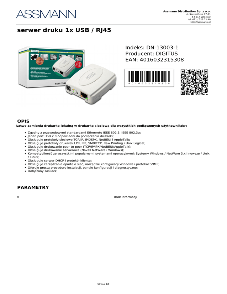 Assmann Distribution Sp. z o.o. ul. Szczecińska 17-21 54-517 Wrocław tel: 071 / 326 71 40 http://assmann.pl serwer druku 1x USB / RJ45 Indeks: DN-13003-1 Producent: DIGITUS EAN: 4016032315308 4 0 1 6 0 3 2 3 1 5 3 0 8 OPIS Łatwo zamienia drukarkę lokalną w drukarkę sieciową dla wszystkich podłączonych użytkowników; Zgodny z przewodowymi standardami Ethernetu IEEE 802.3, IEEE 802.3u; Jeden port USB 2.0 odpowiedni do podłączenia drukarki; Obsługuje protokoły sieciowe TCP/IP, IPX/SPX, NetBEUI i AppleTalk; Obsługuje protokoły drukarek LPR, IPP, SMB/TCP, Raw Printing i Unix Logical; Obsługuje drukowanie peer-to-peer (TCP/IP/IPX/NetBEUI/AppleTalk); Obsługuje drukowanie serwerowe (Novell NetWare i Windows); Kompatybilność ze wszystkimi popularnymi systemami operacyjnymi: Systemy Windows / NetWare 3.x i nowsze / Unix / Linux; Obsługuje serwer DHCP i protokół klienta; Obsługuje zarządzanie oparte o sieć, narzędzie konfiguracji Windows i protokół SNMP; Oferuje prostą procedurę instalacji, panele konfiguracji i diagnostyczne; Dołączony zasilacz; PARAMETRY x Brak informacji Strona 1/1 Powered by TCPDF (www.tcpdf.org)
