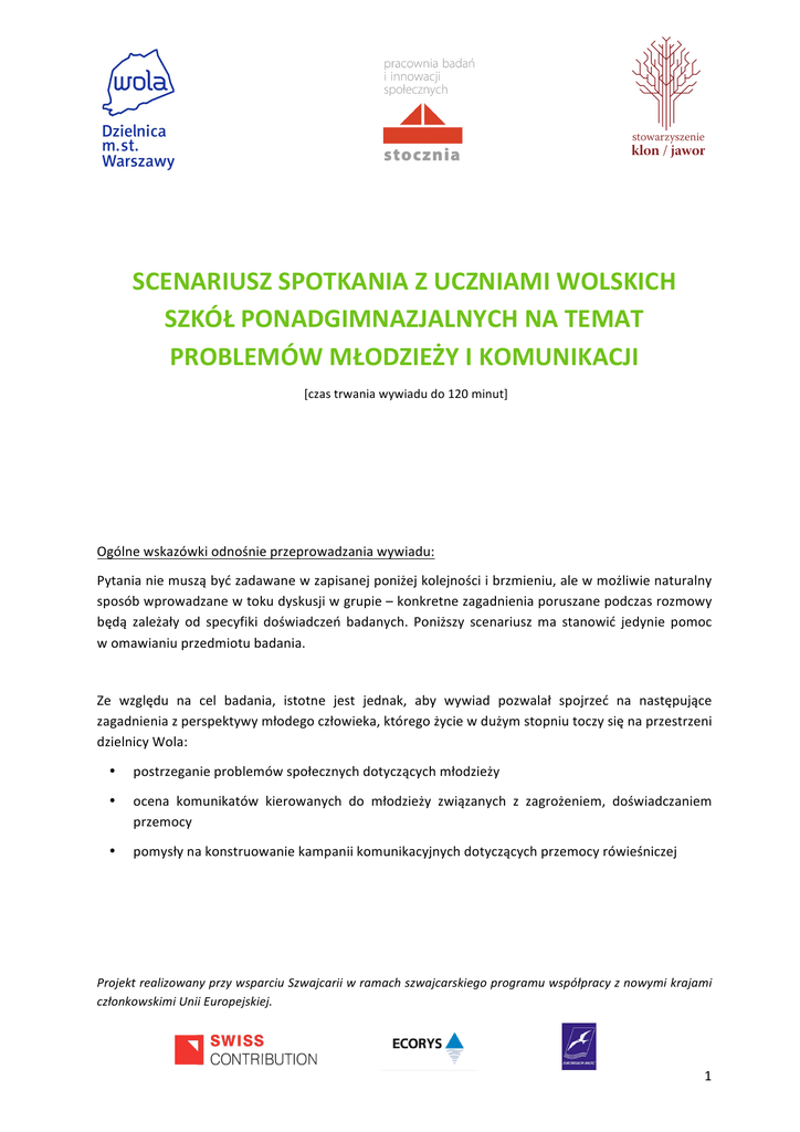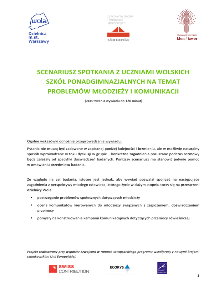 SCENARIUSZ SPOTKANIA Z UCZNIAMI WOLSKICH SZKÓŁ PONADGIMNAZJALNYCH NA TEMAT PROBLEMÓW MŁODZIEŻY I KOMUNIKACJI [czas trwania wywiadu do 120 minut] Ogólne wskazówki odnośnie przeprowadzania wywiadu: Pytania nie muszą być zadawane w zapisanej poniżej kolejności i brzmieniu, ale w możliwie naturalny sposób wprowadzane w toku dyskusji w grupie – konkretne zagadnienia poruszane podczas rozmowy będą zależały od specyfiki doświadczeń badanych. Poniższy scenariusz ma stanowić jedynie pomoc w omawianiu przedmiotu badania. Ze względu na cel badania, istotne jest jednak, aby wywiad pozwalał spojrzeć na następujące zagadnienia z perspektywy młodego człowieka, którego życie w dużym stopniu toczy się na przestrzeni dzielnicy Wola: • postrzeganie problemów społecznych dotyczących młodzieży • ocena komunikatów kierowanych do młodzieży związanych z zagrożeniem, doświadczaniem przemocy • pomysły na konstruowanie kampanii komunikacyjnych dotyczących przemocy rówieśniczej Projekt realizowany przy wsparciu Szwajcarii w ramach szwajcarskiego programu współpracy z nowymi krajami członkowskimi Unii Europejskiej. 1 CZĘŚĆ I: WPROWADZENIE CZAS: 10 MIN Cel: Wprowadzenie nastroju swobodnej rozmowy, zachęcenie do udzielania otwartych i szczerych wypowiedzi opartych na własnych doświadczeniach. 1. Przedstawienie moderatorów z Pracowni Badań i Innowacji Społecznych „Stocznia” oraz Urzędu Dzielnica Wola (spróbujmy przejść na „ty”) 2. Przedstawienie celu/tematu badania i metody jego realizacji. 3. Wyjaśnienie celu i zasad nagrywania. 4. Prośba o szczerość. Zapewnienie o anonimowości spotkania, dyskrecji i braku konieczności odpowiadania na wszystkie pytania. 5. Przedstawienie się respondentów: [5min] Prosimy, aby każdy badany wcielił się na moment w postać reportera przeprowadzającego wywiad z gościem programu – mamy 30 sekund… CZĘŚĆ II: SEGMENTACJA NASTOLATKÓW CZAS: 30 MIN Cel: Zrozumienie młodzieży i świata, w którym żyje TYPY NASTOLATKÓW W TV, gazetach, w szkole, można pewnie często usłyszeć, że młodzi ludzie są tacy i tacy. Ach ta dzisiejsza młodzież i tak dalej. A Wy obracacie się w tym świecie i wiecie najlepiej, że młodzi ludzie są bardzo różni. Zastanówcie się nad typami nastolatków: • Jakie są grupy nastolatków? • Czym się od siebie różnią? Jakie cechy różnią od siebie poszczególne typy? Przechodzimy przez podstawowe: wiek, płeć… lecimy dalej i opisujemy. • Co jest charakterystyczne dla tej grupy? • Gdzie ich można spotkać? • Jakie mają podejście do życia? • Na czym im najbardziej zależy? 2 CZĘŚĆ II: PROBLEMY NASTOLATKÓW CZAS: 20 MIN Cel: Zrozumienie młodzieży i świata, w którym żyje Powiedzieliśmy sobie już trochę o tym, jakie są grupy wśród młodych ludzi. A teraz chciałybyśmy porozmawiać z Wami o tym, jakie są typowe problemy młodych: te ważne i te mniej ważne Zastanówcie się nad problemami nastolatków: (flipchart) • Jakie są problemy nastolatków? • Czym młodzi ludzie się martwią? • Jakie problemy mają Wasi znajomi, ludzi ze szkoły, z osiedla? O jakich słyszeliście? • Czy zdarzają się tez poważniejsze, może nie takie codzienne problemy, ale sprawy, w których naprawdę komuś potrzebna jest pomoc? • Jakie problemy wymagają pomocy, wsparcia? • Skąd można liczyć na takie wsparcie? CZĘŚĆ III: PRZEMOC CZAS: 10 MIN Wśród tych poważnych problemów i sytuacji, w której konieczna jest jakaś ingerencja i pomoc znalazły się sytuacje związane z przemocą. Skąd ta przemoc może się bierze? PRZYKŁADOWA SYTUACJA • opiszcie swoimi słowami, jak się to odbywa? • jak się czuje ofiara? • Jak się czuje świadek? • Co powinni usłyszeć, żeby wiedzieć co w takiej sytuacji zrobić? • Od kogo? • W jaki sposób? • Reklamy? Filmy TV? Ulotki? Plakaty? Strona? 3 CZĘŚĆ IV: PRZEMOC WAW.PL CZAS: 10 MIN Dobrze, chciałybyśmy Wam teraz coś pokazać • co sądzicie o tej stronie? • Czy taka strona to dobry pomysł? • Czy znaliście ją wcześniej? • Kto na nią wchodzi? • Kto powinien? • Dla kogo jest ta strona? • Czy łatwo na niej znaleźć ważne informacje? • Jakie budzi uczucia? Zakładki: o Doświadczanie przemocy o Widziałem przemoc • Co o nich sądzicie? • Co na plus? Co na minus? CZĘŚĆ V: OCENA MATERIAŁÓW DZIELNICY CZAS: 30 MIN Moderator pokazuje uczestnikom wszystkie ulotki, foldery wyprodukowane przez Wydział Zdrowia i Spraw Społecznych Urzędu Dzielnicy Wola. Spójrzcie na te materiały, pooglądajcie je. Znajdźcie wśród nich takie, w których Wam się coś podoba i takie, które zupełnie Was nie przekonały. Moderator prosi uczestników o pokazanie wybranych przez nich materiałów i uzasadnienie wyboru. Dlaczego wybrałeś właśnie tę ulotkę? Co Ci się w niej szczególnie podoba/nie podoba? Co jeszcze? 4 CZĘŚĆ VI: AGENCJE REKLAMOWE CZAS: 30 MIN Podzielcie się na zespoły: agencja, która tworzy kampanię społeczną skierowaną do ofiar przemocy oraz agencja tworząca kampanię dla świadków przemocy. Waszym zadaniem jest wymyślenie kampanii. Wasza propozycja powinna składać się z idei (co przede wszystkim chcecie przekazać), hasła reklamowego i plakatu, który ma być ogólnym pomysłem na przekaz kampanii. Tworząc plakaty możecie korzystać ze wszystkich materiałów tutaj dostępnych. Moderator przekazuje zdjęcia, kolorowe gazety, kleje, nożyczki i inne materiały pomocne w wykonaniu ćwiczenia. Po zakończeniu ćwiczenia moderator dopytuje każdą z grup: Co przede wszystkim chcieliście przekazać tą kampanią? Jaki jest jej główny cel? A co ma przekazać plakat? Jaki jest jego klimat? Z czym ma się kojarzyć? Bardzo dziękujemy za pomoc i udział w naszym spotkaniu! 5