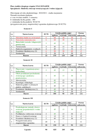 Plan studiów drugiego stopnia STACJONARNE Specjalność: Hodowla zwierząt towarzyszących i wolno żyjących Obowiązuje od roku akademickiego 2010/2011– studia stacjonarne Warunki uzyskania dyplomu: a/ czas trwania studiów 3 semestry b/ minimalna liczba godzin - 480 c/ minimalna liczba punktów 90 ECTS (przygotowanie pracy magisterskiej i egzaminu dyplomowego 20 ECTS) Semestr I Lp. Nazwa kursu ECTS 1. 2. Metodyka badań na zwierzętach Statystyka matematyczna Biotechniki rozrodu i diagnostyki genetycznej Terrarystyka Hodowla organizmów wodnych Przedmiot fakultatywny (2) Seminarium Razem 6 6 3. 4. 5. 6. 7. Liczba godzin zajęć Forma ogółem wykłady ćwiczenia zaliczenia 60 30 30 E 60 30 30 E 5 45 15 30 E 4 4 6 2 33 45 45 90 30 375 15 15 30 0 135 30 30 60 30 240 Z Z Z Z 3E Semestr II Lp. 1. 2. 3. 4. 5. 6. 7. Nazwa kursu Planowanie i organizacja pracy hodowlanej Obrót produktami pochodzenia zwierzęcego i podstawy przetwórstwa Akwarystyka Kynologia i felinologia Hodowla gołębi i wybranych ptaków ozdobnych Przedmioty fakultatywne (1) Seminarium Razem ECTS Liczba godzin zajęć Forma ogółem wykłady ćwiczenia zaliczenia 5 45 15 30 E 5 45 15 30 E 4 5 45 45 15 15 30 30 Z Z 3 45 15 30 Z 3 2 45 30 15 0 30 30 27 300 90 210 Z Z 2E Semestr III Lp. 1. 2. 3. 4. 5. Nazwa kursu Proekologiczne metody chowu zwierząt gospodarskich i wolno żyjących Profilaktyka i dobrostan zwierząt Prawo w hodowli zwierząt Przedmiot fakultatywny (1) Przygotowanie pracy magisterskiej i egzaminu Razem Łącznie ECTS Liczba godzin zajęć Forma ogółem wykłady ćwiczenia zaliczenia 5 45 15 30 E 2 1 2 45 15 45 15 15 15 30 0 30 Z Z Z 20 0 - - E 30 150 60 90 2E 90 825 285 540