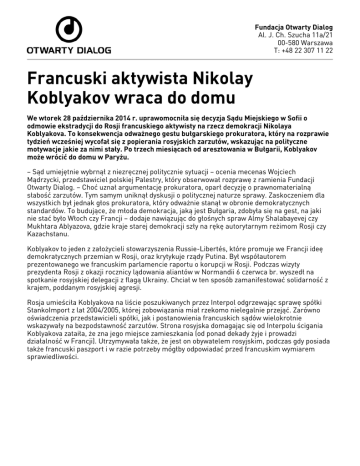 Fundacja Otwarty Dialog Al. J. Ch. Szucha 11a/21 00-580 Warszawa T: +48 22 307 11 22 Francuski aktywista Nikolay Koblyakov wraca do domu We wtorek 28 października 2014 r. uprawomocniła się decyzja Sądu Miejskiego w Sofii o odmowie ekstradycji do Rosji francuskiego aktywisty na rzecz demokracji Nikolaya Koblyakova. To konsekwencja odważnego gestu bułgarskiego prokuratora, który na rozprawie tydzień wcześniej wycofał się z popierania rosyjskich zarzutów, wskazując na polityczne motywacje jakie za nimi stały. Po trzech miesiącach od aresztowania w Bułgarii, Koblyakov może wrócić do domu w Paryżu. – Sąd umiejętnie wybrnął z niezręcznej politycznie sytuacji – ocenia mecenas Wojciech Mądrzycki, przedstawiciel polskiej Palestry, który obserwował rozprawę z ramienia Fundacji Otwarty Dialog. – Choć uznał argumentację prokuratora, oparł decyzję o prawnomaterialną słabość zarzutów. Tym samym uniknął dyskusji o politycznej naturze sprawy. Zaskoczeniem dla wszystkich był jednak głos prokuratora, który odważnie stanął w obronie demokratycznych standardów. To budujące, że młoda demokracja, jaką jest Bułgaria, zdobyła się na gest, na jaki nie stać było Włoch czy Francji – dodaje nawiązując do głośnych spraw Almy Shalabayevej czy Mukhtara Ablyazova, gdzie kraje starej demokracji szły na rękę autorytarnym reżimom Rosji czy Kazachstanu. Koblyakov to jeden z założycieli stowarzyszenia Russie-Libertés, które promuje we Francji ideę demokratycznych przemian w Rosji, oraz krytykuje rządy Putina. Był współautorem prezentowanego we francuskim parlamencie raportu o korupcji w Rosji. Podczas wizyty prezydenta Rosji z okazji rocznicy lądowania aliantów w Normandii 6 czerwca br. wyszedł na spotkanie rosyjskiej delegacji z flagą Ukrainy. Chciał w ten sposób zamanifestować solidarność z krajem, poddanym rosyjskiej agresji. Rosja umieściła Koblyakova na liście poszukiwanych przez Interpol odgrzewając sprawę spółki StankoImport z lat 2004/2005, której zobowiązania miał rzekomo nielegalnie przejąć. Zarówno oświadczenia przedstawicieli spółki, jak i postanowienia francuskich sądów wielokrotnie wskazywały na bezpodstawność zarzutów. Strona rosyjska domagając się od Interpolu ścigania Koblyakova zataiła, że zna jego miejsce zamieszkania (od ponad dekady żyje i prowadzi działalność w Francji). Utrzymywała także, że jest on obywatelem rosyjskim, podczas gdy posiada także francuski paszport i w razie potrzeby mógłby odpowiadać przed francuskim wymiarem sprawiedliwości. W okresie po wystawieniu "Czerwonego Alertu" przez Interpol, bez przeszkód podróżował służbowo po Europie – odwiedził Grecję, Wielką Brytanię, Niemcy, Portugalię, Łotwę, Czechy. Dopiero w Bułgarii został aresztowany. Pojawiły się obawy, że to nie przypadek – w kraju tym Rosja ma duże wpływy, również w wymiarze sprawiedliwości. Zatrzymanie i sądzenie go właśnie w Bułgarii mogłoby ułatwić Rosji uzyskanie pożądanego wyniku. Spekulowano, że odwlekanie decyzji przez sąd, podyktowane jest oczekiwaniem na obsadzenie nowego rządu, w tym zmianę na stanowisku ministra sprawiedliwości. W niedawnych wyborach parlamentarnych wzmocniły się siły prorosyjskie. Wbrew tym obawom, podczas rozprawy 21 października, zdecydowanie przeciwko ekstradycji wypowiedział się... prokurator Valentin Kirilov. Powołał się na raporty organizacji pozarządowych, m.in. Freedom House i Human Rights Watch, które opisują represje polityczne w Rosji, korupcję i brak niezależności sądów, oraz łamanie prawa do uczciwego procesu. Ocenił, że w takich okolicznościach byłoby niestosowne wydawać do Rosji kogokolwiek, a w szczególności działacza opozycyjnego. Powołał się też na przepisy prawa międzynarodowego, które zakazują ekstradycji z powodu przekonań politycznych, oraz w sytuacji ryzyka naruszenia praw w postępowaniu w kraju żądającym. Sąd uznał argumenty prokuratora i odmówił ekstradycji. W uzasadnieniu wyroku ocenił, że zarzuty wobec Koblyakova są niejasne, bardzo słabo umotywowane, a czyny mu zarzucane nie stanowią przestępstwa wg prawa bułgarskiego. Zauważył także, że wniesienie słabych zarzutów dotyczących wydarzeń sprzed dekady sugeruje, że istniały inne powody dla których Rosja mogła wnieść o ekstradycję. facebook.com/OpenDialogFoundation | [email protected] | www.odfoundation.eu
