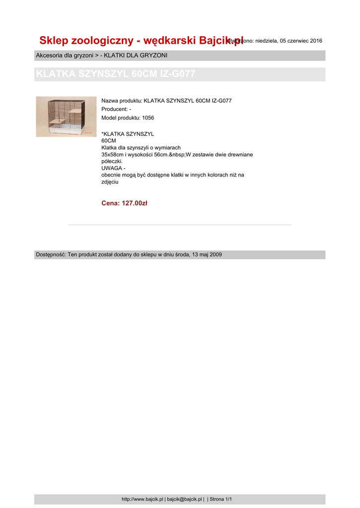Utworzono: niedziela, 05 czerwiec 2016 Sklep zoologiczny - wędkarski Bajcik.pl Akcesoria dla gryzoni > - KLATKI DLA GRYZONI KLATKA SZYNSZYL 60CM IZ-G077 Nazwa produktu: KLATKA SZYNSZYL 60CM IZ-G077 Producent: Model produktu: 1056 *KLATKA SZYNSZYL 60CM Klatka dla szynszyli o wymiarach 35x58cm i wysokości 56cm. W zestawie dwie drewniane półeczki. UWAGA obecnie mogą być dostępne klatki w innych kolorach niż na zdjęciu Cena: 127.00zł Dostępność: Ten produkt został dodany do sklepu w dniu środa, 13 maj 2009 http://www.bajcik.pl | [email protected] | | Strona 1/1