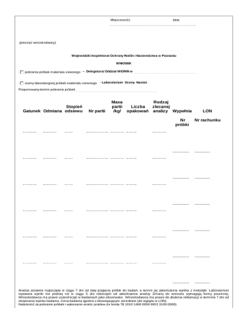 Miejscowość, data (pieczęć wnioskodawcy) Wojewódzki Inspektorat Ochrony Roślin i Nasiennictwa w Poznaniu WNIOSEK pobrania próbek materiału siewnego – Delegatura/ Oddział WIORiN w oceny laboratoryjnej próbek materiału siewnego - Laboratorium Oceny Nasion Proponowany termin pobrania próbek Stopień Gatunek Odmiana odsiewu Nr partii Masa Rodzaj partii Liczba zlecanej /kg/ opakowań analizy Wypełnia Nr próbki LON Nr rachunku ............... .............. ............... .............. ............... .............. ............... .............. ............... .............. ............... .............. Analiza zostanie rozpoczęta w ciągu 7 dni od daty przyjęcia próbki do badań, a termin jej zakończenia wynika z metodyki. Laboratorium wystawia wyniki nie później niż w ciągu 5 dni roboczych od zakończenia analizy. Zmiany do wniosku wymagają formy pisemnej. Wnioskodawca ma prawo uczestniczyć w badaniach jako obserwator. Wnioskodawca ma prawo do złożenia reklamacji w terminie 7 dni od otrzymania wyniku badania. Cena badania zgodna z obowiązującym cennikiem (do wglądu w LON). Należność za pobranie próbek i wykonanie analiz: przelew (nr konta 78 1010 1469 0059 5922 3100 0000) Sprawozdanie z badań ma zawierać niepewność pomiaru oszacowaną w laboratorium: TAK Nie Pozostałości próbki po roku przechowywania: Odbiór wyników: osobiście / do dyspozycji LON / zwrot do klienta pocztą Zapoznałem/-am się z listą metod i wyrażam zgodę na badanie próbek metodami stosowanymi w LON Osoba do kontaktu: Imię Nazwisko Nr telefonu L. p. Rodzaj badania Metoda objęta akredytacją PCA Metodyka Skróty do wpisania w rubrykę "Rodzaj zleconego badania" Lista metod badawczych stososwanych w Laboratorium Oceny Nasion WIORiN w Poznaniu 1 Oznacznie czystości nasion Tak International Rules for Seed Testing ISTA 2014 - Rozdział 3 Czy 2 Oznaczanie zawartości nasion innych roślin w sztukach Tak International Rules for Seed Testing ISTA 2014 - Rozdział 4 Czy 3 Oznaczanie zdolności kiełkowania nasion Tak International Rules for Seed Testing ISTA 2014 - Rozdział 5 Kieł 4 Oznaczanie wilgotności nasion metodą suszarkową stałej temperatury Tak International Rules for Seed Testing ISTA 2014 - Rozdział 9 Wilg 5 Oznaczanie masy 1000 nasion Tak International Rules for Seed Testing ISTA 2014 - Rozdział 10 MTN 6 Oznaczanie nasion gorzkich w łubinach pastewnych Nie International Rules for Seed Testing ISTA 2014 - Rozdział 8 Go 7 Oznaczanie zdrowotności nasion Nie Zdro Informacja o badaniach wymaganych dla poszczególnych rodzajów oceny laboratoryjnej Rodzaj oceny laboratoryjnej Grupa roślin Wymagane badania Ocena pierwotna Rośliny zbożowe - nasiona kategorii elitarne Czy, Szt, Kieł, Wilg, MTN Ocena pierwotna Rośliny zbożowe - nasiona kategorii kwalifikowane Czy, Szt, Kieł, MTN Ocena pierwotna Rośliny pastewne - bobowate grubonasienne Czy, Szt, Kieł, MTN Ocena pierwotna Rośliny pastewne - łubiny - odmiany słotkie Czy, Szt, Kieł, MTN, Go Ocena pierwotna Rośliny pastewne - pozostałe gatunki Czy, Szt, Kieł Ocena pierwotna Rośliny oleiste i włókniste - len, konopie, soja, słonecznik Czy, Szt, Kieł, Zdro Ocena pierwotna Rośliny oleiste i włókniste - rzepak Czy, Szt, Kieł, MTN Ocena pierwotna Rośliny oleiste i włóknista - pozostałe gatunki Czy, Szt, Kieł Ocena pierwotna Burak cukrowy i pastewny - nasiona otoczkowane Czy, Kieł Ocena pierwotna Burak cukrowy i pastewny - nasiona nieotoczkowane Czy, Kieł, Wilg Ocena pierwotna Rośliny warzywne Czy, Kieł Ocena powtórna Podział jak dla oceny pierwotnej Jak dla oceny pierwotnej Ocena okresowa Wszystkie gatunki Kieł