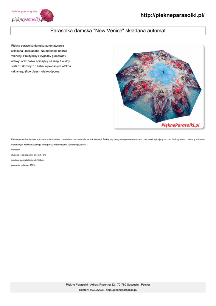 http://piekneparasolki.pl/ Parasolka damska "New Venice" składana automat Piękna parasolka damska automatycznie składana i rozkładana. Na materiale nadruk Wenecji. Praktyczny i wygodny gumowany uchwyt oraz pasek spinający na rzep. Solidny stelaż złożony z 8 żeber wykonanych włókna szklanego (fiberglass), wiatroodporna. Piękna parasolka damska automatycznie składana i rozkładana. Na materiale nadruk Wenecji. Praktyczny i wygodny gumowany uchwyt oraz pasek spinający na rzep. Solidny stelaż złożony z 8 żeber wykonanych włókna szklanego (fiberglass), wiatroodporna. Gwarancja jakości ! Wymiary: długość: po złożeniu: ok 32 cm średnica po rozłożeniu: ok 104 cm poszycie: poliester 100% Piękne Parasolki - Adres: Pszenna 32, 70-780 Szczecin, Polska Telefon: 503022933, http://piekneparasolki.pl/ http://piekneparasolki.pl/ Piękne Parasolki - Adres: Pszenna 32, 70-780 Szczecin, Polska Telefon: 503022933, http://piekneparasolki.pl/