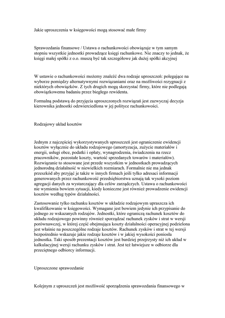 Jakie uproszczenia w księgowości mogą stosować małe firmy Sprawozdania finansowe / Ustawa o rachunkowości obowiązuje w tym samym stopniu wszystkie jednostki prowadzące księgi rachunkowe. Nie znaczy to jednak, że księgi małej spółki z o.o. muszą być tak szczegółowe jak dużej spółki akcyjnej W ustawie o rachunkowości możemy znaleźć dwa rodzaje uproszczeń: polegające na wyborze pomiędzy alternatywnymi rozwiązaniami oraz na możliwości rezygnacji z niektórych obowiązków. Z tych drugich mogą skorzystać firmy, które nie podlegają obowiązkowemu badaniu przez biegłego rewidenta. Formalną podstawą do przyjęcia uproszczonych rozwiązań jest zazwyczaj decyzja kierownika jednostki odzwierciedlona w jej polityce rachunkowości. Rodzajowy układ kosztów Jednym z najczęściej wykorzystywanych uproszczeń jest ograniczenie ewidencji kosztów wyłącznie do układu rodzajowego (amortyzacja, zużycie materiałów i energii, usługi obce, podatki i opłaty, wynagrodzenia, świadczenia na rzecz pracowników, pozostałe koszty, wartość sprzedanych towarów i materiałów). Rozwiązanie to stosowane jest przede wszystkim w jednostkach prowadzących jednorodną działalność w niewielkich rozmiarach. Formalnie nie ma jednak przeszkód aby przyjąć je także w innych firmach jeśli tylko adresaci informacji generowanych przez rachunkowość przedsiębiorstwa uznają tak wysoki poziom agregacji danych za wystarczający dla celów zarządczych. Ustawa o rachunkowości nie wymienia bowiem sytuacji, kiedy konieczne jest również prowadzenie ewidencji kosztów według typów działalności. Zastosowanie tylko rachunku kosztów w układzie rodzajowym upraszcza ich kwalifikowanie w księgowości. Wymagane jest bowiem jedynie ich przypisanie do jednego ze wskazanych rodzajów. Jednostki, które ograniczą rachunek kosztów do układu rodzajowego powinny również sporządzać rachunek zysków i strat w wersji porównawczej, w której część obejmująca koszty działalności operacyjnej podzielona jest właśnie na poszczególne rodzaje kosztów. Rachunek zysków i strat w tej wersji bezpośrednio wskazuje jakie rodzaje kosztów i w jakiej wysokości poniosła jednostka. Taki sposób prezentacji kosztów jest bardziej przejrzysty niż ich układ w kalkulacyjnej wersji rachunku zysków i strat. Jest też łatwiejsze w odbiorze dla przeciętnego odbiorcy informacji. Uproszczone sprawozdanie Kolejnym z uproszczeń jest możliwość sporządzenia sprawozdania finansowego w formie uproszczonej. Uprawnienie to wynika z art. 50 ust. 2 ustawy o rachunkowości. Przysługuje ono jednostkom, które w roku obrotowym, za który sporządzają sprawozdanie finansowe oraz w roku poprzedzającym ten rok obrotowy nie osiągnęły dwóch z następujących trzech wielkości: • średnioroczne zatrudnienie w przeliczeniu na pełne etaty wyniosło nie więcej niż 50 osób, • suma aktywów bilansu na koniec roku obrotowego w walucie polskiej nie przekroczyła równowartości 2 mln euro, • przychody netto ze sprzedaży produktów i towarów oraz operacji finansowych w walucie polskiej nie przekroczyły równowartości 4 mln euro. Firma, która korzysta z uproszczeń zawartych w art. 50 ust. 2 ustawy o rachunkowości w poszczególnych częściach sprawozdania może wykazywać jedynie informacje w zakresie oznaczonym literami i cyframi rzymskim bez dalszego uszczegółowienia. Dodatkowo, jeśli informacje dotyczące poszczególnych pozycji sprawozdania nie wystąpiły w jednostce zarówno w roku obrotowym, jak i za rok go poprzedzający, przy sporządzaniu sprawozdania pozycje te pomija się. Informacja dodatkowa również może być sporządzona w odpowiednio uproszczonej formie. Wymienione jednostki, z uwagi na fakt, że powyższe kryteria są niższe niż kryteria kwalifikujące do obowiązkowego badania sprawozdania finansowego, mogą także zrezygnować ze sporządzania sprawozdania z przepływu środków pieniężnych oraz zestawienia zmian w kapitale własnym, gdyż taki obowiązek mają jedynie jednostki podlegające obowiązkowi badania. Wątpliwości mogą dotyczyć spółki akcyjnej. To dlatego, że co do zasady, każda spółka akcyjna podlega obowiązkowemu badaniu. Teoretycznie uproszczenia nie mają więc do niej zastosowania. Osobiście skłaniałbym się jednak ku poglądowi, że o ile nie wpływa to na użyteczność sprawozdania finansowego (wierny i rzetelny obraz), o tyle uproszczenia dopuszczalne są w każdej jednostce. Moim zdaniem, użyteczność powinna być oceniana przez pryzmat adresatów sprawozdania (faktycznych, nie potencjalnych). Brak podatku odroczonego Zgodnie z art. 37 ust. 10 ustawy o rachunkowości jednostki, które nie mają obowiązku badania sprawozdania finansowego, mogą również nie tworzyć aktywów oraz rezerw na odroczony podatek dochodowy. Zadaniem aktywów i rezerw na odroczony podatek dochodowy jest zneutralizowanie różnic pomiędzy wynikiem finansowym wykazanym w sprawozdaniu finansowym jednostki, a jej dochodem do opodatkowania ustalonym zgodnie z ustawą o CIT. Różnice te wynikają z odmiennych zasad rozpoznawania momentu powstania przychodu oraz uznawania wydatków za koszt w prawie podatkowym i bilansowym. Jednak w mniejszych przedsiębiorstwach, gdzie struktura aktywów i pasywów jest zwykle nieskomplikowana, a które dodatkowo wykazują skłonność do stosowania w rachunkowości rozwiązań wynikających z przepisów podatkowych, różnice tego typu występują stosunkowo rzadko. Jeśli już się pojawią, to ich wartość zwykle jest niewielka. Z tego powodu pominięcie ustalania aktywów i rezerw z tytułu odroczonego podatku dochodowego nie wpływa w istotny sposób na obraz przedsiębiorstwa wynikający ze sprawozdania finansowego. Ustawodawca uznał więc, że nakład pracy potrzebny do ustalenia odpowiednich wielkości byłby niewspółmierny do uzyskiwanych korzyści. Kwalifikacja umów leasingu Co do zasady, większo