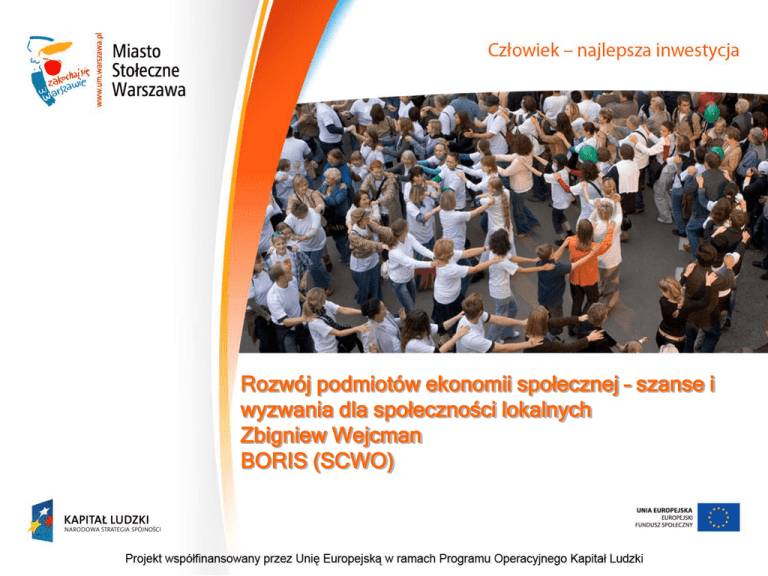Rozwój podmiotów ekonomii społecznej – szanse i wyzwania dla społeczności lokalnych Zbigniew Wejcman BORIS (SCWO) Rozwój podmiotów ekonomii społecznej – szanse i wyzwania dla społeczności lokalnych Zbigniew Wejcman BORIS (SCWO) EKONOMIA SPOŁECZNA • Polega na skutecznej działalności ekonomicznej podporządkowanej wyraźnemu celowi społecznemu. • Przedsiębiorczość społeczna poszukuje rozwiązań trwałych, efektywnych i w największym stopniu uniezależniających: - osoby, rodziny, grupy - organizacje pozarządowe (z dz. gospodarczą) - lokalne społeczności 3 KRĘGI EKONOMII SPOŁECZNEJ (KPRES 2012) Podmioty mające umożliwić reintegrację społeczną i zawodową osób zagrożonych wykluczeniem społecznym, tj. ZAZ, WTZ, CIS, KIS Podmioty o charakterze pożytku publicznego, które prowadzą działalność ekonomiczną, zatrudniają pracowników, choć ich działanie nie jest oparte na ryzyku ekonomicznym. Są to głównie organizacje. Podmioty o charakterze rynkowym, które jednak tworzone były w związku z realizacją celu społecznego, bądź dla których leżący we wspólnym interesie cel społeczny jest racją bytu działalności komercyjnej (np. spółdzielnie socjalne) LOKALNY KONTEKST ES • • • • nowe produkty lub nowa jakość produkowanych dóbr (innowacyjny charakter podejmowanych działań, uwzględnianie aspektów etycznych, równościowych) nowe metody organizacji i/lub produkcji dóbr lub usług (włączanie partnerów, np. JST i przedsiębiorców w tworzenie nowych miejsc pracy, zawiązywanie partnerstw lokalnych na rzecz rozwoju ekonomii społecznej) angażowanie wolontariuszy/ mieszkańców, włączanie się w działania na rzecz społeczności lokalnej wykraczające poza wymiar ekonomiczny PES oferta pracy i produktu skierowana jest do najbliższej społeczności WYBRANE WYZWANIA LOKALNE • zwiększanie współpracy z innymi lokalnymi PES – rzecznictwo wobec JST, wspólne projekty i działania, wymiana zasobów, informacji • inicjowanie i/lub aktywne włączanie się w budowanie partnerstw międzysektorowych z udziałem JST, biznesu, mieszkańców (również pod kątem RLKS 2014-2020) • profesjonalizacja – udział w szkoleniach, korzystanie z ofert doradczych i finansowych (np. OWES, ROEFS, SPLOT i lokalnych centrów wsparcia, LGD, LOG i in.) WYBRANE WYZWANIA LOKALNE • aktywne zachęcanie JST do stosowania innowacyjnych narzędzi wsparcia działań obywatelskich (klauzule społeczne, inicjatywa lokalna, małe dotacje, fundusze pożyczkowe i wkładu własnego, wspólne projekty, współtworzenie PES…) • praca nad lokalnymi planami, strategiami, udział w tworzeniu polityk publicznych na każdym szczeblu JST • otwarcie się na współpracę z lokalnymi partnerami, którzy coraz częściej działają jak organizacje pozarządowe: biznes zaangażowany społecznie, CAL, aktywne biblioteki, partnerstwa lokalne, ZOZ LOKALNE PROGRAMY WSPARCIA ES • Władze i instytucje samorządowe oraz organizacje pozarządowe mogą dzielić się odpowiedzialnością za rozwój lokalnej przedsiębiorczości społecznej • Przykładem jest Miejsko-Gminny Program Wspierania Ekonomii Społecznej w Powiecie Wałbrzyskim oraz Mieście Świdnica (2008) i Program z gminy Żmigród (2009) z woj. dolnośląskiego PARTNERSTWO W ROZWOJU STRATEGII ES Organizacje mogą być promotorem odpowiednich rozwiązań prawnych i zapisów wspierających przedsiębiorczość społeczną w kluczowych dokumentach JST – strategii rozwiązywania problemów społecznych, strategii rozwoju JST, Programu Współpracy – lub w odrębnych programach lokalnych. Przykład: Partnerstwo „Nasza 19” opracowało strategię rozwiązywania problemów społecznych gminy Słupno. PARTNERSTWO W ROZWOJU STRATEGII ES • Przykład: Partnerstwo „Nasza 19” na przełomie 2008 i 2009 r. pracowało nad nowelizacją gminnej strategii rozwiązywania problemów społecznych 6-tysięcznej wiejskiej gm. Słupno. • Jako VII Cel Strategiczny uzgodniono „Wsparcie podmiotów ekonomii społecznej i wsparcie powstawania nowych”. Efektem wdrożenia strategii stało się powołanie w 2012 r. spółdzielni socjalnej utworzonej przez osoby prawne „Centrum Usług Środowiskowych” REWITALIZACJA SPOŁECZNA WSPÓLNYM WYZWANIEM • Działania na rzecz rozwoju wspólnoty lokalnej – rewitalizacja, aktywizacja lokalna - w oparciu o zasoby własne są jedną z podstawowych form działalności w ramach Ekonomii Społecznej. • Podmiotami ES długofalowo wpływającymi na rozwój społeczności, w których funkcjonują są Partnerstwa Lokalne. Szczególną rolę Partnerstwa odgrywają w społecznościach marginalizowanych i zdegradowanych (przykład gm. Bałtów, Sieci Grup Partnerskich oraz modelu pomorskiego, Mazowiecka i Warszawska Sieć Partnerstw Lokalnych). INNE FORMY LOKALNEGO WSPARCIA PES • Polityka lokalowa (uchwała/ program) umożliwia PES wynajem po preferencyjnych stawkach lokali na prowadzenie działań ekonomizacyjnych • JST (region, powiat, gmina) wyodrębnia fundusz (celowy, rezerwowy) na pożyczki wewnętrzne, poręczenia do instytucji zewnętrznych • JST zakupuje u PES usługi/ towary w oparciu o ustawę o zamówieniach publicznych z zastosowaniem w tych zamówieniach klauzule społeczne (preferencje dla PES) KLAUZULA SPOŁECZNA Wprowadzona poprzez zmianę ustawy o spółdzielniach socjalnych (art. 29, ust. 4 ustawy Prawo zamówień publicznych) umożliwia stosowanie przez zamawiającego preferencji dotyczących wykonawców, stosujących instrumenty wspomagające pracowników, w szczególności należących do grup wykluczonych z rynku pracy Klauzula dotycząca osób niepełnosprawnych, bardziej restrykcyjna (art. 22, ust. 2 ustawy Prawo zamówień publicznych), umożliwia zamknięcie ubiegania się o zamówienie publicznie wyłącznie do wykonawców, u których ponad 50% zatrudnionych pracowników stanowią osoby niepełnosprawne INNE FORMY LOKALNEGO WSPARCIA PES 
