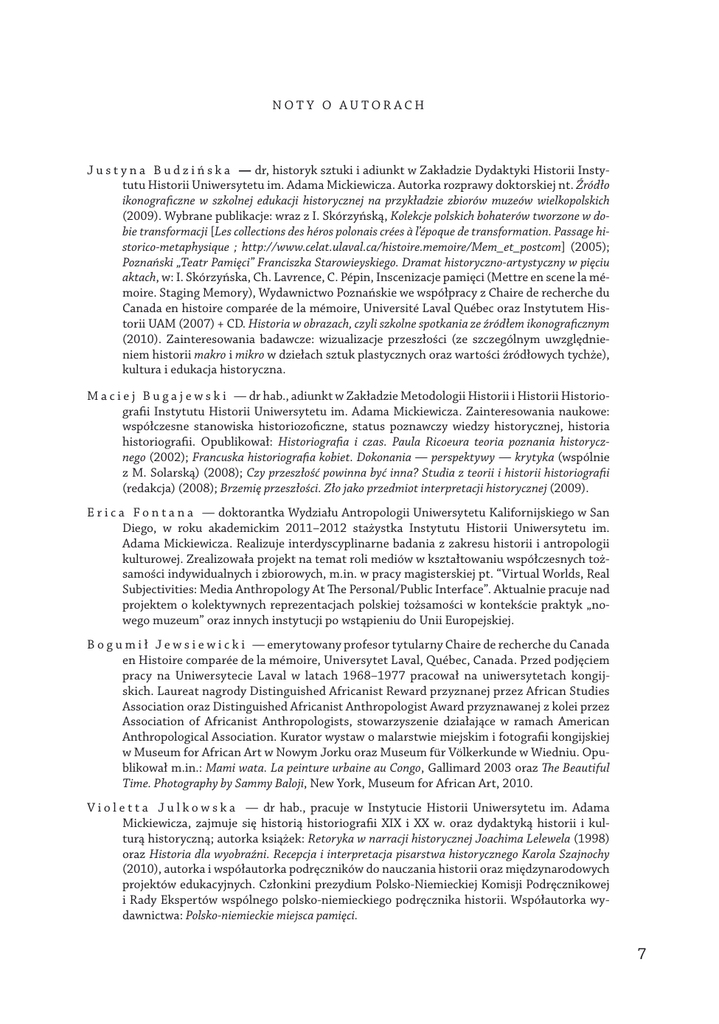 NOTY O AUTOR ACH J u s t y n a B u d z i ń s k a — dr, historyk sztuki i adiunkt w Zakładzie Dydaktyki Historii Instytutu Historii Uniwersytetu im. Adama Mickiewicza. Autorka rozprawy doktorskiej nt. Źródło ikonograficzne w szkolnej edukacji historycznej na przykładzie zbiorów muzeów wielkopolskich (2009). Wybrane publikacje: wraz z I. Skórzyńską, Kolekcje polskich bohaterów tworzone w dobie transformacji [Les collections des héros polonais crées à l’époque de transformation. Passage historico-metaphysique ; http://www.celat.ulaval.ca/histoire.memoire/Mem_et_postcom] (2005); Poznański „Teatr Pamięci” Franciszka Starowieyskiego. Dramat historyczno-artystyczny w pięciu aktach, w: I. Skórzyńska, Ch. Lavrence, C. Pépin, Inscenizacje pamięci (Mettre en scene la mémoire. Staging Memory), Wydawnictwo Poznańskie we współpracy z Chaire de recherche du Canada en histoire comparée de la mémoire, Université Laval Québec oraz Instytutem Historii UAM (2007) + CD. Historia w obrazach, czyli szkolne spotkania ze źródłem ikonograficznym (2010). Zainteresowania badawcze: wizualizacje przeszłości (ze szczególnym uwzględnieniem historii makro i mikro w dziełach sztuk plastycznych oraz wartości źródłowych tychże), kultura i edukacja historyczna. M a c i e j B u g a j e w s k i — dr hab., adiunkt w Zakładzie Metodologii Historii i Historii Historiografii Instytutu Historii Uniwersytetu im. Adama Mickiewicza. Zainteresowania naukowe: współczesne stanowiska historiozoficzne, status poznawczy wiedzy historycznej, historia historiografii. Opublikował: Historiografia i czas. Paula Ricoeura teoria poznania historycznego (2002); Francuska historiografia kobiet. Dokonania — perspektywy — krytyka (wspólnie z M. Solarską) (2008); Czy przeszłość powinna być inna? Studia z teorii i historii historiografii (redakcja) (2008); Brzemię przeszłości. Zło jako przedmiot interpretacji historycznej (2009). E r i c a F o n t a n a — doktorantka Wydziału Antropologii Uniwersytetu Kalifornijskiego w San Diego, w roku akademickim 2011–2012 stażystka Instytutu Historii Uniwersytetu im. Adama Mickiewicza. Realizuje interdyscyplinarne badania z zakresu historii i antropologii kulturowej. Zrealizowała projekt na temat roli mediów w kształtowaniu współczesnych tożsamości indywidualnych i zbiorowych, m.in. w pracy magisterskiej pt. “Virtual Worlds, Real Subjectivities: Media Anthropology At The Personal/Public Interface”. Aktualnie pracuje nad projektem o kolektywnych reprezentacjach polskiej tożsamości w kontekście praktyk „nowego muzeum” oraz innych instytucji po wstąpieniu do Unii Europejskiej. B o g u m i ł J e w s i e w i c k i — emerytowany profesor tytularny Chaire de recherche du Canada en Histoire comparée de la mémoire, Universytet Laval, Québec, Canada. Przed podjęciem pracy na Uniwersytecie Laval w latach 1968–1977 pracował na uniwersytetach kongijskich. Laureat nagrody Distinguished Africanist Reward przyznanej przez African Studies Association oraz Distinguished Africanist Anthropologist Award przyznawanej z kolei przez Association of Africanist Anthropologists, stowarzyszenie działające w ramach American Anthropological Association. Kurator wystaw o malarstwie miejskim i fotografii kongijskiej w Museum for African Art w Nowym Jorku oraz Museum für Völkerkunde w Wiedniu. Opublikował m.in.: Mami wata. La peinture urbaine au Congo, Gallimard 2003 oraz The Beautiful Time. Photography by Sammy Baloji, New York, Museum for African Art, 2010. V i o l e t t a J u l k o w s k a — dr hab., pracuje w Instytucie Historii Uniwersytetu im. Adama Mickiewicza, zajmuje się historią historiografii XIX i XX w. oraz dydaktyką historii i kulturą historyczną; autorka książek: Retoryka w narracji historycznej Joachima Lelewela (1998) oraz Historia dla wyobraźni. Recepcja i interpretacja pisarstwa historycznego Karola Szajnochy (2010), autorka i współautorka podręczników do nauczania historii oraz międzynarodowych projektów edukacyjnych. Członkini prezydium Polsko-Niemieckiej Komisji Podręcznikowej i Rady Ekspertów wspólnego polsko-niemieckiego podręcznika historii. Współautorka wydawnictwa: Polsko-niemieckie miejsca pamięci. 7 Noty o autorach B a r t o s z K o r z e n i e w s k i — dr hab., pracuje w Instytucie Etnologii i Antropologii Kulturowej Uniwersytetu im. Adama Mickiewicza. Prowadzi badania dotyczące pamięci zbiorowej, polityki pamięci w Polsce i w Niemczech. Autor książek: Polityczne rytuały pokuty w perspektywie zagadnienia autonomii jednostki (2006), Święta polityczne w zjednoczonych Niemczech (2007), Transformacja pamięci. Przewartościowania w pamięci przeszłości a wybrane aspekty funkcjonowania dyskursu publicznego o przeszłości w Polsce po 1989 roku (2010); redaktor prac zbiorowych na temat pamięci społecznej. Organizator projektu badawczego Polskie Miejsca Pamięci. A l e k s a n d r a Ł o p i ń s k a is Ph. D. student in the Institute of Eastern Studies at the Adam Mickiewicz University, Poznań. She holds an MA in international relations from AMU. Her research interests include migration issues, particularly in the North-East Asia, contemporary political situation in the Russian Federation and Russian-Chinese relations at the local and global level. She is the author of publications devoted to energy security in Asia and transborder cooperation between Russia and the Peoples Republic of China. I v a n P e s h k o v — P h . D., is a Russian-Polish social anthropologist. He has been working as an assistant professor since 2004 (the Institute of Eastern Studies, Adam Mickiewicz University) and cooperated with the Chinese Economic Association (UK). Main fields of interest: transborder studies, the Chinese-Russian relations and quasi-indigenousness in Inner Asia. M a ł g o r z a t a P r a c z y k — dr, adiunkt w Instytucie Historii Uniwersytetu im. Adama Mickiewicza. Obroniła