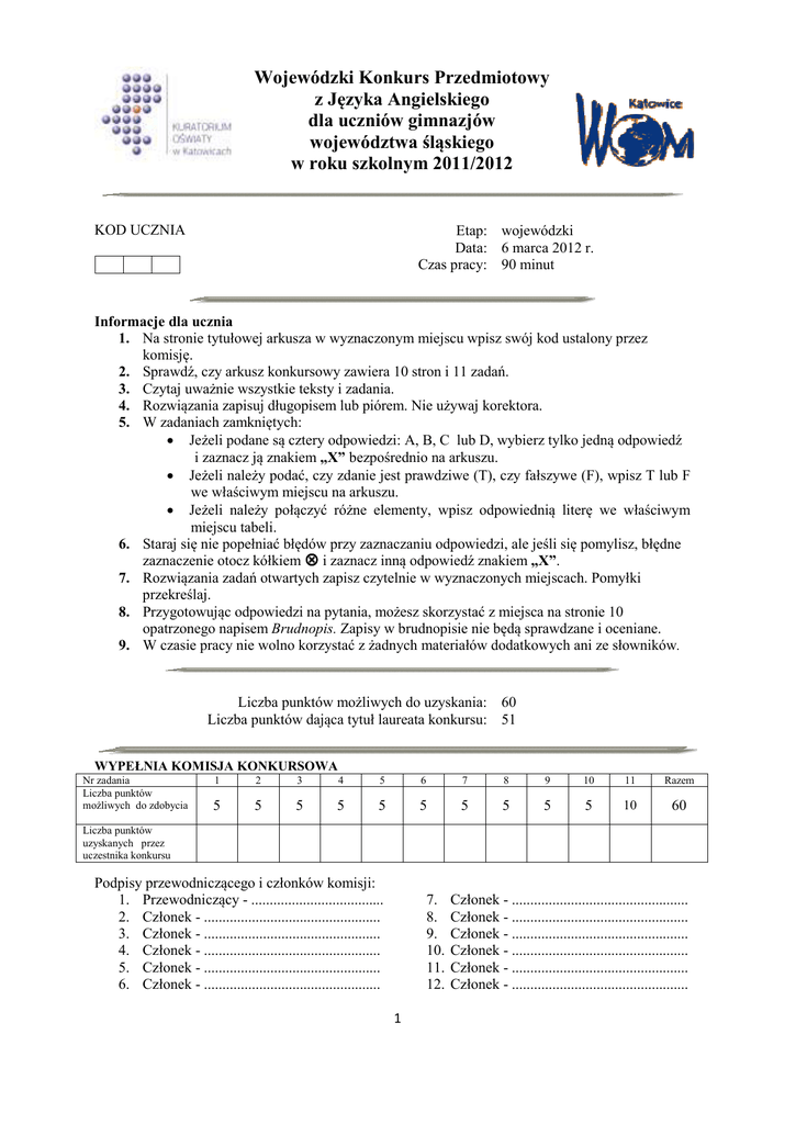 Wojewódzki Konkurs Przedmiotowy z Języka Angielskiego dla uczniów gimnazjów województwa śląskiego w roku szkolnym 2011/2012 KOD UCZNIA Etap: wojewódzki Data: 6 marca 2012 r. Czas pracy: 90 minut Informacje dla ucznia 1. Na stronie tytułowej arkusza w wyznaczonym miejscu wpisz swój kod ustalony przez komisję. 2. Sprawdź, czy arkusz konkursowy zawiera 10 stron i 11 zadań. 3. Czytaj uważnie wszystkie teksty i zadania. 4. Rozwiązania zapisuj długopisem lub piórem. Nie używaj korektora. 5. W zadaniach zamkniętych: • Jeżeli podane są cztery odpowiedzi: A, B, C lub D, wybierz tylko jedną odpowiedź i zaznacz ją znakiem „X” bezpośrednio na arkuszu. • Jeżeli należy podać, czy zdanie jest prawdziwe (T), czy fałszywe (F), wpisz T lub F we właściwym miejscu na arkuszu. • Jeżeli należy połączyć różne elementy, wpisz odpowiednią literę we właściwym miejscu tabeli. 6. Staraj się nie popełniać błędów przy zaznaczaniu odpowiedzi, ale jeśli się pomylisz, błędne zaznaczenie otocz kółkiem i zaznacz inną odpowiedź znakiem „X”. 7. Rozwiązania zadań otwartych zapisz czytelnie w wyznaczonych miejscach. Pomyłki przekreślaj. 8. Przygotowując odpowiedzi na pytania, możesz skorzystać z miejsca na stronie 10 opatrzonego napisem Brudnopis. Zapisy w brudnopisie nie będą sprawdzane i oceniane. 9. W czasie pracy nie wolno korzystać z żadnych materiałów dodatkowych ani ze słowników. Liczba punktów możliwych do uzyskania: 60 Liczba punktów dająca tytuł laureata konkursu: 51 WYPEŁNIA KOMISJA KONKURSOWA Nr zadania Liczba punktów możliwych do zdobycia 1 2 3 4 5 6 7 8 9 10 11 Razem 5 5 5 5 5 5 5 5 5 5 10 60 Liczba punktów uzyskanych przez uczestnika konkursu Podpisy przewodniczącego i członków komisji: 1. Przewodniczący - .................................... 2. Członek - ................................................ 3. Członek - ................................................ 4. Członek - ................................................ 5. Członek - ................................................ 6. Członek - ................................................ 7. 8. 9. 10. 11. 12. 1 Członek - ................................................ Członek - ................................................ Członek - ................................................ Członek - ................................................ Członek - ................................................ Członek - ................................................ Zadanie 1 (0 – 5) Uzupełnij poniższe zdania dotyczące Stanów Zjednoczonych, wybierając właściwą odpowiedź. Zaznacz literę A, B, C lub D znakiem „X”. Za każdą poprawną odpowiedź otrzymasz 1 punkt. 1. The President of the United States is elected every ……………. years. A. six B. five C. four D. three 2. ………………… is an international coffeehouse chain founded in the 70s in Seattle. A. Taco Bell B. Starbucks C. Dunkin Donuts D. Burger King 3. Lance Armstrong is a famous American ……………….. . A. cyclist B. jazz musician C. astronaut D. fashion designer 4. Brad Pitt did not appear in …………………. . A. Troy B. Babel C. 12 Monkeys D. Pirates of the Caribbean 5. ‘The Oscars’ are commonly known in the US as ………………………… A. Golden Globe Awards B. Academy Awards C. BAFTA Awards D. MTV Movie Awards .....….p. / 5p. Zadanie 2 (0 – 5) Uzupełnij brakujące informacje dotyczące Stanów Zjednoczonych Ameryki Północnej. Wpisz odpowiednie wyrazy w języku angielskim. Za każdą w pełni poprawną odpowiedź otrzymasz 1 punkt. 1. ……………… …………………… (first name and surname) is the present Vice-president of the US. 2. Nashville is the centre of the …………………. music industry. 3. The Congress consists of two houses, the Senate and the House of ………………………… 4. The NBA stands for …………………… ………………..…… …………………..…….. 5. ……………… …………………… (first name and surname) was a film producer, creator and original voice of Mickey Mouse. .....….p. / 5p. 2 Zadanie 3 (0 – 5) Uzupełnij luki, przekształcając wyraz w nawiasie tak, aby otrzymać logiczne i poprawne gramatycznie zdania. Wymagana jest pełna poprawność ortograficzna wpisywanych wyrazów. Za każdą poprawną odpowiedź otrzymasz 1 punkt. 1. His flat consists of a ……………………. (SPACE) living room, a kitchen and a bathroom. 2. Pushing into a queue is considered extremely ………………………….……… (POLITE). 3. Tom would like to live in a quiet ……………………………………… .. (NEIGHBOUR). 4. I am filled with ………………………………………………... (ADMIRE) for your work. 5. His parents …………………………… (COURAGE) him to apply for the job in this bank. .....….p. / 5p. Zadanie 4 (0 – 5) Przetłumacz na język angielski podane w nawiasach fragmenty zdań, tak aby otrzymać logiczne i gramatycznie poprawne wypowiedzi. W częściach zdań w języku angielskim nie wolno niczego zmieniać. Za każdą poprawną odpowiedź otrzymasz 1 punkt. 1. Do you happen to know (jaki jest ich numer telefonu) ..………………………………… .………..……………………………... ? 2. This bridge (zostanie zbudowany) ……………………………………………………….. by the end of September. 3. (Gdybym był na jego miejscu) ……………………………..……………………… I would move to Warsaw. 4. (Zapytajmy )……………………………..…………. a police officer for help. 5. I told (mu, żeby się nie martwił) …………………………………………………………. but he looked really scared. .....….p. / 5p. Zadanie 5 (0 – 5) Wykorzystując podane tłustym drukiem wyrazy, uzupełnij każde z niedokończonych zdań tak,