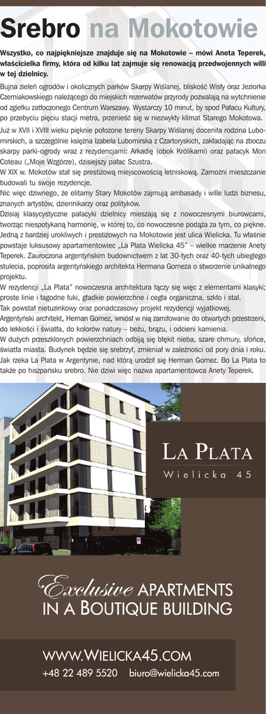 Srebro na Mokotowie Wszystko, co najpi´kniejsze znajduje si´ na Mokotowie – mówi Aneta Teperek, w∏aÊcicielka firmy, która od kilku lat zajmuje si´ renowacjà przedwojennych willi w tej dzielnicy. Bujna zieleƒ ogrodów i okolicznych parków Skarpy WiÊlanej, bliskoÊç Wis∏y oraz Jeziorka Czerniakowskiego nale˝àcego do miejskich rezerwatów przyrody pozwalajà na wytchnienie od zgie∏ku zat∏oczonego Centrum Warszawy. Wystarczy 10 minut, by spod Pa∏acu Kultury, po przebyciu pi´ciu stacji metra, przenieÊç si´ w niezwyk∏y klimat Starego Mokotowa. Ju˝ w XVII i XVIII wieku pi´knie po∏o˝one tereny Skarpy WiÊlanej doceni∏a rodzina Lubomirskich, a szczególnie ksi´˝na Izabela Lubomirska z Czartoryskich, zak∏adajàc na zboczu skarpy parki-ogrody wraz z rezydencjami: Arkadi´ (obok Królikarni) oraz pa∏acyk Mon Coteau („Moje Wzgórze), dzisiejszy pa∏ac Szustra. W XIX w. Mokotów sta∏ si´ presti˝owà miejscowoÊcià letniskowà. Zamo˝ni mieszczanie budowali tu swoje rezydencje. Nic wi´c dziwnego, ˝e elitarny Stary Mokotów zajmujà ambasady i wille ludzi biznesu, znanych artystów, dziennikarzy oraz polityków. Dzisiaj klasycystyczne pa∏acyki dzielnicy mieszajà si´ z nowoczesnymi biurowcami, tworzàc niespotykanà harmoni´, w której to, co nowoczesne podà˝a za tym, co pi´kne. Jednà z bardziej urokliwych i presti˝owych na Mokotowie jest ulica Wielicka. Tu w∏aÊnie powstaje luksusowy apartamentowiec „La Plata Wielicka 45” – wielkie marzenie Anety Teperek. Zauroczona argentyƒskim budownictwem z lat 30-tych oraz 40-tych ubieglego stulecia, poprosi∏a argentyƒskiego architekta Hermana Gomeza o stworzenie unikalnego projektu. W rezydencji „La Plata” nowoczesna architektura ∏àczy si´ wi´c z elementami klasyki; proste linie i ∏agodne ∏uki, g∏adkie powierzchne i ceg∏a organiczna, szk∏o i stal. Tak powsta∏ nietuzinkowy oraz ponadczasowy projekt rezydencji wyjatkowej. Argentyƒski architekt, Hernan Gomez, wniós∏ w nià zami∏owanie do otwartych przestrzeni, do lekkoÊci i Êwiat∏a, do kolorów natury – be˝u, bràzu, i odcieni kamienia. W du˝ych przeszklonych powierzchniach odbijà si´ b∏´kit nieba, szare chmury, s∏oƒce, Êwiat∏a miasta. Budynek b´dzie si´ srebrzy∏, zmienia∏ w zale˝noÊci od pory dnia i roku. Jak rzeka La Plata w Argentynie, nad którà urodzi∏ si´ Herman Gomez. Bo La Plata to tak˝e po hiszpaƒsku srebro. Nie dziwi wi´c nazwa apartamentowca Anety Teperek.
