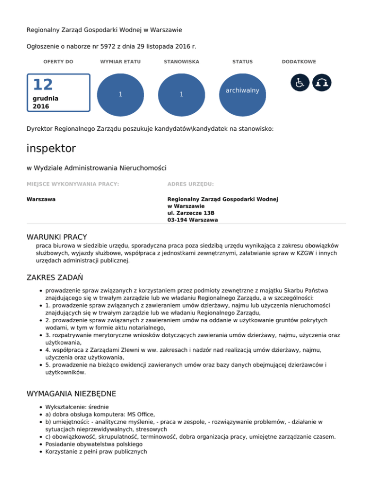 Regionalny Zarząd Gospodarki Wodnej w Warszawie Ogłoszenie o naborze nr 5972 z dnia 29 listopada 2016 r. OFERTY DO WYMIAR ETATU STANOWISKA 1 1 12 grudnia 2016 STATUS DODATKOWE archiwalny Dyrektor Regionalnego Zarządu poszukuje kandydatów\kandydatek na stanowisko: inspektor w Wydziale Administrowania Nieruchomości MIEJSCE WYKONYWANIA PRACY: ADRES URZĘDU: Warszawa Regionalny Zarząd Gospodarki Wodnej w Warszawie ul. Zarzecze 13B 03-194 Warszawa WARUNKI PRACY praca biurowa w siedzibie urzędu, sporadyczna praca poza siedzibą urzędu wynikająca z zakresu obowiązków służbowych, wyjazdy służbowe, współpraca z jednostkami zewnętrznymi, załatwianie spraw w KZGW i innych urzędach administracji publicznej. ZAKRES ZADAŃ prowadzenie spraw związanych z korzystaniem przez podmioty zewnętrzne z majątku Skarbu Państwa znajdującego się w trwałym zarządzie lub we władaniu Regionalnego Zarządu, a w szczególności: 1. prowadzenie spraw związanych z zawieraniem umów dzierżawy, najmu lub użyczenia nieruchomości znajdujących się w trwałym zarządzie lub we władaniu Regionalnego Zarządu, 2. prowadzenie spraw związanych z zawieraniem umów na oddanie w użytkowanie gruntów pokrytych wodami, w tym w formie aktu notarialnego, 3. rozpatrywanie merytoryczne wniosków dotyczących zawierania umów dzierżawy, najmu, użyczenia oraz użytkowania, 4. współpraca z Zarządami Zlewni w ww. zakresach i nadzór nad realizacją umów dzierżawy, najmu, użyczenia oraz użytkowania, 5. prowadzenie na bieżąco ewidencji zawieranych umów oraz bazy danych obejmującej dzierżawców i użytkowników. WYMAGANIA NIEZBĘDNE Wykształcenie: średnie a) dobra obsługa komputera: MS Office, b) umiejętności: - analityczne myślenie, - praca w zespole, - rozwiązywanie problemów, - działanie w sytuacjach nieprzewidywalnych, stresowych c) obowiązkowość, skrupulatność, terminowość, dobra organizacja pracy, umiejętne zarządzanie czasem. Posiadanie obywatelstwa polskiego Korzystanie z pełni praw publicznych Nieskazanie prawomocnym wyrokiem za umyślne przestępstwo lub umyślne przestępstwo skarbowe WYMAGANIA DODATKOWE doświadczenie zawodowe: 2 lata znajomość ustawy prawo wodne, ustawy o gospodarce nieruchomościami DOKUMENTY I OŚWIADCZENIA NIEZBĘDNE Życiorys/CV i list motywacyjny Kopie dokumentów potwierdzających spełnienie wymagania niezbędnego w zakresie wykształcenia kopie dokumentów potwierdzających wymagane doświadczenie zawodowe (kopie świadectw pracy, zaświadczeń o zatrudnieniu, dokumentów świadczących o wszystkich posiadanych umiejętnościach) w przypadku posiadania takiego doświadczenia Oświadczenie o posiadaniu obywatelstwa polskiego albo kopia dokumentu potwierdzającego posiadanie polskiego obywatelstwa Oświadczenie o wyrażeniu zgody na przetwarzanie danych osobowych do celów naboru Oświadczenie o korzystaniu z pełni praw publicznych Oświadczenie o nieskazaniu prawomocnym wyrokiem za umyślne przestępstwo lub umyślne przestępstwo skarbowe DOKUMENTY I OŚWIADCZENIA DODATKOWE kopia dokumentu potwierdzającego niepełnosprawność - w przypadku kandydatek/kandydatów, zamierzających skorzystać z pierwszeństwa w zatrudnieniu w przypadku, gdy znajdą się w gronie najlepszych kandydatek/kandydatów Kopie dokumentów potwierdzających spełnienie wymagania dodatkowego w zakresie doświadczenia zawodowego / stażu pracy kwestionariusz osobowy dla osoby ubiegającej się o zatrudnienie TERMINY I MIEJSCE SKŁADANIA DOKUMENTÓW Dokumenty należy złożyć do: 12 grudnia 2016 r. Decyduje data: stempla pocztowego / osobistego dostarczenia oferty do urzędu Miejsce składania dokumentów: Wymagane dokumenty należy złożyć lub przesłać w zamkniętej kopercie w ww. terminie i pod wskazany adres w ogłoszeniu z wyraźnym dopiskiem w liście motywacyjnym i na kopercie "Inspektor w Wydziale Administrowania Nieruchomościami”. INNE INFORMACJE: W miesiącu poprzedzającym datę upublicznienia ogłoszenia wskaźnik zatrudnienia osób niepełnosprawnych w urzędzie, w rozumieniu przepisów o rehabilitacji zawodowej i społecznej oraz zatrudnianiu osób niepełnosprawnych, nie wynosi co najmniej 6%. Aplikacje, które wpłyną po wyżej wymienionym terminie lub nie będą zawierały któregokolwiek dokumentu z wymaganych, nie będą rozpatrywane (o ważności aplikacji decyduje data stempla pocztowego w przypadku wysłania pocztą lub data wpływu w przypadku osobistego dostarczenia dokumentów). Wszystkie oświadczenia, CV i list motywacyjny muszą być opatrzone datą i własnoręcznym podpisem. Aplikacje przesłane drogą elektroniczną nie będą przyjmowane. Kandydaci zakwalifikowani do kolejnego etapu naboru zostaną powiadomieni o jego terminie. Osoby, których oferty zostaną rozpatrzone negatywnie nie będą o tym informowane. Oświadczenia oraz kwestionariusze osobowe dla osób ubiegających się o zatrudnienie mogą być składane zgodnie ze wzorami nr 1 i nr 2 zamieszczonymi na stronie www.warszawa.rzgw.gov.pl w zakładce: Ogłoszenia/Praca Dodatkowe informacje można uzyskać pod nr tel.(22) 58-70-420/222 Legenda Pierwszeństwo dla osób z niepełnosprawnościami Ogłoszenie z tym symbolem oznacza, że pierwszeństwo w zatrudnieniu mają osoby z niepełnosprawnościami, które spełniają wszystkie następujące warunki: • złożyły w terminie ofertę wraz z dokumentem potwierdzającym niepełnosprawność, • spełniają warunki wymienione w ogłoszeniu, • po rekrutacji znalazły się w gronie najlepszych kandydatów. Zastępstwo Ogłoszenie z tym symbolem oznacza, że urząd poszukuje kandydatów do pracy na czas przewidywanej nieobecności swojego pracownika. Jeśli w ogłoszeniu nie wskazano okresu zastępstwa, możesz o to spytać w urzędzie. Osoba zatrudniona na zastępstwo jest członkiem korpusu służby cywilnej. Nabór otwarty dla cudzoziemców Ogłoszenie z tym symbolem oznacza, że o stanowisko mogą starać się, poza