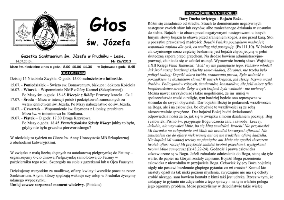 Głos św. Józefa Gazetka Sanktuarium św. Józefa w Prudniku – Lesie. Nr 26/2013 14.07.2013 r. Msze św. niedzielne u nas o godz.: 8.00 10.00 11.30 w Dębowcu o godz. 8.45 OGŁOSZENIA Dzisiaj 15 Niedziela Zwykła. O godz. 15.00 nabożeństwo fatimskie. 15.07. - Poniedziałek – Święto św. Bonawentury, biskupa i doktora Kościoła 16.07. - Wtorek – Wspomnienie NMP z Góry Karmel (Szkaplerznej) Po Mszy św. o godz. 18.45 Wieczór z Biblią: Prorocy Izraela - Cz. I 17.07. - Środa – Msza w intencji próśb i podziękowań zanoszonych za wstawiennictwem św. Józefa. Po Mszy nabożeństwo do św. Józefa. 18.07. - Czwartek – Wspomnienie św. Szymona z Lipnicy, prezbitera Msza św. w imieninowa br. Emiliana. 19.07. - Piątek – O godz. 17.30 Droga Krzyżowa. Po Mszy o godz. 18.45 Franciszkańska Szkoły Wiary: Jakby to było, gdyby nie było grzechu pierworodnego? W niedzielę za tydzień na Górze św. Anny Uroczystość MB Szkaplerznej z obchodami kalwaryjskimi. W związku z małą liczbą chętnych na autokarową pielgrzymkę do Fatimy – organizujemy 6-cio dniową Pielgrzymkę samolotową do Fatimy w październiku tego roku. Szczegóły na stole z gazetkami lub u Ojca Faustyna. Dziękujemy wszystkim za modlitwę, ofiary, kwiaty i wszelkie prace na rzecz Sanktuarium. A tym, którzy spędzają wakacje czy urlop w Prudniku życzymy udanego wypoczynku. Umiej zawsze rozpoznać moment właściwy. (Pittakos) ROZWAŻANIE NA NIEDZIELĘ Dary Ducha świętego – Bojaźń Boża. Różni się zasadniczo od strachu. Strach to domniemanie negatywnych następstw swoich słów lub czynów, albo zaniechanego działania w stosunku do siebie. Bojaźń – to obawa przed negatywnymi następstwami u innych. Innymi słowy bojaźń to obawa przed zranieniem kogoś, a nie przed karą. Stoi u początku prawdziwej mądrości: Bojaźń Pańska początkiem mądrości; wspaniała zapłata dla tych, co według niej postępują (Ps 111,10). W świecie zła czynionego coraz częściej bezkarnie, jest bojaźń chyba jedyną w pełni skuteczną zaporą przed grzechem. Na drodze bowiem administracyjnoprawnej, zła nie da się w całości usunąć. Wymownie brzmią słowa Wojskiego z XII Księgi Pana Tadeusza: "Ach! wy nie pamiętacie tego, Państwo młodzi! Jak śród naszej burzliwej szlachty samowładnej, Zbrojnej, nie trzeba było policyi żadnej; Dopóki wiara kwitła, szanowano prawa, Była wolność z porządkiem i z dostatkiem sława! W innych krajach, jak słyszę, trzyma urząd drabów, Policyjantów różnych, żandarmów, konstablów; Ale jeśli miecz tylko bezpieczeństwa strzeże, Żeby w tych krajach była wolność - nie uwierzę". Można nawet zaryzykować i takie uogólnienie, że im mniej w społeczeństwie troski o religię, tym bardziej będzie ono represywne w stosunku do swych obywateli. Dar bojaźni Bożej to podarunek wrażliwości: na Boga, ale i na człowieka. bo obydwie te wrażliwości są ze sobą nierozerwalnie sprzężone. Dar bojaźni Bożej budzi świadomość odpowiedzialności za to, jak się w związku z moim działaniem poczują: Bóg i człowiek. Pismo św. przypisuje Bogu uczucia żalu i zawodu: Lecz ty, Jakubie, nie wzywałeś Mnie, bo się Mną znudziłeś, Izraelu! Nie przyniosłeś Mi baranka na całopalenie ani Mnie nie uczciłeś krwawymi ofiarami. Nie zmuszałem cię do ofiary niekrwawej ani cię nie trudziłem ofiarą kadzidła. Nie kupiłeś Mi wonnej trzciny za pieniądze ani Mnie nie upoiłeś tłuszczem twoich ofiar; raczej Mi przykrość zadałeś twoimi grzechami, występkami twoimi Mnie zamęczasz (Iz 43,22-24). Godność i prawa człowieka zakotwiczone są w Bogu. Jeżeli zabraknie odniesienia do Boga, staną się tyle warte, ile papier na którym zostały zapisane. Bojaźń Boga przemienia człowieka z niewolnika w przyjaciela Boga. Człowiek żyjący Bożą bojaźnią nigdy nie postawi bezdennie głupiego pytania: co mi zrobisz? Komuś kto niestety opadł na tak niski poziom myślenia, zwyczajnie nie ma się ochoty zrobić niczego, sam bowiem kontakt z kimś taki jest udręką. Rzecz w tym, że zadający to pytanie nie zdaje sobie z tego sprawy i na tym właśnie polega jego ogromny problem. Może przeżyliśmy w dzieciństwie takie wielce pouczające doświadczenie: kiedy wywinęliśmy naprawdę porządny numer, reakcją rodziców było pełne bólu milczenie. Jak wtedy chcieliśmy, żeby na nas nakrzyczeli, żeby nas zbili. Ta cisza była najgorszą karą. Może będzie tak, że wielkim grzesznikom Pan Bóg także nie będzie miał niczego do powiedzenia, a to Boże milczenie będzie najgorszą i w tym wypadku wieczną karą? Jeśli Pan bóg będzie miał o coś do nas pretensje i to nam powie, nie będzie z nami wtedy jeszcze tak źle. Może czyściec to będzie czas słuchania Bożych pretensji. Kto wie... Warto kultywować w sobie Bożą bojaźń, by zdołała nas ona powstrzymać przed grzechem śmiertelnym. Pielęgnowanie Bożej bojaźni będzie polegało na kształtowaniu w sobie szacunku do spraw Bożych; na Spowiedzi św. i Komunii świętej wynagradzającej pierwszopiątkowej; na wytrwałym karczowaniu ze swego życia grzechów lekkich i niedoskonałości moralnych. Na oddawaniu Bogu czci należnej. Tak żyjąc, za łaską Bożą ustrzeżemy się grzechu ciężkiego – największego nieszczęścia człowieka. Z kolei bagatelizowanie drobnych nieuczciwości i niewierności to równia pochyła. Przestrzega przed nią Pan Jezus w przypowieści o przewrotnych rolnikach: Posłuchajcie innej przypowieści! Był pewien gospodarz, który założył winnicę. Otoczył ją murem, wykopał w niej tłocznię, zbudował wieżę, w końcu oddał ją w dzierżawę rolnikom i wyjechał. Gdy nadszedł czas zbiorów, posłał swoje sługi do rolników, by odebrali plon jemu należny. Ale rolnicy chwycili jego sługi i jednego obili, drugiego zabili, trzeciego zaś ukamienowali. Wtedy posłał inne sługi, więcej niż za pierwszym razem, lecz i z nimi tak s
