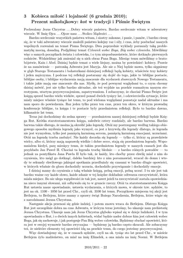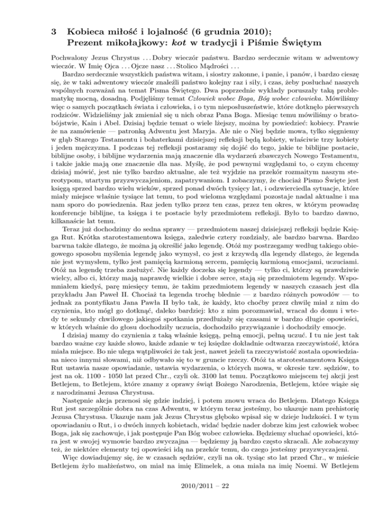 3 Kobieca miłość i lojalność (6 grudnia 2010); Prezent mikołajkowy: kot w tradycji i Piśmie Świętym Pochwalony Jezus Chrystus . . . Dobry wieczór państwu. Bardzo serdecznie witam w adwentowy wieczór. W Imię Ojca . . . Ojcze nasz . . . Stolico Mądrości . . . Bardzo serdecznie wszystkich państwa witam, i siostry zakonne, i panie, i panów, i bardzo cieszę się, że w taki adwentowy wieczór znaleźli państwo kolejny raz i siły, i czas, żeby posłuchać naszych wspólnych rozważań na temat Pisma Świętego. Dwa poprzednie wykłady poruszały taką problematykę mocną, dosadną. Podjęliśmy temat Człowiek wobec Boga, Bóg wobec człowieka. Mówiliśmy więc o samych początkach świata i człowieka, i o tym nieposłuszeństwie, które dotknęło pierwszych rodziców. Widzieliśmy jak zmieniał się u nich obraz Pana Boga. Miesiąc temu mówiliśmy o bratobójstwie, Kain i Abel. Dzisiaj będzie temat o wiele lżejszy, można by powiedzieć: kobiecy. Prawie że na zamówienie — patronką Adwentu jest Maryja. Ale nie o Niej będzie mowa, tylko sięgniemy w głąb Starego Testamentu i bohaterkami dzisiejszej refleksji będą kobiety, właściwie trzy kobiety i jeden mężczyzna. I podczas tej refleksji postaramy się dojść do tego, jakie te biblijne postacie, biblijne osoby, i biblijne wydarzenia mają znaczenie dla wydarzeń zbawczych Nowego Testamentu, i także jakie mają one znaczenie dla nas. Myślę, że pod pewnymi względami to, o czym chcemy dzisiaj mówić, jest nie tylko bardzo aktualne, ale też wyjdzie na przekór rozmaitym naszym stereotypom, utartym przyzwyczajeniom, zapatrywaniom. I zobaczymy, że chociaż Pismo Święte jest księgą sprzed bardzo wielu wieków, sprzed ponad dwóch tysięcy lat, i odzwierciedla sytuacje, które miały miejsce właśnie tysiące lat temu, to pod wieloma względami pozostaje nadal aktualne i ma nam sporo do powiedzenia. Raz jeden tylko przez ten czas, przez ten okres, w którym prowadzę konferencje biblijne, ta księga i te postacie były przedmiotem refleksji. Było to bardzo dawno, kilkanaście lat temu. Teraz już dochodzimy do sedna sprawy — przedmiotem naszej dzisiejszej refleksji będzie Księga Rut. Krótka starotestamentowa księga, zaledwie cztery rozdziały, ale bardzo barwna. Bardzo barwna także dlatego, że można ją określić jako legendę. Otóż my postrzegamy według takiego obiegowego sposobu myślenia legendę jako wymysł, co jest z krzywdą dla legendy dlatego, że legenda nie jest wymysłem, tylko jest pamięcią karmioną sercem, pamięcią karmioną emocjami, uczuciami. Otóż na legendę trzeba zasłużyć. Nie każdy doczeka się legendy — tylko ci, którzy są prawdziwie wielcy, albo ci, którzy mają naprawdę wielkie i dobre serce, stają się przedmiotem legendy. Wspomniałem kiedyś, parę miesięcy temu, że takim przedmiotem legendy w naszych czasach jest dla przykładu Jan Paweł II. Chociaż ta legenda trochę blednie — z bardzo różnych powodów — to jednak za pontyfikatu Jana Pawła II było tak, że każdy, kto choćby przez chwilę miał z nim do czynienia, kto mógł go dotknąć, daleko bardziej: kto z nim porozmawiał, wracał do domu i wtedy te sekundy chwilowego jakiegoś spotkania przedłużały się czasami w bardzo długie opowieści, w których właśnie do głosu dochodziły uczucia, dochodziło przywiązanie i dochodziły emocje. I dzisiaj mamy do czynienia z taką właśnie księgą, pełną emocji, pełną uczuć. I tu nie jest tak bardzo ważne czy każde słowo, każde zdanie w tej księdze dokładnie odtwarza rzeczywistość, która miała miejsce. Bo nie ulega wątpliwości że tak jest, nawet jeżeli ta rzeczywistość została opowiedziana nieco innymi słowami, niż odbywało się to w gruncie rzeczy. Otóż ta starotestamentowa Księga Rut ustawia nasze opowiadanie, ustawia wydarzenia, o których mowa, w okresie tzw. sędziów, to jest na ok. 1100 - 1050 lat przed Chr., czyli ok. 3100 lat temu. Początkowo miejscem tej akcji jest Betlejem, to Betlejem, które znamy z oprawy świąt Bożego Narodzenia, Betlejem, które wiąże się z narodzinami Jezusa Chrystusa. Następnie akcja przenosi się gdzie indziej, i potem znowu wraca do Betlejem. Dlatego Księga Rut jest szczególnie dobra na czas Adwentu, w którym teraz jesteśmy, bo ukazuje nam prehistorię Jezusa Chrystusa. Ukazuje nam jak Jezus Chrystus głęboko wpisał się w dzieje ludzkości. I w tym opowiadaniu o Rut, i o dwóch innych kobietach, widać będzie nader dobrze kim jest człowiek wobec Boga, jak się zachowuje, i jak postępuje Pan Bóg wobec człowieka. Będziemy słuchać opowieści, która jest w swojej wymowie bardzo zwyczajna — będziemy ją bardzo często skracali. Ale zobaczymy też, że niektóre elementy tej opowieści idą na przekór temu, do czego jesteśmy przyzwyczajeni. Więc dowiadujemy się, że w czasach sędziów, czyli na ok. tysiąc sto lat przed Chr., w mieście Betlejem żyło małżeństwo, on miał na imię Elimelek, a ona miała na imię Noemi. W Betlejem 2010/2011 – 22 i okolicy zapanowała bieda, były nieurodzaje, najprawdopodobniej była susza. Każdy, kto pamięta Betlejem, kto był w Betlejem w naszych czasach, to doskonale przypomina sobie, że jest tam klimat prawdziwie gorący. Chociaż w starożytności było tam chłodniej — bo uprawiano np. len i inne rośliny, które wymagają chłodniejszego klimatu, uprawiano także jęczmień i pszenicę. Chociaż więc było nieco inaczej, niż teraz, to wystarczyło kilka sezonów suszy żeby ludzie, którzy mieszkali w Betlejem, nie mieli z czego się utrzymać. I to małżeństwo, Elimelek i Noemi, postanawia opuścić Betlejem i szuka szczęścia w krainie, która nazywa się Moab. Ta kraina Moab leży na terenie dzisiejszej Jordanii. Jeżeli państwo mogą sobie wyobrazić rejon Bliskiego Wschodu, to Jordania jest na wschód od Izraela. I w starożytności Jordania dzieliła się na kilka krain. 