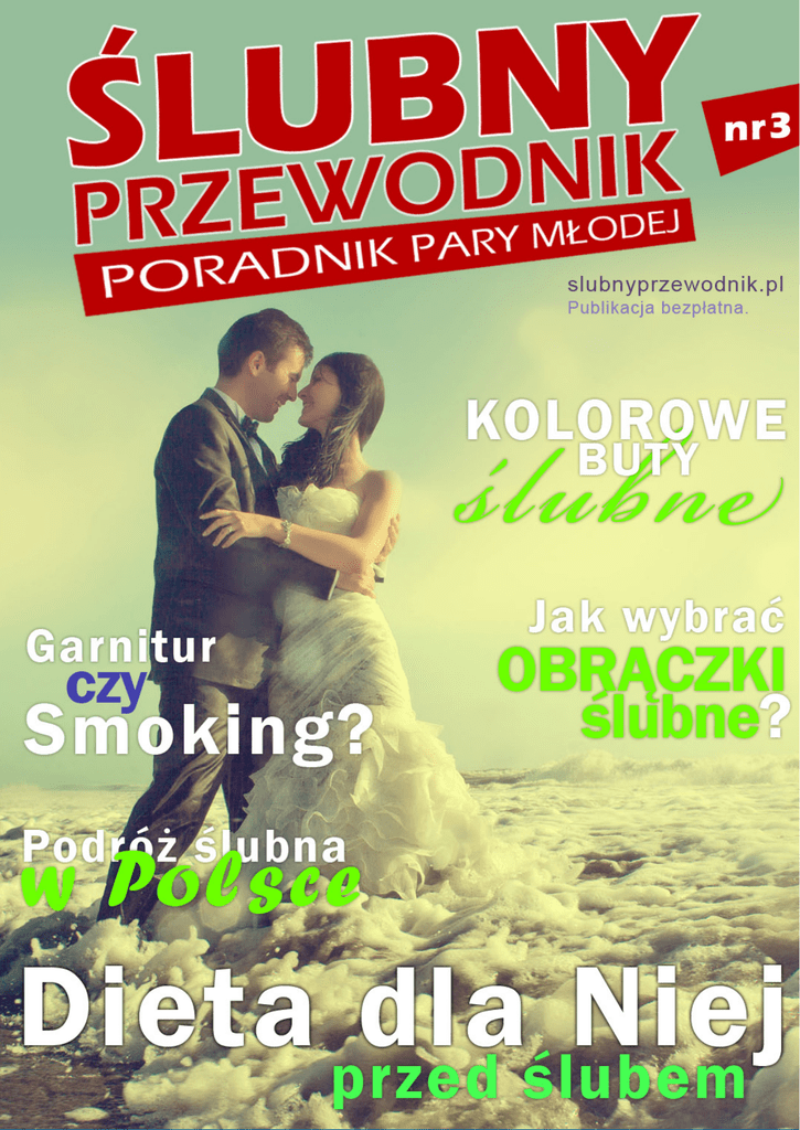1 SPIS TREŚCI Moi Drodzy, 03 07 10 12 16 19 21 23 25 26 Dieta dla Niej przed ślubem przed Wami kolejny numer miesięcznika dla par planujących ślub. Garnitur czy smoking Dowiecie się w nim między innymi, gdzie najlepiej wybrać się w podróż poślubną w Polsce, poznacie ciekawe miejsca i pomysły na sesję ślubną. Jak wybrać obrączki ślubne? Panie z pewnością zainteresują się dietą przed ślubem, która pozowli zrzucić zbędne kilogramy oraz dowiedzą się, dla jakiej figury pasuje suknia ślubna typu „princessa”. Kolorowe buty ślubne Panowie będą mogli wgłębić się w wygląd i charakter garnituru oraz smokingu, co pozowli podjąć im decyzją związaną ze strojem ślubnym. Podróż ślubna w Polsce Suknia ślubna typu Princessa W miesięczniku „Ślubny Przeowdnik” znajdziecie także inne ciekawwe artykuły. Kolekcja sukien śubnych Zapraszam do lektury. Ślubne przesądy Garnitury ślubne Wyjątkowa sesja ślubna Magdalena Kalita Redaktor Naczelny [email protected] 2 DIETA DLA NIEJ PRZED ŚLUBEM Jako przyszła Panna Młoda na pewno, w dzień swojego ślubu, chcesz wyglądać fantastycznie, nie tylko pod względem makijażu, fryzury i sukni, ale także chcesz cieszyć się zgrabną i smukłą sylwetką. Nie chcesz przecież, żeby spod obcisłej sukienki widać było „oponkę” na brzuchu czy zbyt krągłe uda. Nie możesz też popadać w skrajność i fundować swojemu organizmowi głodówkę. Dieta przed ślubem musi być tak dobrana, abyś mogła zrzucić zbędne kilogramy, oczyścić organizm z toksyn, a także wzmocnić paznokcie, włosy oraz poprawić wygląd skóry. Przeczytaj więc poniższy artykuł, który podpowie Ci, co robić, aby pozbyć się krągłości tu i ówdzie oraz odpowiednio oczyścić organizm. Gdy będziesz stosować się do zaleceń poprawnej, zbilansowanej diety, efekty będziesz mogła zauważyć już po około miesiącu. 3 Dieta przyszłej Panny Młodej musi być bogata we wszystkie niezbędne witaminy i inne składniki, które są potrzebne dla prawidłowego funkcjonowania jej organizmu. Nie możesz więc ograniczać się tylko do jedzenia posiłków z samych owoców albo kapusty. Musisz racjonalnie podchodzić do swojego odchudzania. Bardzo ważną kwestią jest jedzenie 5 małych posiłków co 2-3 godziny. Pozwoli to zwiększyć przemianę materii, a w konsekwencji Twój organizm nie będzie odkładał zbędnego tłuszczu, bo będzie miał regularnie dostarczany posiłek. Pamiętaj także o jedzeniu warzyw i owoców, które są tak cennym źródłem witamin i różnego rodzaju minerałów. Nie rezygnuj więc z małych przekąsek w ciągu dnia w postaci jabłka, pomarańczy czy grejpfruta. Także jedzenie warzyw np. marchewki wpłynie korzystnie na Twoją figurę, ale również kolor cery znacznie Ci się poprawi i wyrówna. Musisz pamiętać także o tym, by ograniczać słodycze, chipsy, paluszki, orzeszki oraz wszelkiego rodzaju Fast-Foody , które są bardzo kaloryczne a ich nadmiar odkłada się w postaci tłuszczu. Silna wola okaże się tutaj niezbędna. Pamiętaj, żeby nie szukać sobie byle pretekstu do zjedzenia czegoś niezdrowego np. urodziny czy gorszy dzień w pracy. Staraj się unikać wszelkich sosów podawanych z ziemniakami, a także majonezów, jako dodatek do sałatek czy kanapek, gdyż są bardzo tuczące i zawierają spore ilości kalorii i tłuszczu. Zrezygnuj z białego pieczywa na rzecz ciemnego, gdyż ciemne na dłużej wypełnia żołądek i unikniesz w ten sposób podjadania między posiłkami. Nigdy nie zapominaj o zjedzeniu śniadania, gdyż nie bez przyczyny mówi się, że to najważniejszy posiłek w ciągu dnia. Dostarcza ono bowiem cennych wartości odżywczych i dodaje energii na cały dzień, wpływa także na prawidłowe tempo przemiany materii. Jeśli chcesz uniknąć odkładania się tłuszcz w postaci fałdek na brzuchu, udach i pośladkach, ostatni posiłek staraj się zjadać nie później niż 2 godziny przed snem, posiłek ten ma być lekki i mało kaloryczny, gdyż wieczorem Twój metabolizm spowalnia i nie zdąży przetrawić ciężkiego posiłku, zanim położysz się spać. > 4 5 Aby Twoja dieta była prawidłowa musisz zadbać też o odpowiednie nawodnienie Twojego organizmu. Staraj się wypijać 1,5l dziennie wody niegazowanej, gdyż wpływa ona na poprawę metabolizmu, a także na zdrowy wygląd skóry i prawidłowe funkcjonowanie całego organizmu. Pamiętaj, jeśli organizm jest dobrze nawodniony to funkcjonuje o wiele lepiej, a Ty czujesz się bardziej energiczna. Odchudzanie możesz wspomóc także poprzez picie zielonej i czerwonej herbaty, które ograniczają odkładanie się tłuszczu oraz dostarczają wiele cennych wartości odżywczych. I na koniec… Bardzo ważną rzeczy, bez której nie obejdzie się prawidłowe odchudzanie, jest aktywność fizyczna. Tylko dzięki odpowiedniej diecie i ilości ćwiczeń możemy wyrzeźbić swoje ciało, a także spalić zbędny tłuszczyk z okolic brzucha, ud i pośladków. Ruch bowiem poprawi Twój metabolizm, a także wpłynie korzystnie na Twoje samopoczucie oraz sylwetkę. Jeśli więc pragniesz schudnąć w rozsądny sposób pamiętaj, że nie możesz się głodzić tylko musisz odżywiać się racjonalnie, pić dużo wody oraz zacząć uprawiać jakiś sport, bowiem nieprzemyślane odchudzanie może prowadzić do wielu problemów zdrowotnych. 6 G R U T I N R A CZY SMOKING? Mężczyzna, w dzień swojego ślubu, powinien wyglądać równie elegancko, jak jego przyszła żona. Strój Pana Młodego musi być dopasowany do kreacji Panny Młodej, ważne aby z nią współgrał i tworzył zgraną całość. Jeśli więc suknia jest w kolorze białym, strój męski powinien być w odcieniu czarnym, szarym bądź grafitowym, natomiast gdy suknia będzie w kolorze ecru, dobrze by było, gdyby mężczyzna miał na sobie strój w kolorze ciemnobrązowym albo czekoladowym. Jeśli zastanawiasz się nad wyborem garnituru bądź s
