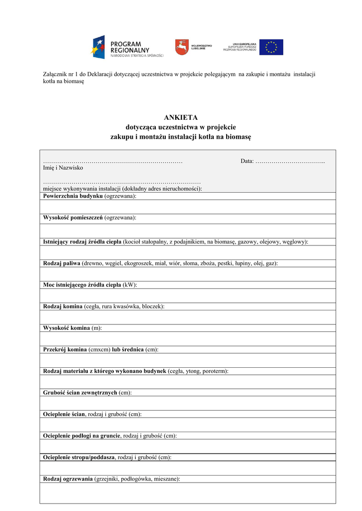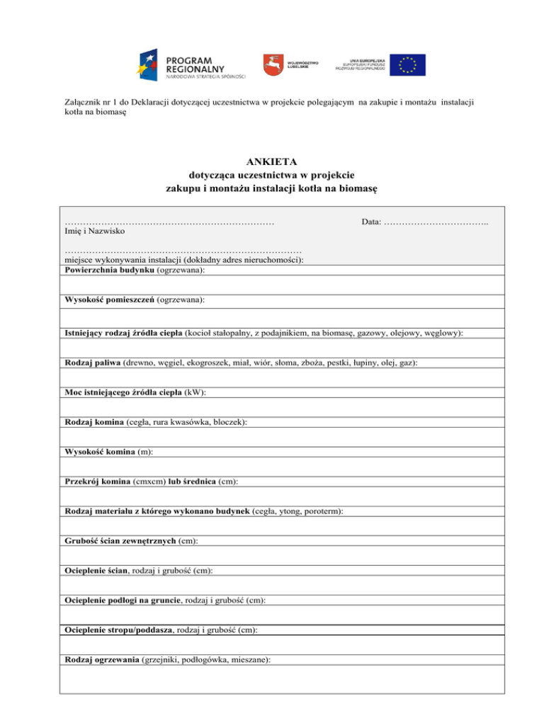 Załącznik nr 1 do Deklaracji dotyczącej uczestnictwa w projekcie polegającym na zakupie i montażu instalacji kotła na biomasę ANKIETA dotycząca uczestnictwa w projekcie zakupu i montażu instalacji kotła na biomasę …………………………………………………………… Imię i Nazwisko Data: …………………………….. …………………………………………………………………… miejsce wykonywania instalacji (dokładny adres nieruchomości): Powierzchnia budynku (ogrzewana): Wysokość pomieszczeń (ogrzewana): Istniejący rodzaj źródła ciepła (kocioł stałopalny, z podajnikiem, na biomasę, gazowy, olejowy, węglowy): Rodzaj paliwa (drewno, węgiel, ekogroszek, miał, wiór, słoma, zboża, pestki, łupiny, olej, gaz): Moc istniejącego źródła ciepła (kW): Rodzaj komina (cegła, rura kwasówka, bloczek): Wysokość komina (m): Przekrój komina (cmxcm) lub średnica (cm): Rodzaj materiału z którego wykonano budynek (cegła, ytong, poroterm): Grubość ścian zewnętrznych (cm): Ocieplenie ścian, rodzaj i grubość (cm): Ocieplenie podłogi na gruncie, rodzaj i grubość (cm): Ocieplenie stropu/poddasza, rodzaj i grubość (cm): Rodzaj ogrzewania (grzejniki, podłogówka, mieszane): Dodatkowe źródło ciepła (np. kominek, pompa ciepła): Liczba osób korzystających z ciepłej wody: Ilość łazienek: Duża wanna (200-300 litrów) TAK/NIE: Uwagi: Oświadczam, że: 1. Wyrażam zgodę na przetwarzanie moich danych osobowych na cele związane z projektem zgodnie z przepisami ustawy z dnia 29 sierpnia 1997 r. o ochronie danych osobowych (tj. Dz.U. z 2014 r. poz. 1182 z późn. zm.). 2. Zapoznałem się z treścią Regulaminu naboru deklaracji w ramach projektów z zakresu odnawialnych źródeł energii planowanych do realizacji przez Gminę Lubartów w latach 2016 –2019 i nie wnoszę zastrzeżeń do jego treści. ………………………..……………………………………….. Podpis Właściciela/ Użytkownika budynku