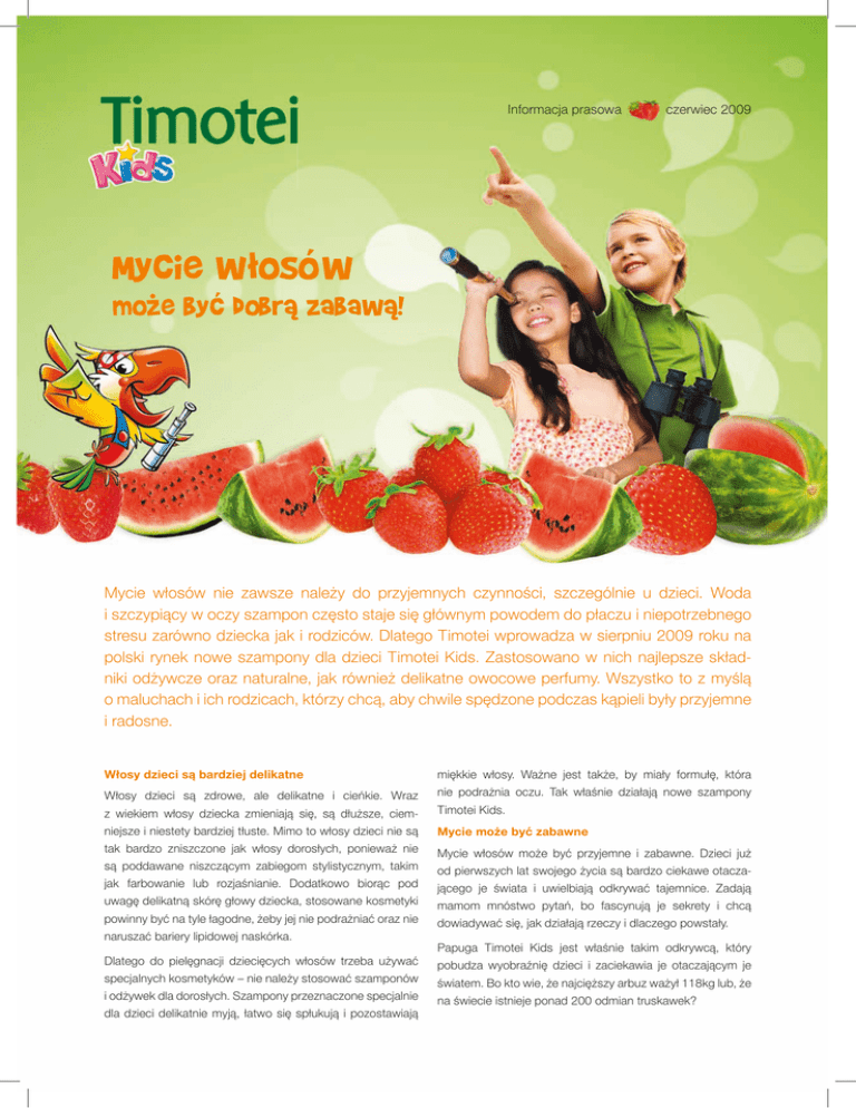 Informacja prasowa czerwiec 2009 Mycie włosów może być dobrą zabawą! Mycie włosów nie zawsze należy do przyjemnych czynności, szczególnie u dzieci. Woda i szczypiący w oczy szampon często staje się głównym powodem do płaczu i niepotrzebnego stresu zarówno dziecka jak i rodziców. Dlatego Timotei wprowadza w sierpniu 2009 roku na polski rynek nowe szampony dla dzieci Timotei Kids. Zastosowano w nich najlepsze składniki odżywcze oraz naturalne, jak również delikatne owocowe perfumy. Wszystko to z myślą o maluchach i ich rodzicach, którzy chcą, aby chwile spędzone podczas kąpieli były przyjemne i radosne. Włosy dzieci są bardziej delikatne miękkie włosy. Ważne jest także, by miały formułę, która Włosy dzieci są zdrowe, ale delikatne i cieńkie. Wraz nie podrażnia oczu. Tak właśnie działają nowe szampony z wiekiem włosy dziecka zmieniają się, są dłuższe, ciem- Timotei Kids. niejsze i niestety bardziej tłuste. Mimo to włosy dzieci nie są Mycie może być zabawne tak bardzo zniszczone jak włosy dorosłych, ponieważ nie Mycie włosów może być przyjemne i zabawne. Dzieci już są poddawane niszczącym zabiegom stylistycznym, takim od pierwszych lat swojego życia są bardzo ciekawe otacza- jak farbowanie lub rozjaśnianie. Dodatkowo biorąc pod jącego je świata i uwielbiają odkrywać tajemnice. Zadają uwagę delikatną skórę głowy dziecka, stosowane kosmetyki mamom mnóstwo pytań, bo fascynują je sekrety i chcą powinny być na tyle łagodne, żeby jej nie podrażniać oraz nie dowiadywać się, jak działają rzeczy i dlaczego powstały. naruszać bariery lipidowej naskórka. Papuga Timotei Kids jest właśnie takim odkrywcą, który Dlatego do pielęgnacji dziecięcych włosów trzeba używać pobudza wyobraźnię dzieci i zaciekawia je otaczającym je specjalnych kosmetyków – nie należy stosować szamponów światem. Bo kto wie, że najcięższy arbuz ważył 118kg lub, że i odżywek dla dorosłych. Szampony przeznaczone specjalnie na świecie istnieje ponad 200 odmian truskawek? dla dzieci delikatnie myją, łatwo się spłukują i pozostawiają Nowy, wyjątkowy Timotei dla dzieci Timotei stworzył szampon z myślą o dzieciach, który zawiera opatentowaną i przebadaną laboratoryjnie recepturę opartą na najłagodniejszych środkach powierzchniowo czynnych, zawierającą miksturę najbardziej delikatnych silikonów. Nowy Timotei Kids dostępny jest w ulubionych, dziecięcych zapachach: truskawkowym i arbuzowym. Formuła szamponu jest tak łagodna, że nie powoduje podrażnień oczu, a zawarte w niej opatentowane cząsteczki polimerów ułatwiają rozczesywanie włosów, nawet na mokro. Szampon Timotei Kids stosuje najlepsze składniki odżywcze w połączeniu ze składnikami pochodzenia naturalnego oraz perfumami stworzonymi specjalnie z myślą o dzieciach. Rezultat to przyjemność dziecka wynikająca z jego samodzielności oraz satysfakcja rodzica z doboru odpowiedniego kosmetyku dla swojej pociechy. Timotei Kids: 1. Ma delikatną formułę 2. Nie szczypie w oczy 3. ułatwia rozczesywanie 4. Owocowe zapachy stworzone specjalnie dla dzieci Nowe produkty Timotei Kids zostały opracowane specjalnie z myślą o dzieciach, aby pielęgnowały ich delikatne włosy. Timotei Truskawka szampon dla dzieci Nowy szampon Timotei Kids dla dzieci z truskawką o przyjemnym owocowym zapachu łagodnie myje i pielęgnuje delikatne włosy dziecka. Łagodna formuła nie szczypie w oczy, ułatwia rozczesywanie i sprawia, że dziecięce włosy stają się mięciutkie, puszyste Timotei Arbuz szampon dla dzieci i błyszczące. Pojemność: 250ml Cena: ok. 6,5 zł Nowy szampon Timotei Kids dla dzieci z arbuzem o przyjemnym owocowym zapachu łagodnie myje i pielęgnuje delikatne włosy dziecka. Łagodna formuła nie szczypie w oczy, ułatwia rozczesywanie i sprawia, że dziecięce włosy stają się mięciutkie, puszyste i błyszczące Pojemność: 250ml Cena: ok. 6,5 zł Kosmetyki marki Timotei są produkowane i dystrybuowane przez międzynarodową firmę Unilever. Historię marki Timotei rozpoczął angielski botanik M. Timothy, mieszkający w Szwecji, który w latach 70-tych odkrył właściwości pewnych ziół i nazwał je swoim nazwiskiem (Timothy grass). Wtedy właśnie zaczyna się historia marki Timotei, która nazwę swoją również zawdzięcza owemu botanikowi. W Polsce marka Timotei pojawiła się jeszcze przed 1990 rokiem, kiedy to szwedzka wersja szamponu Timotei była sprzedawana w sieci sklepów Pewex i Baltona. Po 1990 roku Timotei dołączył do pozostałych produktów z oferty Unilevera, a w 1994 rozpoczęto produkcję szamponów Timotei w Polsce. www.timotei.pl Kontakt prasowy PR_room Anna Kostro-Wawrzyniak Karolina Witecka Magdalena Gula ul. Bajońska 9a/18 tel. 022 408 76 78, 0696 073 653 tel. 0793 770 343 tel. 022 408 76 78 03-963 Warszawa e-mail: [email protected] e-mail: [email protected] e-mail: [email protected]