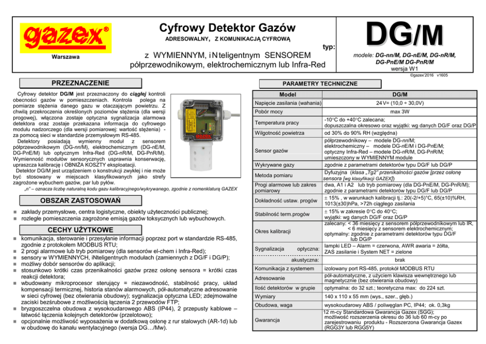 DG/M Cyfrowy Detektor Gazów ADRESOWALNY, Z KOMUNIKACJĄ CYFROWĄ typ: Warszawa z WYMIENNYM, i N teligentnym SENSOREM półprzewodnikowym, elektrochemicznym lub Infra-Red modele: DG-nn/M, DG-nE/M, DG-nR/M, DG-PnE/M DG-PnR/M wersja W1 ©gazex’2016 v1605 PRZEZNACZENIE Cyfrowy detektor DG/M jest przeznaczony do ciągłej kontroli obecności gazów w pomieszczeniach. Kontrola polega na pomiarze stężenia danego gazu w otaczającym powietrzu. Z chwilą przekroczenia określonych poziomów stężenia (dla wersji progowej), włączona zostaje optyczna sygnalizacja alarmowa detektora oraz zostaje przekazana informacja do cyfrowego modułu nadzorczego (dla wersji pomiarowej: wartość stężenia) za pomocą sieci w standardzie przemysłowym RS-485. Detektory posiadają wymienny moduł z sensorem półprzewodnikowym (DG-nn/M), elektrochemicznym (DG-nE/M, DG-PnE/M) lub optycznym Infra-Red (DG-nR/M, DG-PnR/M). Wymienność modułów sensorycznych usprawnia konserwację, upraszcza kalibrację i OBNIŻA KOSZTY eksploatacji. Detektor DG/M jest urządzeniem o konstrukcji zwykłej i nie może być stosowany w miejscach klasyfikowanych jako strefy zagrożone wybuchem gazów, par lub pyłów. „n” – oznacza liczbę naturalną kodu gazu kalibracyjnego/wykrywanego, zgodnie z nomenklaturą GAZEX OBSZAR ZASTOSOWAŃ zakłady przemysłowe, centra logistyczne, obiekty użyteczności publicznej; rozległe pomieszczenia zagrożone emisją gazów toksycznych lub wybuchowych. CECHY UŻYTKOWE komunikacja, sterowanie i przesyłanie informacji poprzez port w standardzie RS-485, zgodnie z protokołem MODBUS RTU; 2 progi alarmowe lub tryb pomiarowy (dla sensorów el-chem i Infra-Red); sensory w WYMIENNYCH, iNteligentnych modułach (zamiennych z DG/F i DG/P); możliwy dobór sensorów do aplikacji; stosunkowo krótki czas przenikalności gazów przez osłonę sensora = krótki czas reakcji detektora; wbudowany mikroprocesor sterujący = niezawodność, stabilność pracy, układ kompensacji termicznej, historia stanów alarmowych, pół-automatyczne adresowanie w sieci cyfrowej (bez otwierania obudowy); sygnalizacja optyczna LED; zdejmowalne zaciski bezśrubowe z możliwością łączenia 2 przewodów FTP; bryzgoszczelna obudowa z wysokoudarowego ABS (IP44), 2 przepusty kablowe – łatwość łączenia kolejnych detektorów (przelotowo); opcjonalnie możliwość wyposażenia w dodatkową osłonę z rur stalowych (AR-1d) lub w obudowę do kanału wentylacyjnego (wersja DG…/Mw). PARAMETRY TECHNICZNE Model DG/M Napięcie zasilania (wahania) 24 V= (10,0 ÷ 30,0V) Pobór mocy max 3W -10°C do +40°C zalecana; Temperatura pracy dopuszczalna okresowo oraz wyjątki: wg danych DG/F oraz DG/P Wilgotność powietrza od 30% do 90% RH (względna) półprzewodnikowy – modele DG-nn/M; elektrochemiczny – modele DG-nE/M i DG-PnE/M; Sensor gazów optyczny Infra-Red – modele DG-nR/M, DG-PnR/M; umieszczony w WYMIENNYM module Wykrywane gazy zgodnie z parametrami detektorów typu DG/F lub DG/P Dyfuzyjna (klasa „Tg2” przenikalności gazów [przez osłonę Metoda pomiaru sensora [wg klasyfikacji GAZEX]) Progi alarmowe lub zakres dwa, A1 i A2 lub tryb pomiarowy (dla DG-PnE/M, DG-PnR/M); pomiarowy zgodnie z parametrami detektorów typu DG/F lub DG/P ± 15% , w warunkach kalibracji tj.: 20(-2/+5)°C, 65(±10)%RH, Dokładność ustaw. progów 1013(±30)hPa, >72h ciągłego zasilania ± 15% w zakresie 0°C do 40°C; Stabilność term.progów wyjątki: wg danych DG/F oraz DG/P zalecany: < 36 miesięcy z sensorem półprzewodnikowym lub IR, < 6 miesięcy z sensorem elektrochemicznym; Okres kalibracji optymalny: zgodnie z parametrami detektorów typu DG/F lub DG/P lampki LED – Alarm = czerwona, AWR awaria = żółta, Sygnalizacja optyczna: ZAS zasilanie i System NET = zielone akustyczna: brak Ilość detektorów w grupie izolowany port RS-485, protokół MODBUS RTU pół-automatyczne, z użyciem klawisza wewnętrznego lub magnetycznie (bez otwierania obudowy) optymalna: do 32 szt.; teoretyczna max: do 224 szt. Wymiary 140 x 110 x 55 mm (wys., szer., głęb.) Obudowa, waga wysokoudarowy ABS / poliwęglan PC, IP44; ok. 0,3kg 12 m-cy Standardowa Gwarancja Gazex (SGG); możliwość rozszerzenia okresu do 36 lub 60 m-cy po zarejestrowaniu produktu - Rozszerzona Gwarancja Gazex (RGG3Y lub RGG5Y) Komunikacja z systemem Adresowanie Gwarancja Schemat blokowy systemu z DG/M OPIS DETEKTORA Widok w pozycji montażowej (bez pokrywy czołowej) Detektor nr max 224 DG/M Zaciski podwójne samo-kleszczujące przewodów FTP (do magistrali) Przepust kablowy membranowy R3 FTP max 1200m ... Przepust kablowy dławicowy M M M + + + DG/M B- A+ GND DG/M PU.../T DG/M Zasilacz 24V=, >2A R3 S A P F DG/M Włącznik magnetyczny R3 <12m R3 FTP <12m puszka łączeniowa CB-4 Moduł wizualizacji MDD-L32/T Moduł dodatkowy MDD-R4/T MDD-C32/T Wyjścia sterujące System Nr 2 Klawisz TEST Otwór do montażu na ścianie PU.../T DG/M FTP CB-4 Lampki kontrolne N E T (d a n e ) ALARM PWR (zasilanie) FAULT (awaria) YDY 2x 2,5 E FTP R3 R FTP PU.../T DG/M Zasilacz 24V=, >2A Komora z wymiennym modułem sensora gazu R3 R3 <12m <12m E E YDY 2x min 1,5 ... PRODUCENT: CB-4 puszka łączeniowa G AZEX ul.Baletowa 16 , 02-867 Warszawa tel. : 22 644 2511 fax: 22 64 1 2311 gazex@ gazex.pl www.gaz ex.pl Z Nami Pracujesz i Żyjesz Bezpieczniej ! R FTP CB-4 ©gazex ’2016. Wszelkie prawa zastrzeżone. Powielanie lub kopiowanie w części lub całości bez zgody GAZEX zabronione. Logo i nazwa gazex są zastrzeżonymi znakami towarowymi przedsiębiorstwa GAZEX. FTP E CB-4 YDY min 2x 2.5 FTP Det.Net Wyjścia sterujące ©gazex’2015 v1512 FTP R System Nr 1 ©gazex Zasilacz 24V=, >2A Moduł nadzorczy R MDD-256/T FTP Out.Net do BMS Symbole przewodów zgodne z biuletynem dla projektantów INFO-gazex P…