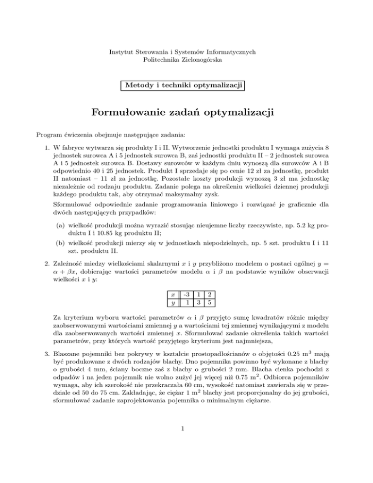 Formułowanie zadań optymalizacji - Instytut Sterowania i Systemów