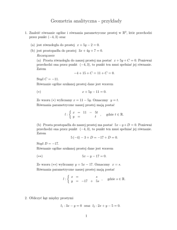 Geometria analityczna - przykłady 1. Znaleźć równanie ogólne i równania parametryczne prostej w R2 , któr przechodzi przez punkt (−4, 3) oraz (a) jest równoległa do prostej x + 5y − 2 = 0. (b) jest prostopadła do prostej 3x + 4y + 7 = 0. Rozwiązanie (a) Prosta równoległa do naszej prostej ma postać x + 5y + C = 0. Ponieważ przechodzi ona przez punkt (−4, 3), to punkt ten musi spełniać jej równanie. Zatem −4 + 15 + C = 11 + C = 0. Stąd C = −11. Równanie ogólne szukanej prostej dane jest wzorem x + 5y − 11 = 0. (∗) Ze wzoru (∗) wyliczamy x = 11 − 5y. Oznaczmy y = t. Równania parametryczne naszej prostej mają postać x = 11 − 5t l: , gdzie t ∈ R. y = t (b) Prosta prostopadła do naszej prostej ma postać 5x − y + D = 0. Ponieważ przechodzi ona przez punkt (−4, 3), to punkt ten musi spełniać jej równanie. Zatem 5 (−4) − 3 + D = −17 + D = 0. Stąd D = −17. Równanie ogólne szukanej prostej dane jest wzorem 5x − y − 17 = 0. (∗∗) Ze wzoru (∗∗) wyliczamy y = 5x − 17. Oznaczmy x = s. Równania parametryczne naszej prostej mają postać x = s l: , gdzie s ∈ R. y = −17 + 5s 2. Obliczyć kąt między prostymi l1 : 3x − y = 0 oraz l2 : 2x + y − 5 = 0. 1 Rozwiązanie Cosinus kąta między prostymi l1 i l2 jest równy kątowi między wektorami [3, −1] oraz [2, 1] prostopadłymi do tych prostych √ 2. [3, −1] · [2, 1] cos ^ (l1 , l2 ) = √ √ = 2 10 5 Zatem ^ (l1 , l2 ) = π . 4 3. Dany jest trójkąt o wierzchołkach A = (0, 0) , B = (4, 0) , C = (3, 4) . Napisać równanie prostej na której leży dwusieczna kąta o wierzchołku w punkcie A. Rozwiązanie −→ −→ AB AC Wektory −→ oraz −→ są wektorami kierunkowymi ramion kąta ^BAC i AB AC mają jednakowe długości. Suma −→ −→ AB AC −→ + −→ AB AC tych wektorów jest wektorem kierunkowym dwusiecznej kąta. Obliczmy tę sumę −→ −→ 3 4 AB AC [4, 0] [3, 4] 8 4 −→ + −→ = √ + √ = [1, 0] + , = , . 5 5 5 5 9 + 16 16 AB AC Wektor 8 4 , 5 5 jest równoległy do wektora [8, 5] . Równanie szukanej prostej ma postać 8x + 5y = 0. 4. Ułóżyć równania dwusiecznych kątów utworzonych przez proste l1 : 9x − 2y + 18 = 0 i l2 : 7x + 6y − 21 = 0. Sprawdzić, że te dwusieczne są wzajemnie prostopadłe. Rozwiązanie Dwusieczna kąta jest zbiorem punktów płaszczyzny równooddalonych od ramion kąta. Oznaczmy symbolem (X, Y ) punkt leżący na dwusiecznej. Wtedy odległości d((X, Y ) , l1 ) =d((X, Y ) , l2 ) . 2 Stąd |9X − 2Y + 18| |7X + 6Y − 21| √ √ = , 81 + 4 49 + 36 |9X − 2Y + 18| = |7X + 6Y − 21| . Zatem 9X − 2Y + 18 = 7X + 6Y − 21 lub 9X − 2Y + 18 = − (7X + 6Y − 21) . Szukane dwusieczne dane są równaniami 2X − 8Y + 39 = 0 oraz 16X + 4Y − 3 = 0. Dwusieczne są prostopadłe, gdyż iloczyn skalarny wektorów do nich prostopadłych [2, −8] · [16, 4] = 0 5. Obliczyć objętość równoległościanu o wierzchołkach A = (1, 4, 0) , B = (3, 1, 2) , C = (1, 3, 2) , D = (2, 0, 0) . Rozwiązanie Objętość równoległościanu o wierzchołkach A, B, C, D jest równa wartości bezwzględ−→ −→ −−→ nej iloczynu mieszanego wektorów AB, AC, AD. Z kolei iloczyn mieszany wektorów −→ −→ −−→ AB, AC, AD jest równy wyznacznikowi utworzonemu odpowiednio ze współrzędnych tych wektorów. −→ −→ −−→ Obliczmy AB = [2, −3, 2] , AC = [0, −1, 2] , AD = [1, −4, 0] . Stąd −→ 2 −3 2 AB −→ det AC = 0 −1 2 = 12. −−→ 1 −4 0 AD Zatem objętość rozważanego równoległościanu jest równa 12. 6. Objętość równoległościanu zbudowanego na wektorach p~, ~q, ~r jest równa 3. Obliczyć objętość równoległościanu zbudowanego na wektorach ~a = p~ + ~q − ~r, ~b = 2~p − ~q + ~r, ~c = p~ + 2~q − 3~r. Rozwiązanie Objętość równoległościanu zbudowanego na wektorach ~a, ~b, ~c jest równa wartości bezwzględnej iloczynu mieszanego tych wektorów. Obliczymy iloczyn mieszany ~a × ~b · ~c. 3 Policzmy najpierw iloczyn wektorowy ~a × ~b; ~a × ~b = (~p + ~q − ~r) × (2~p − ~q + ~r) = = 2~p × p~ − p~ × ~q + p~ × ~r + 2~q × p~ − ~q × ~q + ~q × ~r − 2~r × p~ − ~q × ~r − ~r × ~r. Korzystając z własności iloczynu wektorowego, otrzymujemy 2~p × p~ − p~ × ~q + p~ × ~r + 2~q × p~ − ~q × ~q + ~q × ~r − 2~r × p~ − ~q × ~r − ~r × ~r = = −~p × ~q + p~ × ~r − 2~p × ~q + ~q × ~r + 2~p × ~r − ~q × ~r = −3~p × ~q + 3~p × ~r. Policzmy teraz iloczyn skalarny wektorów ~a × ~b oraz ~c; ~ ~a × b · ~c = (−3~p × ~q + 3~p × ~r) · (~p + 2~q − 3~r) . Korzystając z własności iloczynu skalarnego, otrzymujemy (−3~p × ~q + 3~p × ~r) · (~p + 2~q − 3~r) = = −3 (~p × ~q) · p~ − 6 (~p × ~q) · ~q + 9 (~p × ~q) · ~r + 3 (~p × ~r) · p~ + 6 (~p × ~r) · ~q − 9 (~p × ~r) · ~r = = 9 (~p × ~q) · ~r + 6 (~p × ~r) · ~q = 9 (~p × ~q) · ~r − 6 (~p × ~q) · ~r = 3 (~p × ~q) · ~r. Ale objętość równoległościanu zbudowanego na wektorach p~, ~q, ~r jest równa 3. Zatem Objętość równoległościanu zbudowanego na wektorach ~a, ~b, ~c wynosi ~ ~a × b · ~c = 3 |(~p × ~q) · ~r| = 3 · 3 = 9. 7. Podać równanie ogólne płaszczyzny przechodzącej przez punkt P = (3, 1, −2) i równoległej do płaszczyzny π danej równaniem π : x − 2y + 5z − 5 = 0. Rozwiązanie Szukana płaszczyzna ma być równoległa do płaszczyzny danej, zatem wektor ~n = [1, −2, 5] jest również wektorem prostopadłym do szukanej płaszczyzny. Równanie szukanej płaszczyzny ma więc postać (∗) x − 2y + 5z + D = 0. Punkt P = (3, 1, −2) należy do poszukiwanej płaszczyzny. Zatem współrzędne punktu P spełniają równanie (∗) . Stąd 3 − 2 − 10 + D = 0. Co daje D = 9. Szukana płaszczyzna dana jest więc równaniem x − 2y + 5z + 9 = 0. 4 8. Napisać równanie ogólne płaszczyzny π 0 , która przechodzi przez punkty P = (3, 1, −2) i Q = (1, 1, 2) oraz jest prostopadł