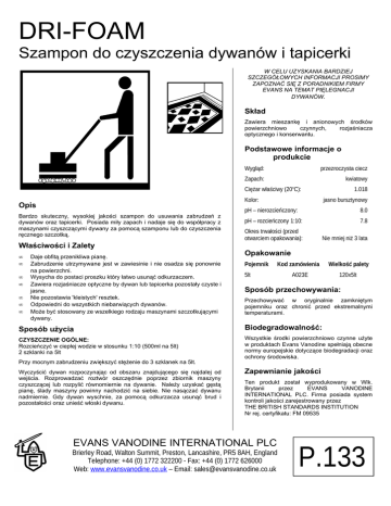 DRI-FOAM Szampon do czyszczenia dywanów i tapicerki W CELU UZYSKANIA BARDZIEJ SZCZEGÓŁOWYCH INFORMACJI PROSIMY ZAPOZNAĆ SIĘ Z PORADNIKIEM FIRMY EVANS NA TEMAT PIĘLEGNACJI DYWANÓW. Skład Zawiera mieszankę i anionowych środków powierzchniowo czynnych, rozjaśniacza optycznego i konserwantu. Podstawowe informacje o produkcie Wygląd: przezroczysta ciecz Zapach: kwiatowy o Ciężar właściwy (20 C): Kolor: Opis Bardzo skuteczny, wysokiej jakości szampon do usuwania zabrudzeń z dywanów oraz tapicerki. Posiada miły zapach i nadaje się do współpracy z maszynami czyszczącymi dywany za pomocą szamponu lub do czyszczenia ręcznego szczotką. Właściwości i Zalety • • • • • • • Daje obfitą przenikliwa pianę. Zabrudzenie utrzymywane jest w zawiesinie i nie osadza się ponownie na powierzchni. Wysycha do postaci proszku który łatwo usunąć odkurzaczem. Zawiera rozjaśniacze optyczne by dywan lub tapicerka pozostały czyste i jasne. Nie pozostawia 'kleistych' resztek. Odpowiedni do wszystkich niebarwiących dywanów. Może być stosowany ze wszelkiego rodzaju maszynami szczotkującymi dywany. 1.018 jasno bursztynowy pH – nierozcieńczony: 8.0 pH – rozcieńczony 1:10: 7.8 Okres trwałości (przed otwarciem opakowania): Nie mniej niż 3 lata Opakowanie Pojemnik Kod zamówienia Wielkość palety A023E 120x5lt 5lt Sposób przechowywania: Przechowywać w oryginalnie zamkniętym pojemniku oraz chronić przed ekstremalnymi temperaturami. Sposób użycia Biodegradowalność: CZYSZCZENIE OGÓLNE: Rozcieńczyć w ciepłej wodzie w stosunku 1:10 (500ml na 5lt) 2 szklanki na 5lt Wszystkie środki powierzchniowo czynne użyte w produktach Evans Vanodine spełniają obecne normy europejskie dotyczące biodegradacji oraz ochrony środowiska. Przy mocnym zabrudzeniu zwiększyć stężenie do 3 szklanek na 5lt. Wyczyścić dywan rozpoczynając od obszaru znajdującego się najdalej od wejścia. Rozprowadzać roztwór oszczędnie poprzez zbiornik maszyny czyszczącej lub rozpylić równomiernie na dywanie. Należy uzyskać gęstą pianę, ślady maszyny powinny nachodzić na siebie. Nie nasączać dywanu nadmiernie. Gdy dywan wyschnie, za pomocą odkurzacza usunąć brud i pozostałości oraz unieść włoski dywanu. Zapewnianie jakości Ten produkt został wyprodukowany w Wlk. Brytanii przez EVANS VANODINE INTERNATIONAL PLC. Firma posiada system kontroli jakości zarejestrowany przez THE BRITISH STANDARDS INSTITUTION Nr rej. certyfikatu: FM 09535 EVANS VANODINE INTERNATIONAL PLC Brierley Road, Walton Summit, Preston, Lancashire, PR5 8AH, England Telephone: +44 (0) 1772 322200 - Fax: +44 (0) 1772 626000 Web: www.evansvanodine.co.uk – Email: [email protected] P.133 Data ostatniej weryfikacji: 0603 EVANS VANODINE INTERNATIONAL PLC Brierley Road, Walton Summit, Preston, Lancashire, PR5 8AH, England Telephone: +44 (0) 1772 322200 - Fax: +44 (0) 1772 626000 Web: www.evansvanodine.co.uk – Email: [email protected] P.133