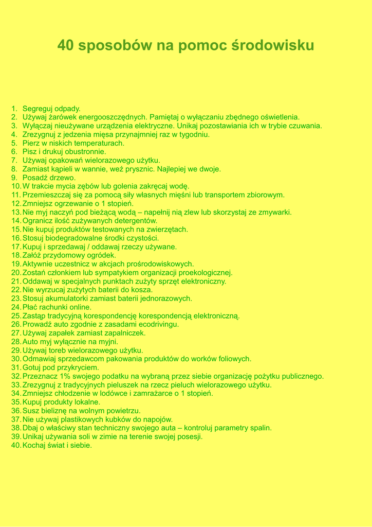 40 sposobów na pomoc środowisku 1. Segreguj odpady. 2. Używaj żarówek energooszczędnych. Pamiętaj o wyłączaniu zbędnego oświetlenia. 3. Wyłączaj nieużywane urządzenia elektryczne. Unikaj pozostawiania ich w trybie czuwania. 4. Zrezygnuj z jedzenia mięsa przynajmniej raz w tygodniu. 5. Pierz w niskich temperaturach. 6. Pisz i drukuj obustronnie. 7. Używaj opakowań wielorazowego użytku. 8. Zamiast kąpieli w wannie, weź prysznic. Najlepiej we dwoje. 9. Posadź drzewo. 10. W trakcie mycia zębów lub golenia zakręcaj wodę. 11. Przemieszczaj się za pomocą siły własnych mięśni lub transportem zbiorowym. 12. Zmniejsz ogrzewanie o 1 stopień. 13. Nie myj naczyń pod bieżącą wodą – napełnij nią zlew lub skorzystaj ze zmywarki. 14. Ogranicz ilość zużywanych detergentów. 15. Nie kupuj produktów testowanych na zwierzętach. 16. Stosuj biodegradowalne środki czystości. 17. Kupuj i sprzedawaj / oddawaj rzeczy używane. 18. Załóż przydomowy ogródek. 19. Aktywnie uczestnicz w akcjach prośrodowiskowych. 20. Zostań członkiem lub sympatykiem organizacji proekologicznej. 21. Oddawaj w specjalnych punktach zużyty sprzęt elektroniczny. 22. Nie wyrzucaj zużytych baterii do kosza. 23. Stosuj akumulatorki zamiast baterii jednorazowych. 24. Płać rachunki online. 25. Zastąp tradycyjną korespondencję korespondencją elektroniczną. 26. Prowadź auto zgodnie z zasadami ecodrivingu. 27. Używaj zapałek zamiast zapalniczek. 28. Auto myj wyłącznie na myjni. 29. Używaj toreb wielorazowego użytku. 30. Odmawiaj sprzedawcom pakowania produktów do worków foliowych. 31. Gotuj pod przykryciem. 32. Przeznacz 1% swojego podatku na wybraną przez siebie organizację pożytku publicznego. 33. Zrezygnuj z tradycyjnych pieluszek na rzecz pieluch wielorazowego użytku. 34. Zmniejsz chłodzenie w lodówce i zamrażarce o 1 stopień. 35. Kupuj produkty lokalne. 36. Susz bieliznę na wolnym powietrzu. 37. Nie używaj plastikowych kubków do napojów. 38. Dbaj o właściwy stan techniczny swojego auta – kontroluj parametry spalin. 39. Unikaj używania soli w zimie na terenie swojej posesji. 40. Kochaj świat i siebie.