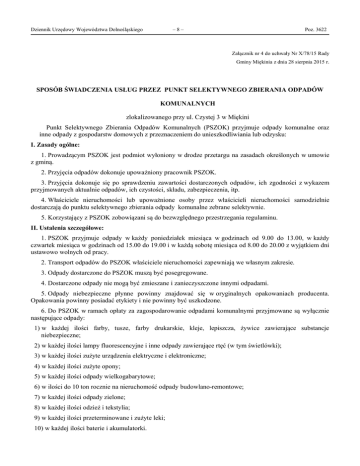 Dziennik Urzędowy Województwa Dolnośląskiego –8– Poz. 3622 Załącznik nr 4 do uchwały Nr X/78/15 Rady Gminy Miękinia z dnia 28 sierpnia 2015 r. SPOSÓB ŚWIADCZENIA USŁUG PRZEZ PUNKT SELEKTYWNEGO ZBIERANIA ODPADÓW KOMUNALNYCH zlokalizowanego przy ul. Czystej 3 w Miękini Punkt Selektywnego Zbierania Odpadów Komunalnych (PSZOK) przyjmuje odpady komunalne oraz inne odpady z gospodarstw domowych z przeznaczeniem do unieszkodliwiania lub odzysku: I. Zasady ogólne: 1. Prowadzącym PSZOK jest podmiot wyłoniony w drodze przetargu na zasadach określonych w umowie z gminą. 2. Przyjęcia odpadów dokonuje upoważniony pracownik PSZOK. 3. Przyjęcia dokonuje się po sprawdzeniu zawartości dostarczonych odpadów, ich zgodności z wykazem przyjmowanych aktualnie odpadów, ich czystości, składu, zabezpieczenia, itp. 4. Właściciele nieruchomości lub upoważnione osoby przez właścicieli nieruchomości samodzielnie dostarczają do punktu selektywnego zbierania odpady komunalne zebrane selektywnie. 5. Korzystający z PSZOK zobowiązani są do bezwzględnego przestrzegania regulaminu. II. Ustalenia szczegółowe: 1. PSZOK przyjmuje odpady w każdy poniedziałek miesiąca w godzinach od 9.00 do 13.00, w każdy czwartek miesiąca w godzinach od 15.00 do 19.00 i w każdą sobotę miesiąca od 8.00 do 20.00 z wyjątkiem dni ustawowo wolnych od pracy. 2. Transport odpadów do PSZOK właściciele nieruchomości zapewniają we własnym zakresie. 3. Odpady dostarczone do PSZOK muszą być posegregowane. 4. Dostarczone odpady nie mogą być zmieszane i zanieczyszczone innymi odpadami. 5. Odpady niebezpieczne płynne powinny znajdować się w oryginalnych opakowaniach producenta. Opakowania powinny posiadać etykiety i nie powinny być uszkodzone. 6. Do PSZOK w ramach opłaty za zagospodarowanie odpadami komunalnymi przyjmowane są wyłącznie następujące odpady: 1) w każdej ilości farby, tusze, farby drukarskie, kleje, lepiszcza, żywice zawierające substancje niebezpieczne; 2) w każdej ilości lampy fluorescencyjne i inne odpady zawierające rtęć (w tym świetlówki); 3) w każdej ilości zużyte urządzenia elektryczne i elektroniczne; 4) w każdej ilości zużyte opony; 5) w każdej ilości odpady wielkogabarytowe; 6) w ilości do 10 ton rocznie na nieruchomość odpady budowlano-remontowe; 7) w każdej ilości odpady zielone; 8) w każdej ilości odzież i tekstylia; 9) w każdej ilości przeterminowane i zużyte leki; 10) w każdej ilości baterie i akumulatorki. Dziennik Urzędowy Województwa Dolnośląskiego –9– Poz. 3622 7. W ilości przyjęcia powyżej 10 ton rocznie na nieruchomość odpadów remontowo-budowlanych pobierana jest opłata zgodnie z obowiązującym cennikiem przyjęcia odpadów do PSZOK. 8. Do PSZOK nie są przyjmowane następujące rodzaje odpadów: − odpady zawierające azbest w tym eternit; − części samochodowe; − szkło zbrojone i hartowane; − zmieszane odpady komunalne; − odpady budowlane zmieszane z innymi odpadami; − padłe zwierzęta; - odpady z tworzyw sztucznych pochodzenia rolniczego; - odpady w ilościach wskazujących na źródło inne niż z gospodarstwa; 9. Dostarczający odpady zobowiązany jest do natychmiastowego zabrania odpadów w przypadku: − stwierdzenia przez pracownika PSZOK–u, iż odpady dostarczone nie znajdują się na wykazie odpadów aktualnie przyjmowanych; − stwierdzenia zanieczyszczeń i zabrudzeń w dostarczonych odpadach; - stwierdzenia, że odpady znajdują się w opakowaniach cieknących; − stwierdzenia braku możliwości identyfikacji odpadów. 10. Każdorazowe przyjęcie odpadów do PSZOK jest ważone, potwierdzane i rejestrowane na formularzu przyjęcia odpadów. 11. Osoba dostarczająca odpady do PSZOK dokonuje ich rozładunku i umieszczenia w poszczególnych kontenerach lub pojemnikach wskazanych przez pracownika PSZOK we własnym zakresie. Obsługa PSZOK może w wyjątkowych sytuacja pomóc w rozładunku i umieszczeniu odpadów w kontenerach lub pojemnikach. 12. Osoby przebywające na terenie PSZOK obowiązane są do: 1) przestrzegania zaleceń obsługi PSZOK, w szczególności w zakresie miejsca złożenia odpadów oraz sposobu poruszania się po PSZOK; 2) zachowania wymogów bezpieczeństwa; 3) zachowania kierunku przemieszczania się wynikającego z oznaczeń 4) stosowania się do ogólnych zasad ruchu drogowego. III. Postanowienia końcowe: 1. Skargi i wnioski przyjmowane są w dni powszednie w godzinach pracy urzędu w Wydziale Gospodarki Komunalnej, Rolnictwa i Ochrony Środowiska Urzędu Gminy w Miękini, Miękinia, ul. Kościuszki 41, pok. 308. 2. Regulamin korzystania z Punktu Selektywnego Zbierania Odpadów Komunalnych jest dostępny na stronie internetowej.