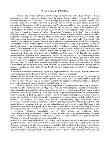 Wizja z dnia 14.09.2016 r. Podczas środowego spotkania modlitewnego poczułem nad sobą Bożą obecność. Kiedy spojrzałem w górę, zobaczyłem bardzo jasną światłość, łączącą niebo z ziemią. W ciemności kosmosu tworzyła ona jakby tunel. Zostałem wciągnięty do tego tunelu i zacząłem unosić się w kierunku nieba. Na początku unosiłem się powoli, ale za chwilę zacząłem bardzo gwałtownie przyśpieszać. Spojrzałem w dół i zobaczyłem jak Ziemia niezwykle szybko zaczyna się oddalać. Mniej więcej w ciągu trzech sekund nie mogłem już jej dostrzec. Zwróciłem wzrok ku górze i zobaczyłem, że bardzo szybko zbliżam się do światłości nieba. Prędkość była tak duża, że nie zdążyłem przyjrzeć się "zarysom" nieba, tylko od razu "wleciałem do środka" i już z niewielką prędkością byłem opuszczany na powierzchnię. Jeszcze będąc w górze zdążyłem zauważyć piękny krajobraz i stojącego na trawie Jezusa, który na mnie czekał. Był ubrany w białą, świetlistą szatę. Cała Jego postać promieniowała. Włosy Miał barwy białej, twarz była biało-żółta. Kiedy tylko zostałem postawiony na "gruncie" przed Jezusem złożyłem pokłon do samej ziemi. To, co wyraźnie zauważyłem, to fakt, że stojąc przed Jezusem nie zastanawiałem się czy złożyć pokłon, czy nie. To się robi odruchowo - nie ma żadnego procesu myślowego :) Kiedy wstałem, Jezus przytulił mnie do piersi. W pierwszym momencie zobaczyłem to jakby z drugiego planu, widząc siebie samego w Jego objęciach, z odległości kilku metrów. Widziałem, że był większy ode mnie, bo stałem na wyprostowanych nogach, a moja głowa była dokładnie na Jego piersi. Po krótkiej chwili widziałem wszystko już bezpośrednio a nie z perspektywy i to był piękny moment, bo On obejmował mnie tak, że cała moja głowa była zakryta przez fałdy świetlistej szaty. W czasie, gdy Jezus mnie tulił, otworzyłem oczy i wszędzie wokoło siebie widziałem tylko ten wspaniały czysto-biały blask bijący od Jego szaty. Po chwili Jezus odsunął mnie lekko od swojej piersi, więc spojrzałem na Niego i zobaczyłem jak patrzy nam mnie, pełen miłości i ze wspaniałym uśmiechem na twarzy (Twarz Jezusa wyglądała na wiek około 40 lat). Po chwili znów zaczął mnie przytulać i w międzyczasie powiedział: "Cokolwiek by się nie działo niczego się nie bój. Naprawdę nie ma sensu się bać. Bojaźń jest cielesna i nie ma żadnego sensu. Ja jestem zawsze przy tobie, więc nic ci nie grozi". Najbardziej dotknął mnie ton Jago głosu, gdy mówił, że strach nie ma sensu. To brzmiało jak informacja przekazywana małemu dziecku, pewna i oczywista, jak "Nie trzymaj ręki w ogniu, bo będzie cię boleć. To naprawdę nie ma sensu". Gdy mówił o bojaźni, wiedziałem, że chodzi o przyszłe czasy, gdy sytuacja na świecie zacznie się robić bardzo ciężka. Po tych słowach jeszcze chwilę mnie obejmował, a później odwróciliśmy się w jednym z kierunków nieba i zaczęliśmy iść. On objął mnie lewą ręką przez całe plecy i trzymając za moje lewe ramię i zaczął mnie prowadzić, tak jak oprowadza się gościa po swoim domu. Przed oczami miałem wspaniałe i różnorodne krajobrazy. Jezus wskazał ręką w prawą stronę i pokazał mi pasmo górskie, które rozciągało się daleko po prawej stronie i częściowo z tyłu. Później pokazał mi, też po prawej stronie (ale bardziej z przodu), jakąś wodę, czy raczej morze, którego końca nie było widać. Po lewej stronie i w miejscu, w którym się obecnie znajdowaliśmy były różnorodne drzewa i krzewy, a wszędzie pomiędzy nimi trawa. Nie było żadnej gołej "ziemi". Wszędzie wokół nas byli ludzie, których rozmowy, śmiechy i wesołe pokrzykiwania cały czas słyszałem. Niektórzy z nich spacerowali, inni siedzieli w grupkach na trawie, jeszcze inni leżeli i rozmawiali ze sobą. Widziałem jak biegają małe dzieci i wesoło się śmieją. Zauważyłem jak dwóch mężczyzn robiło dla zabawy salta i przewrotki. Zacząłem przyglądać się, w jakie ubrania są poubierani ludzie i zobaczyłem wielką różnorodność. Niektórzy mieli na sobie białe szaty podobne do tej, jaką nosił Jezus. Niektórzy mieli ubrania podobne jak na ziemi, ale inni mieli bardzo wytworne ubrania. Widziałem kobietę, która miała na sobie suknię balową. Szliśmy z Jezusem dalej wśród zieleni i po krótkiej chwili zacząłem widzieć wielkie miasto otoczone wysokim murem. Cała zieleń, wśród, której szliśmy dochodziła prawie do samych murów miasta. Pomiędzy zielenią, niedaleko murów miasta, zauważyłem kilka niedużych domów, czy może chatek. Szliśmy dalej. Przed nami były teraz wielkie wrota do miasta, które gdy się zbliżyliśmy, otworzyły się na oścież. Po wejściu do środka spojrzałem w lewo i w prawo, żeby zobaczyć rozmiary miasta, 1 ale nie mogłem dostrzec końca murów, bo tak wielkie było to miasto. Wewnątrz były bardzo różnorodne domy. Niektóre nie były zbyt duże i znajdowały się w niedalekiej odległości od siebie, inne, to były bardzo duże wille z rozległymi terenami wokół nich. Na tych "posesjach" było też coś, co przypominało baseny. Pomiędzy domami i "posesjami" prowadziły węższe i szersze drogi. Kiedy spojrzałem w dół, żeby przyjrzeć się drodze zobaczyłem, że jesteśmy na boso, a idziemy po mieniącym się szklanym złocie, które jakby poruszało się wewnątrz, tak jak faluje woda. Gdy szliśmy przez miasto Jezus prowadził mnie za rękę. Na początku poruszaliśmy się pieszo. Przy jednym z domów widziałem grupę około 35 osób. Jedna z osób siedziała na czymś, co przypominało stół, pozostali siedzieli na trawie i słuchali tego, co mówiła pierwsza osoba. Kilka z tych osób spojrzało się z uśmiechem w naszym kierunku, kiedy przechodziliśmy obok. Jezus w dalszym ciągu trzymał mnie za rękę, ale nagle zaczęliśmy się