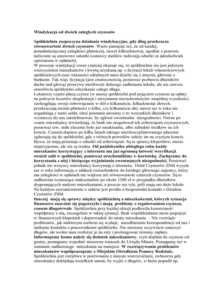 Windykacja od dwóch zaległych czynszów Spółdzielnia rozpoczyna działania windykacyjne, gdy dług przekracza równowartość dwóch czynszów. Warto pamiętać też, że od każdej, ponadmiesięcznej zaległości płatniczej, nawet kilkuzłotowej, zgodnie z prawem naliczane są ustawowe odsetki (ostawcy mediów naliczają odsetki za jakiekolwiek opóźnienia w opłatach). W procesie windykacji coraz częściej okazuje się, że spółdzielnia nie jest jedynym wierzycielem mieszkańców i kwotą uzyskaną np. z licytacji lokali własnościowych spółdzielczych oraz własności odrębnych musi dzielić się z innymi, głównie z bankami. Tak więc licytacja (jest ostatecznością, ponieważ pozbawia dłużników dachu nad głową) przerywa możliwość dalszego zadłużania lokalu, ale nie zawsze umożliwia spółdzielni odzyskanie całego długu. Lokatorzy często płacą czynsz (w naszej spółdzielni pod pojęciem czynszu są opłaty na pokrycie kosztów eksploatacji i utrzymania nieruchomości)w niepełnej wysokości, zaokrąglając swoje zobowiązanie w dół o kilkanaście, kilkadziesiąt złotych, przekraczają termin płatności o kilka, czy kilkanaście dni, nawet raz w roku nie uzgadniają z nami salda, choć pisemnie prosimy o to wszystkich dłużników i wystarczy do nas zatelefonować, by zgłosić ewentualne niezgodności. Nieraz po czasie mieszkańcy stwierdzają, że bank nie uregulował ich zobowiązań czynszowych, ponieważ tzw. stałe zlecenie było już nieaktualne, albo zabrakło środków na ich koncie. Czasem dopiero po kilku latach takiego niezdyscyplinowanego płacenia zgłaszają się do spółdzielni, gdy z różnych powodów zależy im na czystym koncie. Bywa, że mają pretensje o odsetki od zobowiązań. Są to sprawy kłopotliwe, nieraz nieprzyjemne, ale nie są trudne. Od października ubiegłego roku każdy mieszkaniec korzystający z internetu ma już ogromną łatwość weryfikacji swoich sald w spółdzielni, ponieważ uruchomiliśmy e–kartotekę. Zachęcamy do korzystania z niej i bieżącego wyjaśniania ewentuanych niezgodności. Ponieważ jednak nie wszyscy mieszkańcy korzystają z internetu, Dział Czynszów ZSM wysyła raz w roku informację o saldach rozrachunków do każdego głównego najemcy, który ma zaległości w opłatach nie większe niż równowartość czterech czynszów. Są to zadłużenia wynoszące maksymalnie po około 1200 zł w przypadku dłużników dysponujących małymi mieszkaniami, a jeszcze raz tyle, jeśli mają oni duże lokale. Na każdym zawiadomieniu o saldzie jest prośba o bezpośredni kontakt z Działem Czynszów ZSM. Inaczej mają się sprawy między spółdzielnią a mieszkańcami, których sytuacja finansowa znacznie się pogorszyła i mają problemy z regulowaniem czynszu, czasem długotrwałe. Spółdzielnia przy każdej okazji podkreśla konieczność współpracy z nią, szczególnie w takiej sytuacji. Brak współdziałania może pogrążyć w finansowych kłopotach i doprowadzić do utraty mieszkania. – Nie rozwiąże problemów, jak niektórym osobom się wydaje, nieodbieranie korespondencji od nas i unikanie kontaktu z pracownikami spółdzielni. Nie możemy oczywiście umorzyć długów, ale wolno nam rozłożyć je na raty i prolongować terminy zapłaty. Informujemy komu należy się dodatek mieszkaniowy, czyli dopłata do czynszu od gminy, pomagamy wypełnić stosowny wniosek do Urzędu Miasta. Pomagamy też w zamianie zadłużonego mieszkania na mniejsze. W rozwiązywaniu problemów mieszkańców współpracujemy z Miejskim Ośrodkiem Pomocy Rodzinie. Spółdzielnia jest cierpliwa w porównaniu z innymi wierzycielami, zwłaszcza gdy mieszkańcy dokładają wszelkich starań, by wyjść z długów, w które popadli np. z powodu utraty pracy, choroby, nieodpowiedzialnego gospodarowania pieniędzmi przez któregoś członka rodziny. – Pomagamy osobom, które nie chcą stracić mieszkania, spłacają dług, oszczędzając na różnych wydatkach, podejmują dodatkową pracę, bywa, że z pomocą finansową przychodzi im rodzina. Proces windykacyjny w Zabrzańskiej Spółdzielni Mieszkaniowej obejmuje szereg czynności, które mają doprowadzić właśnie do jak najszybszej współpracy z mieszkańcami w spłacie ich zobowiązań. Najwięcej osób zalega z zapłatą jednego czynszu. Czasami mały dług jest wynikiem opisywanego powyżej niezdyscyplinowania, a czasem zapowiedzią poważniejszych kłopotów. Ustalenie ze spółdzielnią dalszego postępowania jest szczególnie ważne wtedy, gdy ktoś nie może jednorazowo spłacić całego swojego zadłużenia. Taka osoba powinna jak najszybciej zgłosić się do Działu Windykacji ZSM w celu ustalenia ratalnej spłaty zaległych zobowiązań, odroczenia terminu płatności, wstrzymania skierowania sprawy na drogę postępowania sądowego. Za zaległości w opłatach na rzecz spółdzielni odpowiada posiadacz mieszkania, nawet wtedy, gdy w nim nie przebywa oraz wszystkie pełnoletnie osoby mieszkające w tym lokalu (art. 4 pkt 6 Ustawy o spółdzielniach mieszkaniowych). Do dłużników, którzy nie płacą i unikają kontaktu ze spółdzielnią wysyłane są wezwanie do zapłaty. Niektórzy zaczynają spłacać zadłużenie, nie kontaktując się z nami, inni nie reagują. Próbujemy nawiązać kontakt telefoniczny, robimy wywiad środowiskowy, by dowiedzieć się, czy przebywają w mieszkaniu, czy pracują. Jeśli nasze starania zmierzające do nawiązania kontaktu z dłużnikiem są nieskuteczne, to oddajemy sprawę do sądu, by uzyskać nakaz zapłaty. Przy braku dobrowolnej spłaty długu z sądowego nakazu zapłaty wyrok jest egzekwowany przez komornika. Dług powiększa się wtedy o koszty sądowe, adwokackie, komornicze. Inną formą odzyskiwania długów jest licytacja mieszkań. Dotyczy to lokali spółdzielczych własnościowych i własności odrębnej. Spółdzielnia stosuje ją w ostateczności, ponieważ mieszkańcy zlicytowanych 