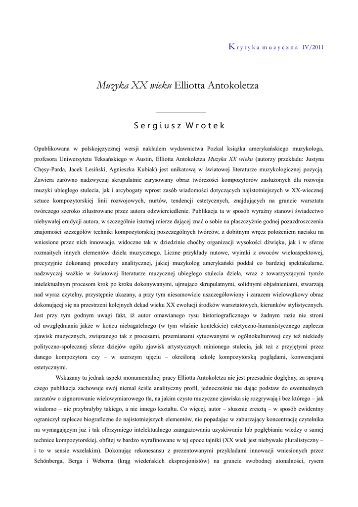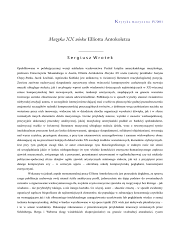 Krytyka m u z y c z n a IV/2011 Muzyka XX wieku Elliotta Antokoletza Sergiusz Wrotek Opublikowana w polskojęzycznej wersji nakładem wydawnictwa Pozkal książka amerykańskiego muzykologa, profesora Uniwersytetu Teksańskiego w Austin, Elliotta Antokoletza Muzyka XX wieku (autorzy przekładu: Justyna Chęsy-Parda, Jacek Lesiński, Agnieszka Kubiak) jest unikatową w światowej literaturze muzykologicznej pozycją. Zawiera zarówno nadzwyczaj skrupulatnie zarysowany obraz twórczości kompozytorów zasłużonych dla rozwoju muzyki ubiegłego stulecia, jak i arcybogaty wprost zasób wiadomości dotyczących najistotniejszych w XX-wiecznej sztuce kompozytorskiej linii rozwojowych, nurtów, tendencji estetycznych, znajdujących na gruncie warsztatu twórczego szeroko zilustrowane przez autora odzwierciedlenie. Publikacja ta w sposób wyraźny stanowi świadectwo niebywałej erudycji autora, w szczególnie istotnej mierze dającej znać o sobie na płaszczyźnie godnej pozazdroszczenia znajomości szczegółów techniki kompozytorskiej poszczególnych twórców, z dobitnym wręcz położeniem nacisku na wniesione przez nich innowacje, widoczne tak w dziedzinie choćby organizacji wysokości dźwięku, jak i w sferze rozmaitych innych elementów dzieła muzycznego. Liczne przykłady nutowe, wyimki z owoców wieloaspektowej, precyzyjnie dokonanej procedury analitycznej, jakiej muzykolog amerykański poddał co bardziej spektakularne, nadzwyczaj ważkie w światowej literaturze muzycznej ubiegłego stulecia dzieła, wraz z towarzyszącymi tymże intelektualnym procesom krok po kroku dokonywanymi, ujmująco skrupulatnymi, solidnymi objaśnieniami, stwarzają nad wyraz czytelny, przystępnie ukazany, a przy tym niesamowicie uszczegółowiony i zarazem wielowątkowy obraz dokonującej się na przestrzeni kolejnych dekad wieku XX ewolucji środków warsztatowych, kierunków stylistycznych. Jest przy tym godnym uwagi fakt, iż autor omawianego rysu historiograficznego w żadnym razie nie stroni od uwzględniania jakże w końcu niebagatelnego (w tym właśnie kontekście) estetyczno-humanistycznego zaplecza zjawisk muzycznych, związanego tak z procesami, przemianami sytuowanymi w ogólnokulturowej czy też niekiedy polityczno-społecznej sferze dziejów ogółu zjawisk artystycznych minionego stulecia, jak też z przyjętymi przez danego kompozytora czy – w szerszym ujęciu – określoną szkołę kompozytorską poglądami, konwencjami estetycznymi. Wskazany tu jednak aspekt monumentalnej pracy Elliotta Antokoletza nie jest przesadnie dogłębny, za sprawą czego publikacja zachowuje swój niemal ściśle analityczny profil, jednocześnie nie dając podstaw do ewentualnych zarzutów o zignorowanie wielowymiarowego tła, na jakim czysto muzyczne zjawiska się rozgrywają i bez którego – jak wiadomo – nie przybrałyby takiego, a nie innego kształtu. Co więcej, autor – słusznie zresztą – w sposób ewidentny ograniczył zaplecze biograficzne do najistotniejszych elementów, nie popadając w zaburzający koncentrację czytelnika na wymagającym już i tak olbrzymiego intelektualnego zaangażowania uzyskiwaniu lub pogłębianiu wiedzy o samej technice kompozytorskiej, obfitej w bardzo wyrafinowane w tej epoce tajniki (XX wiek jest niebywale pluralistyczny – i to w sensie wszelakim). Dokonując rekonesansu z prezentowanymi przykładami innowacji wniesionych przez Schӧnberga, Berga i Weberna (krąg wiedeńskich ekspresjonistów) na gruncie swobodnej atonalności, rysem Krytyka m u z y c z n a IV/2011 ilustrującym narodziny i szczegółowo scharakteryzowany na poziomie organizacji warsztatowej rozwój dodekafonii w kręgu wiedeńskim, jak i poza jego ramami (rozdziały kolejne), z indywidualnością twórczą Claude' a Debussy'ego, Maurice' a Ravela, Erika Satie, neoklasyków (ze Strawińskim, Bartókiem, Hindemithem na czele), dokonaniami twórców amerykańskich (Charles Ives, Henry Cowell, Leo Ornstein), radzieckich (Szostakowicz, Prokofiew), charakterystyką szkoły angielskiej, zasługami polskich twórców (Szymanowski) i wieloma innymi kierunkami, tendencjami, sylwetkami kompozytorów, jesteśmy pod wrażeniem olbrzymich ambicji intelektualnych autora, jego niesamowicie gruntownej, godnej pozazdroszczenia wiedzy. Trzeba przy tym podkreślić, iż ten właśnie skrupulatnie analityczny aspekt pracy w szczególnym stopniu decyduje o jej wartości. Zapoznawszy się z tą publikacją, nie byłem jednakże wolny od zastrzeżeń i wrażenia niedosytu, który szczególnie dokuczliwy okazał się być w kontekście rozdziałów poświęconych nurtom, stylom, zjawiskom zaistniałym w muzyce II połowy XX wieku. Przyglądając się już choćby czysto objętościowemu aspektowi tego niepokojącego stanu rzeczy, można odczuwać zdumienie uogólnieniami, jakie dają o sobie znać we wspomnianych częściach. Zwróćmy uwagę już choćby na sam fakt, iż w polskojęzycznej wersji książki omówienie tego, co wydarzyło się w muzyce od początku II połowy wieku XX, zajęło autorowi ponad 200 spośród wszystkich niespełna 670 stron. Fakt "wepchnięcia" kilku zjawisk zasługujących na osobne omówienie – aleatoryzm i forma otwarta, improwizacja oraz minimalizm – do jednego lapidarnego rozdziału wyśmienicie wprost ilustruje zaistniałą dysproporcję. Nurtu minimalistyczny przedstawiony został tu w sposób dalece uproszczony i oszczędny, przez to nieuwzględniający jego wielowątkowości. Uboga charakterystyka technik, ograniczenie się do kompozytorów kręgów amerykańskiego i anglosaskiego, nieuwzględnienie wkładu artystów z innych ośrodków (wspomnijmy choćby Polaków – Zygmunt Krauze, Tomasz Sikorski) widoczne w prezentacji zjawiska minimal music to nie jedyny przykład merytorycznego niedosytu. Wydaje się jednak, że tę „ograniczoność” tematyczną należy przypisać „amerykanizmowi” autora. Istnieje szereg innych zjawisk, jakie sprowadzone zostały do p