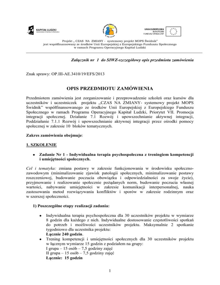 Projekt „ CZAS NA ZMIANY - systemowy projekt MOPS Świdnik” jest współfinansowany ze środków Unii Europejskiej z Europejskiego Funduszu Społecznego w ramach Programu Operacyjnego Kapitał Ludzki Załącznik nr 1 do SIWZ-szczegółowy opis przedmiotu zamówienia Znak sprawy: OP.III-AE.3410/19/EFS/2013 OPIS PRZEDMIOTU ZAMÓWIENIA Przedmiotem zamówienia jest zorganizowanie i przeprowadzenie szkoleń oraz kursów dla uczestników i uczestniczek projektu ,,CZAS NA ZMIANY- systemowy projekt MOPS Świdnik” współfinansowanego ze środków Unii Europejskiej z Europejskiego Funduszu Społecznego w ramach Programu Operacyjnego Kapitał Ludzki, Priorytet VII. Promocja integracji społecznej. Działanie 7.1 Rozwój i upowszechnianie aktywnej integracji, Poddziałanie 7.1.1 Rozwój i upowszechnianie aktywnej integracji przez ośrodki pomocy społecznej w zakresie 10 bloków tematycznych. Zakres zamówienia obejmuje: 1. SZKOLENIE Zadanie Nr 1 - Indywidualna terapia psychospołeczna z treningiem kompetencji i umiejętności społecznych. Cel i tematyka: zmiana postawy w zakresie funkcjonowania w środowisku społecznozawodowym (minimalizowanie zjawisk patologii społecznych, minimalizowanie postawy roszczeniowej, budowanie poczucia obowiązku i odpowiedzialności za swoje życie), przyjmowanie i realizowanie społecznie pożądanych norm, budowanie poczucia własnej wartości, nabywanie umiejętności w zakresie komunikacji interpersonalnej, nauka zastosowania metod rozwiązywania konfliktów i sporów w zakresie rodzinnym oraz w szerszej społeczności. 1) Poszczególne etapy realizacji zadania: Indywidualna terapia psychospołeczna dla 30 uczestników projektu w wymiarze 8 godzin dla każdego z nich. Indywidualne dostosowanie częstotliwości spotkań do potrzeb i możliwości uczestników projektu. Maksymalnie 2 spotkanie tygodniowo dla uczestnika projektu: Łącznie 240 godzin. Trening kompetencji i umiejętności społecznych dla 30 uczestników projektu w łącznym wymiarze 15 godzin z podziałem na grupy: I grupa – 15 osób – 7,5 godziny zajęć II grupa – 15 osób – 7,5 godziny zajęć Łącznie: 15 godzin 1 2) Częstotliwość spotkań dostosowana do potrzeb i możliwości uczestników i uczestniczek projektu. Maksymalnie 2 spotkania tygodniowo dla danej grupy. 3) Termin realizacji zadania nr 1: od dnia 22.07.2013r. – do dnia 22.10.2013r. 4) Miejsce realizacji: na terenie Świdnika 5) Koszt wykonania zadania obejmuje: wynagrodzenie terapeuty (psychologa lub pedagoga), wynajem sali (miejsce odbywania terapii – Świdnik), ubezpieczenie uczestników projektu, serwis kawowy, materiały dydaktyczne. 2. KURSY Nr Nazwa Zadania Zadania 2 Kosmetyczka z umiejętnością stylizacji paznokci i wizażem– kurs Liczba Liczba godzin kursu uczestników 250 5 Tematyka: zajęcia teoretyczne i praktyczne z zakresu materiałoznawstwa i technologii kosmetyki i pielęgnacji twarzy oraz ciała, manicure, pedicure, techniki zdobienia, przedłużania i modelowania paznokci z uwzględnieniem bezpieczeństwa i higieny pracy, kreowanie wizerunku. 3 Cukiernik z obsługą kasy fiskalnej - kurs 250 4 250 1 250 2 Tematyka: zajęcia teoretyczne i praktyczne z zakresu technologia żywienia, obsługa maszyn, urządzeń i sprzętu, wytwarzanie ciast, sporządzanie mas, kremów, deserów i innych półproduktów, techniki, montaż i dekoracja wyrobów ciastkarskich z uwzględnieniem bezpieczeństwa i higieny pracy. 4 Kucharz małej gastronomii – kurs Tematyka: zajęcia teoretyczne i praktyczne z zakresu gastronomii (w tym podstaw żywienia, technologii gastronomicznej, jakości i norm w zakresie obsługi gastronomicznej, minimum HACCAP), przyrządzania potraw, poznanie receptur, aranżacji. 5 Magazynier z obsługą wózka i kasy fiskalnej – kurs Tematyka: zajęcia teoretyczna i praktyczne z zakresu: budowa wózków jezdniowych, typy stosowanych wózków jezdniowych, czynności operatora przed podjęciem pracy i w czasie pracy , wiadomości z zakresu ładunkoznawstwa , 2 obsługa kasy fiskalnej, gospodarka magazynowa, wiadomości z zakresu BHP, praktyczna nauka jazdy wózkiem jezdniowym. 6 Kadry i płace – kurs 250 2 150 3 150 7 200 4 150 1 Tematyka: zajęcia teoretyczne i praktyczne z zakresu rachunkowości (aktywa-pasywa, prezentacja majątku w bilansie, operacje gospodarcze, dowody księgowe, księgi rachunkowe, ewidencja operacji bilansowych i wynikowych, kosztów i przychodów, rozrachunki, księgowość materiałowa i towarowa, aktywa trwałe, inwestycje i zobowiązania finansowe, fundusze własne, rezerwy, jednostkowe sprawozdania finansowe, prawo podatkowe – koordynacja, podatek od osób fizycznych, prawnych, towarów i usług, prawo pracy i ubezpieczeń społecznych. 7 Florysta z obsługą kasy fiskalnej i komputera – kurs Tematyka: zajęcia teoretyczne i praktyczne z zakresu materiałoznawstwa i technologii florystycznych (zasady kompozycji, botanika, materiał roślinny, układanie i dekoracje, florystyka okolicznościowa), obsługa komputera i kasy fiskalnej w związku z prowadzeniem działalności gospodarczej w tym komputerowych programów sprzedażowych. 8 Sprzedawca z obsługą kasy fiskalnej i komputera – kurs Tematyka: zajęcia teoretyczne i praktyczne z zakresu profesjonalnej sprzedaży i obsługi klienta, prowadzenie dokumentacji handlowej, rozpoznawanie znaków pieniężnych, obsługa kasy fiskalnej i komputera, obsługa programów sprzedażowych. 9 Operator koparko-ładowarki typ kl. III – kurs Tematyka: zajęcia teoretyczne i praktyczne użytkowanie eksploatacyjne, dokumentacja techniczna bezpieczeństwo i higiena pracy, podstawy elektrotechniki, silniki spalinoweelementy hydrauliki, budowa koparko – ładowarek, technologia robót, zajęcia praktyczne. 10 Ogrodnik – kurs Tematyka: zajęcia teoretyczne i praktyczne z zakresu przygotowanie gleby, nasadzenia, nawożenie, sadzenie, przycinanie drzew, krzewów, obsadzanie kwietników kwiatami rabatowymi, prace ogrodnicz