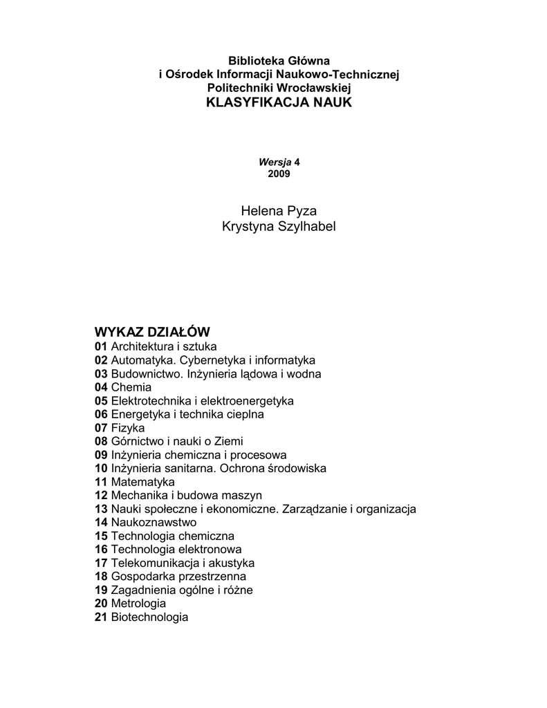 Biblioteka Główna i Ośrodek Informacji Naukowo-Technicznej Politechniki Wrocławskiej KLASYFIKACJA NAUK Wersja 4 2009 Helena Pyza Krystyna Szylhabel WYKAZ DZIAŁÓW 01 Architektura i sztuka 02 Automatyka. Cybernetyka i informatyka 03 Budownictwo. Inżynieria lądowa i wodna 04 Chemia 05 Elektrotechnika i elektroenergetyka 06 Energetyka i technika cieplna 07 Fizyka 08 Górnictwo i nauki o Ziemi 09 Inżynieria chemiczna i procesowa 10 Inżynieria sanitarna. Ochrona środowiska 11 Matematyka 12 Mechanika i budowa maszyn 13 Nauki społeczne i ekonomiczne. Zarządzanie i organizacja 14 Naukoznawstwo 15 Technologia chemiczna 16 Technologia elektronowa 17 Telekomunikacja i akustyka 18 Gospodarka przestrzenna 19 Zagadnienia ogólne i różne 20 Metrologia 21 Biotechnologia 01 ARCHITEKTURA I SZTUKA 0101 Architektura starożytna 0102 Architektura średniowieczna (III – XIV w.) 0103 Architektura nowożytna (XV – XVIII w.) 0104 Architektura nowoczesna 0105 Architektura wnętrz 0106 Sztuka starożytna 0107 Sztuka średniowieczna 0108 Sztuka nowożytna 0109 Sztuka nowoczesna 0110 Sztuka pierwotna i egzotyczna 0111 Teoria architektury, projektowanie architektoniczne 0112 Detale architektoniczne 0113 Architektura mieszkaniowa 0114 Architektura budowli przemysłowych 0115 Architektura i planowanie obiektów użyteczności publicznej - nauka i oświata (szkoły, przedszkola, biblioteki), - kultura (teatry, kina, sale widowiskowe, obiekty wystawiennicze, muzea, skanseny, - domy kultury) (zob. też 0120), - służba zdrowia (przychodnie, szpitale, żłobki, domy opieki), - sport (hale sportowe, baseny), - zieleń i wypoczynek (ogrody botaniczne, zoologiczne, tereny wystawowe), - turystyka (turystyczna i wczasowa baza noclegowa), - handel (sklepy, domy handlowe, hurtownie, kioski), - gastronomia (restauracje, kawiarnie, stołówki, bary), - rzemiosło (punkty usługowe i naprawcze), - łączność (poczty), - techniczne zaplecze komunikacji (stacje obsługi, stacje paliwowe, dworce kolejowe), - metro, zajezdnie tramwajowe, lotniska, miejsca parkowania), - administracja (biura, obiekty sądownictwa, organizacji społecznych, politycznych, twórczych), - obronność i bezpieczeństwo (strażnice pożarowe, więzienia), - pomniki, budowle sakralne i cmentarne (zob. też 0120) inne 0116 Mała architektura 0117 Architektura budynków wiejskich (zob. też 0307, 0509, 1805, 1809) - architektura regionalna 0118 Teoria sztuki. Style i kierunki 0119 Kultura i cywilizacja. Archeologia 0120 Zabytki architektury, sztuki i techniki. Konserwacja i ochrona zabytków 0121 Wzornictwo i formy przemysłowe. Sztuka użytkowa. Rzemiosło artystyczne 0122 Sztuka ludowa 0123 Architektura ekologiczna - architektura bioklimatyczna - architektura energooszczędna - domy ekologiczne 0124 Nowoczesne technologie informatyczne w architekturze 0125 Architektura militarna 0199 Opracowania ogólne 02 AUTOMATYKA. CYBERNETYKA I INFORMATYKA 0201 Teoria i systemy sterowania automatycznego 0202 Modelowanie matematyczne 0203 Elementy i urządzenia automatyki 0204 Automatyzacja procesów i urządzeń 0205 Telemechanika i transmisja danych. Systemy zintegrowane ISDN 0206 Cybernetyka. Identyfikacja, przetwarzanie i rozpoznawanie obiektów 0207 Bionika 0208 Teoria informacji 0209 Systemy i technologie informatyczne 0210 Teoria automatów i układów przełączających 0211 Języki i programowanie komputerów. Inżynieria oprogramowania 0212 Modelowanie analogowe 0213 Symulacja i modelowanie 0214 Teoria informatyki 0215 Urządzenia i układy cyfrowe. Urządzenia zewnętrzne komputerów 0216 Sieci komputerowe 0217 Teoria systemów 0218 Teoria niezawodności 0219 Lingwistyka matematyczna 0220 Metodologia i projektowanie wspomagane komputerowo. Systemy CAD/CAM, CASE 0221 Robotyka - teoria 0222 Sztuczna inteligencja i systemy ekspertowe 0223 Sieci neuronowe 0224 Grafika komputerowa. Przetwarzanie obrazów wizyjnych 0299 Opracowania ogólne 03 BUDOWNICTWO, INŻYNIERIA LĄDOWA I WODNA 0301 Mechanika budowli - statyka; stateczność; dynamika; wytrzymałość - teoria sprężystości - teoria plastyczności - reologia 0302 Teoria konstrukcji i elementów budowlanych 0303 Konstrukcje betonowe i żelbetowe 0304 Konstrukcje metalowe 0305 Konstrukcje murowe i kamienne 0306 Konstrukcje drewniane 0307 Projektowanie budowlane 0308 Materiały budowlane 0309 Instalacje budowlane - instalacje elektroenergetyczne (zob. też 1005 i 1006) - instalacje wodno-kanalizacyjne (zob. też 1005 i 1006) - instalacje klimatyzacyjne i wentylacyjne (zob. też 1007 i 1008) - instalacje oświetleniowe (zob. też 1007 i 1008) - instalacje gazowe (zob. też 1007 i 1008) - instalacje grzewcze (zob. też 1007 i 1008) - instalacje łączności: fax, telefon, telewizja (zob. też 1007 i 1008) 0310 Komunikacja lądowa, wodna, powietrzna. Inżynieria ruchu 0311 Inżynieria miejska 0312 Procesy budowlane i inżynieryjne 0313 Maszyny budowlane i drogowe 0314 Geotechnika 0315 Budownictwo podziemne 0316 Geodezja i miernictwo budowlane 0317 Fizyka budowli 0318 Budownictwo wodne. Hydrotechnika 0319 Ekologia w budownictwie 0320 Zastosowanie komputerów w budownictwie 0321 Badania materiałów i elementów konstrukcyjnych 0399 Opracowania ogólne 04 CHEMIA 0401 Fizykochemia faz - równowagi fazowe - równowagi chemiczne - roztwory 0402 Spektroskopia 0403 Chemia fizyczna 0404 Chemia nieorganiczna - chemia koordynacyjna, związki kompleksowe - chemia pierwiastków rzadkich - metale, stopy i związki międz6ymetaliczne - chemia bionieorganiczna - teoretyczna chemia nieorganiczna - wiązania chemiczne 0405 Chemia organiczna - związki metaloorganiczne metaloidoorganiczne - związki organiczne naturalne - stereochemia 0406 Chemia analityczna - przygotowanie prób i standardy - analiza klasyczna, membrany, elektrody jonoselektywne - analiza instrumentalna, metody fizykochemiczne - metody matematyczne w chemii - metody komputerowe w chemii - chemometria 0407 Synteza nieorganiczna 0408 Synteza organicz