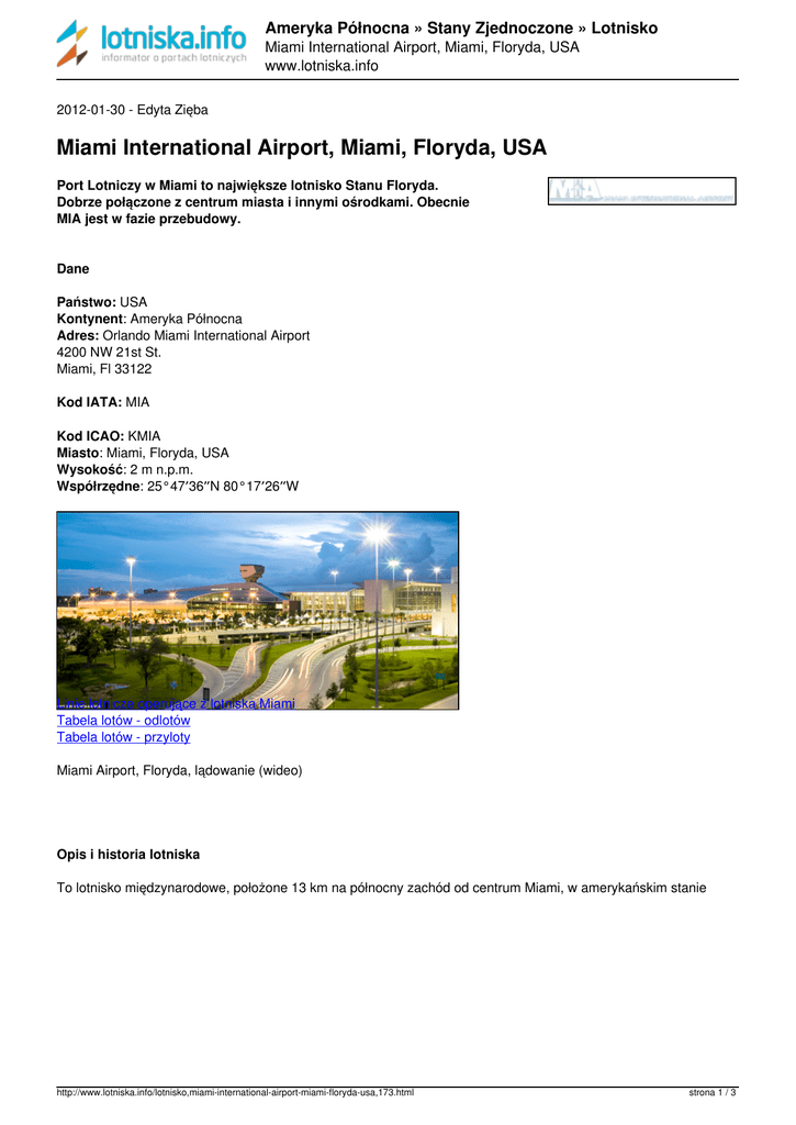 Ameryka Północna » Stany Zjednoczone » Lotnisko Miami International Airport, Miami, Floryda, USA www.lotniska.info 2012-01-30 - Edyta Zięba Miami International Airport, Miami, Floryda, USA Port Lotniczy w Miami to największe lotnisko Stanu Floryda. Dobrze połączone z centrum miasta i innymi ośrodkami. Obecnie MIA jest w fazie przebudowy. Dane Państwo: USA Kontynent: Ameryka Północna Adres: Orlando Miami International Airport 4200 NW 21st St. Miami, Fl 33122 Kod IATA: MIA Kod ICAO: KMIA Miasto: Miami, Floryda, USA Wysokość: 2 m n.p.m. Współrzędne: 25°47′36″N 80°17′26″W Linie lotnicze operujące z lotniska Miami Tabela lotów - odlotów Tabela lotów - przyloty Miami Airport, Floryda, lądowanie (wideo) Opis i historia lotniska To lotnisko międzynarodowe, położone 13 km na północny zachód od centrum Miami, w amerykańskim stanie http://www.lotniska.info/lotnisko,miami-international-airport-miami-floryda-usa,173.html strona 1 / 3 Ameryka Północna » Stany Zjednoczone » Lotnisko Miami International Airport, Miami, Floryda, USA www.lotniska.info Floryda. Założony w 1928 roku jako Pan American Field w 1945 r. zmienił nazwę na 36th Street Airport. W 1959 stary terminal na 36th Street został zamknięty. Dziś lotnisko funkcjonuje pod nazwą Miami International Airport. Jest jednym z wiodących międzynarodowych portów lotniczych w przewozach pasażerskich i towarowych na świecie. Port Lotniczy Miami plasuje się na trzecim miejscu pod względem ilości międzynarodowych połączeń wśród amerykańskich lotnisk, po porcie JFK w Nowym Jorku i porcie LAX w Los Angeles i głównym lotniskiem międzynarodowego ruchu o dalekim zasięgu dla Florydy południowej. Mimo to większość krajowych i tanich przewoźników woli korzystać z dwu pobliskich lotnisk: portu lotniczego Fort Lauderdale/Hollywood i portu lotniczego Palm Beach, które wymagają znacznie mniejszych opłat lotniskowych od linii lotniczych. Miami International Airport (MIA) jest obsługiwany przez Wydział Lotnictwa Miami-Dade i jest własnością zarządu okręgu Miami-Dade. Lotnisko w liczbach MIA w 2006 obsłużył 32 533 974 pasażerów. Rocznie obsługuje ponad 34 milionów pasażerów. Sprawdź pełne statystyki i rankingi za 2010 r. Lotnisko zajmuje około 3230 akrów ziemi w pobliżu centrum Miami. MIA obecnie przechodzi przebudowę terminalu pasażerskiego jest on rozszerzany na około siedem milionów metrów kwadratowych. Termin zakończenia inwestycji jest wyznaczony na 2012 rok. Port posiada 4 drogi startowe, w tym 3 ułożone równolegle do siebie. Dojazd Komunikacja miejska, Miami-Dade Transit, obsługuje port lotniczy Miami autobusami Metro Bus na trasach (numer) 7, 37, 42, 57, 133, 236, 238, i J; bezpłatny przejazd jest również udostępniony pomiędzy terminalem a stacjami kolei dojazdowej Tri-Rail (Miami Airport Station) i Hialeah Market Station. Obie stacje są ulokowane blisko portu: czas przejazdu wynosi 5 minut samochodem. http://www.lotniska.info/lotnisko,miami-international-airport-miami-floryda-usa,173.html strona 2 / 3 Ameryka Północna » Stany Zjednoczone » Lotnisko Miami International Airport, Miami, Floryda, USA www.lotniska.info Miami-Date Transit planuje dodatkową obsługę portu zautomatyzowanym wagonowym systemem transportowym typu people mover z przyszłego dworca komunikacyjnego Miami Intermodal Center, który udostępni kolej Metrorail i przyszły serwis BayLink szynobusem do South Beach. (Skromniejszy przykład takiego people movera już działa w obrębie terminala pasażerskiego, łącząc wolno stojący segment Pirsu E z jego przyległą resztą.) Typowy koszt przejazdu do centrum miasta: • Super Shuttle: koszt 9 USD. • Metro Bus 1,50 USD (0,75 ulgowy), (ok. 35-40 minut) • Taksówką: koszt 15,50 USD, (ok. 20 minut). Źródło: (Wikipedia, MIA)http://www.lotniska.info/lotnisko,miami-international-airport-miami-floryda-usa,173.html http://www.lotniska.info/lotnisko,miami-international-airport-miami-floryda-usa,173.html Powered by TCPDF (www.tcpdf.org) strona 3 / 3
