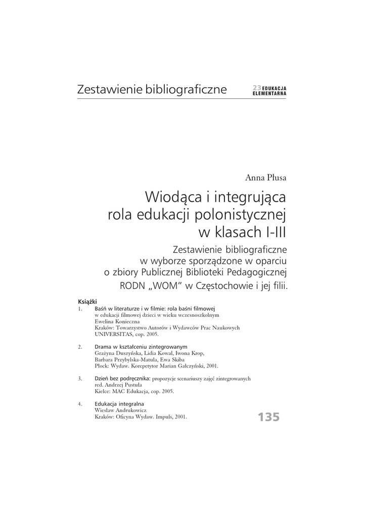 Zestawienie bibliograficzne Anna Płusa Wiodąca i integrująca rola edukacji polonistycznej w klasach I-III Zestawienie bibliograficzne w wyborze sporządzone w oparciu o zbiory Publicznej Biblioteki Pedagogicznej RODN „WOM” w Częstochowie i jej filii. Książki 1. Baśń w literaturze i w filmie: rola baśni filmowej w edukacji filmowej dzieci w wieku wczesnoszkolnym Ewelina Konieczna Kraków: Towarzystwo Autorów i Wydawców Prac Naukowych UNIVERSITAS, cop. 2005. 2. Drama w kształceniu zintegrowanym Grażyna Duszyńska, Lidia Kowal, Iwona Krop, Barbara Przybylska-Matula, Ewa Skiba Płock: Wydaw. Korepetytor Marian Gałczyński, 2001. 3. Dzień bez podręcznika: propozycje scenariuszy zajęć zintegrowanych red. Andrzej Pustuła Kielce: MAC Edukacja, cop. 2005. 4. Edukacja integralna Wiesław Andrukowicz Kraków: Oficyna Wydaw. Impuls, 2001. 135 Zestawienie bibliograficzne 136 5. Humanistyczne ścieżki edukacyjne: scenariusze, plany, konspekty, ćwiczenia, propozycje red. Halina Wiśniewska, Leszek Tymiakin Uniwersytet Marii Curie-Skłodowskiej. Instytut Filologii Polskiej. Zakład Metodyki Nauczania Literatury i Języka Polskiego Lublin: Wydaw. Norbertinum, 2000. 6. Idea integracji a wychowanie: ku pedagogice integralnej red. Bogusława Jodłowska Gliwice: Kolegium Nauczycielskie Kraków: Oficyna Wydaw. Impuls, 2004. 7. Inspiracje czterech pór roku Teresa Wit Częstochowa: Regionalny Ośrodek Doskonalenia Nauczycieli WOM, 2006. 8. Integracyjny rozkład materiału nauczania dla klasy I: edukacja polonistyczna, matematyczna, środowiskowa, muzyczno-ruchowa, estetyczno-manualna Elżbieta Purzycka, Maria Selke, Lilianna Smętek, Małgorzata Smentek Gdańsk: Wydaw. HARMONIA, 1998. 9. Jak latać bez skrzydeł: sprawdzone pomysły na udane zajęcia edukacyjne Marzena Kędra Kraków: Oficyna Wydaw. Impuls, 2004. 10. Nauczanie blokowe i zintegrowane w praktyce szkolnej red. nauk. Tadeusz Srogosz, Beata Urbanowicz Wyższa Szkoła Pedagogiczna w Częstochowie. Wydział Filologiczno-Historyczny. Instytut Historii Częstochowa: Wydaw. Wyższej Szkoły Pedagogicznej, 2003. 11. Nauczyciel i uczeń w edukacji zintegrowanej w klasach I-III red. Irena Adamek Kraków: Wydaw. Naukowe Akademii Pedagogicznej, 2002. 12. Od Celestyna Freineta do edukacji zintegrowanej: w poszukiwaniu modelu wczesnej edukacji, czyli o tym jak organizować sytuacje edukacyjne wyzwalające aktywność własną dziecka Ewa Filipiak, Halina Smolińska-Rębas Bydgoszcz: Wydaw. Uczelniane WSP, 2000. 13. Praktyczny poradnik nauczania integracyjnego: skarbnica wiadomości teoretycznych, metod i zabaw Charmaine Liebertz; tł. Magdalena Jałowiec Kielce: Wydaw. JEDNOŚĆ, 2003. 14. Projektowanie i modelowanie edukacji zintegrowanej red. Irena Adamek Kraków: Wydaw. Naukowe Akademii Pedagogicznej, 2002. 15. Scenariusze do nauczania zintegrowanego zbiór i oprac. Bożena Toll. Blachownia: [b.w.], 2001. 16. Spróbujmy mówić razem: program profilaktyki logopedycznej (dla przedszkoli, klas kształcenia zintegrowanego i integracyjnego) Bożena Dittfeld Kraków: Oficyna Wydaw. Impuls, 2004. 17. Uczyć ciekawiej, to znaczy jak?: nauczanie zintegrowane – scenariusze zajęć metodami aktywizującymi Alicja Nehring, Lidia Sawicka, Anna Szelągowska-Strzyga Toruń: Wydaw. Aksjomat, 2002. 18. W nauczaniu początkowym inaczej: scenariusze lekcji Dorota Klus-Stańska Wyd. 2. Kraków: Oficyna Wydaw. Impuls, 2003. 19. Z działalności innowacyjnej nauczycieli klas młodszych: sylwetki pedagogów wczesnoszkolnych – innowatorów z Bydgoszczy i byłego województwa bydgoskiego Elżbieta Szefler, Maria Sobieszczyk Wyższa Szkoła Pedagogiczna w Bydgoszczy. Bydgoszcz: Wydaw. Uczelniane WSP, 2000. 20. Zintegrowana edukacja wczesnoszkolna: klasy 1-3 oprac. Jadwiga Hanisz koordynator prac programowych Jadwiga Stankiewicz Warszawa: Wydaw. Szkolne i Pedagogiczne, 1998. 21. Zintegrowane zadania w edukacji wczesnoszkolnej Agnieszka Nowak-Łojewska Uniwersytet Zielonogórski w Zielonej Górze Kraków: Oficyna Wydaw. Impuls, 2004. 137 Zestawienie bibliograficzne Artykuły z czasopism 138 1. Aktywnie i pracowicie, czyli o wykorzystywaniu aktywnych metod w szkolnej pracy z dziećmi Tatiana Grabowska „Wychowanie na co Dzień” 2010, nr 9, dod. s. I-VI. 2. Aktywność twórcza i metody aktywizujace dzieci w nauczaniu zintegrowanym Małgorzata Banaś, Aneta Kaczmarek „Częstochowski Biuletyn Oświatowy” 2002, nr 3, s. 49-51. 3. Czy trzecioklasiści mogą pisać książki? Irena Nałęcka „Biblioteka w Szkole” 2008, nr 2, s. 16-17. 4. Drama = ciekawość – działanie – odkrycie Aleksandra Raźniak „Edukacja Elementarna w Teorii i Praktyce” 2007, nr 4, s. 89-102 „Drama w nauczaniu języków obcych”. 5. Dylematy kształcenia zintegrowanego Małgorzata Żytko „Nowa Szkoła” 2001, nr 9, s. 21-27. 6. Edukacja teatralna w mojej szkole Elżbieta Kobylańska „Częstochowski Biuletyn Oświatowy” 2004, nr 4, s. 43-48. 7. Efektywność kształcenia zintegrowanego w świetle badań: (na podstawie literatury przedmiotu) Iwona Borawska „Edukacja” 2007, nr 4, s. 47-67. 8. Integracja – nowość w edukacji? oprac. Małgorzata Nowak „Nowa Szkoła” 2001, nr 9, s. 29-34. 9. Integracja dzieci o specjalnych potrzebach w kształceniu zintegrowanym Anna Tomaszewska „Nauczanie Początkowe” 2003/2004, nr 1, s. 30-31. 10. Integracja międzyprzedmiotowa w nowym systemie edukacji Elżbieta Wójcicka „Biblioteka w Szkole” 1999, nr 11, s. 1-4. 11. Integracja międzyprzedmiotowa w praktyce szkolnej Teresa Durda „Nowa Szkoła” 2001, nr 9, s. 35-38. 12. Integracja międzyprzedmiotowa w procesie kształcenia i wychowania do zdrowia uczniów klasy I szkoły podstawowej Elżbieta Szymańska, Adam Jurczyk „Lider” 1993, nr 2, s. 15. 13. Istota integralnej edukacji wczesnoszkolnej Lucyna Belka-Sendłak „Lider” 2001, nr 9, s. 12-13. 14. Jak powstaje film?: ćwiczenia utrwalające dla klasy III szkoły podstawowej Beata Rechnio „Wszystko