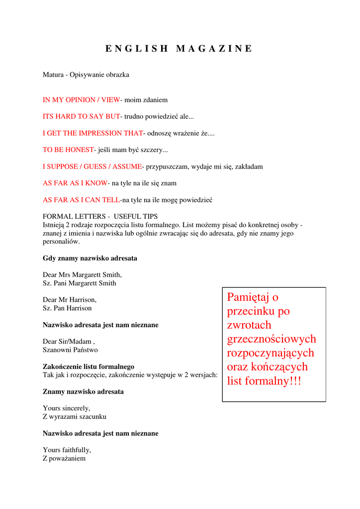 ENGLISH MAGAZINE Matura - Opisywanie obrazka IN MY OPINION / VIEW- moim zdaniem ITS HARD TO SAY BUT- trudno powiedzieć ale... I GET THE IMPRESSION THAT- odnoszę wrażenie że.... TO BE HONEST- jeśli mam być szczery... I SUPPOSE / GUESS / ASSUME- przypuszczam, wydaje mi się, zakładam AS FAR AS I KNOW- na tyle na ile się znam AS FAR AS I CAN TELL-na tyle na ile mogę powiedzieć FORMAL LETTERS - USEFUL TIPS Istnieją 2 rodzaje rozpoczęcia listu formalnego. List możemy pisać do konkretnej osoby znanej z imienia i nazwiska lub ogólnie zwracając się do adresata, gdy nie znamy jego personaliów. Gdy znamy nazwisko adresata Dear Mrs Margarett Smith, Sz. Pani Margarett Smith Dear Mr Harrison, Sz. Pan Harrison Nazwisko adresata jest nam nieznane Dear Sir/Madam , Szanowni Państwo Zakończenie listu formalnego Tak jak i rozpoczęcie, zakończenie występuje w 2 wersjach: Znamy nazwisko adresata Yours sincerely, Z wyrazami szacunku Nazwisko adresata jest nam nieznane Yours faithfully, Z poważaniem Pamiętaj o przecinku po zwrotach grzecznościowych rozpoczynających oraz kończących list formalny!!!